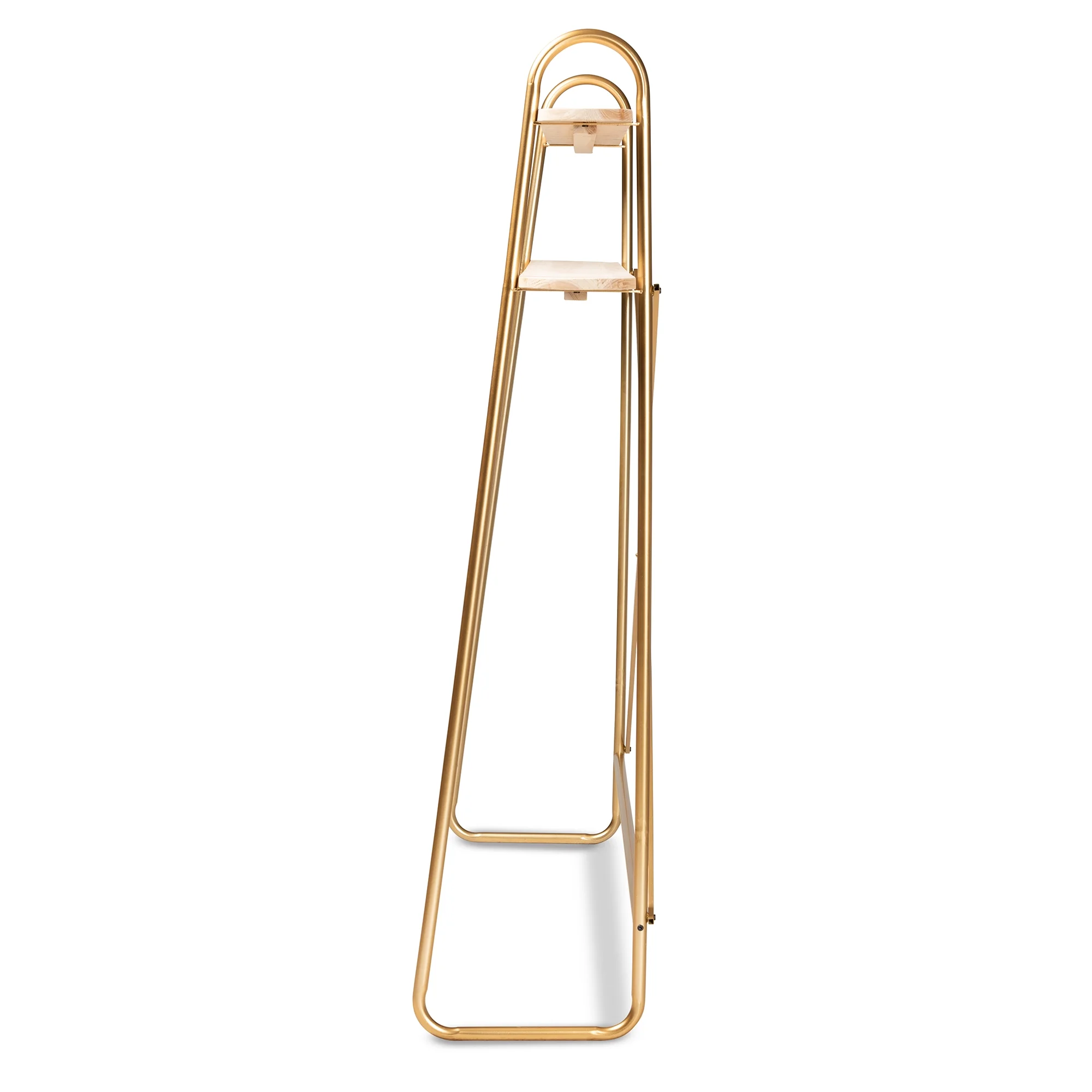 • Constructed from metal and firwood• Gold finished frame• Natural finished wood• Two (2) shelves• Crisscross support bars• Assembly required• Made in China• Product Weight: 29.8 Pound• Package Weight: 34.2 Pound• Dimensions: 68″ High x 78″ Wide x 16″ Deep; Upper Shelf: 78″ Wide x 6.3″Deep; Lower Shelf: 6.1″High x 78″ Wide x 8″ Deep; Legs: 51.7″ High;• Product Color: Natural/Gold• Product Composition: Firwood/Metal