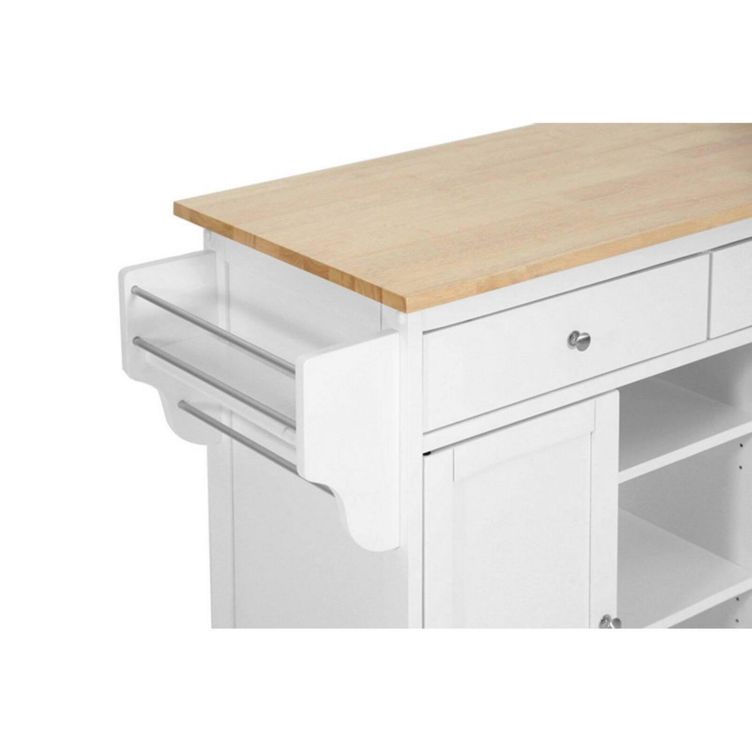 It is only appropriate for the distinctive chef to have a distinctive kitchen. To help you along in your quest for culinary excellence in your own home, we offer the versatile Meryland Kitchen Cart. This is a beautifully built kitchen island for the modern kitchen that includes drawers, cabinets, shelves, and racks to keep all the essentials at your fingertips. The unit is constructed with a medium-density fiberboard frame that has rubber wood veneer. The base is finished in a white lacquer and the countertop has a light wood stain for a country cottage-inspired design. Finishing touches include lockable wheels and silver drawer pulls. Assembly is required. To clean, wipe with a dry cloth. Made in Malaysia.