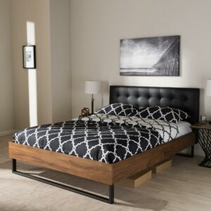Baxton Studio Mitchell Rustic Industrial Walnut Wood Black Faux Leather Dark Bronze Metal King Size Platform Bed