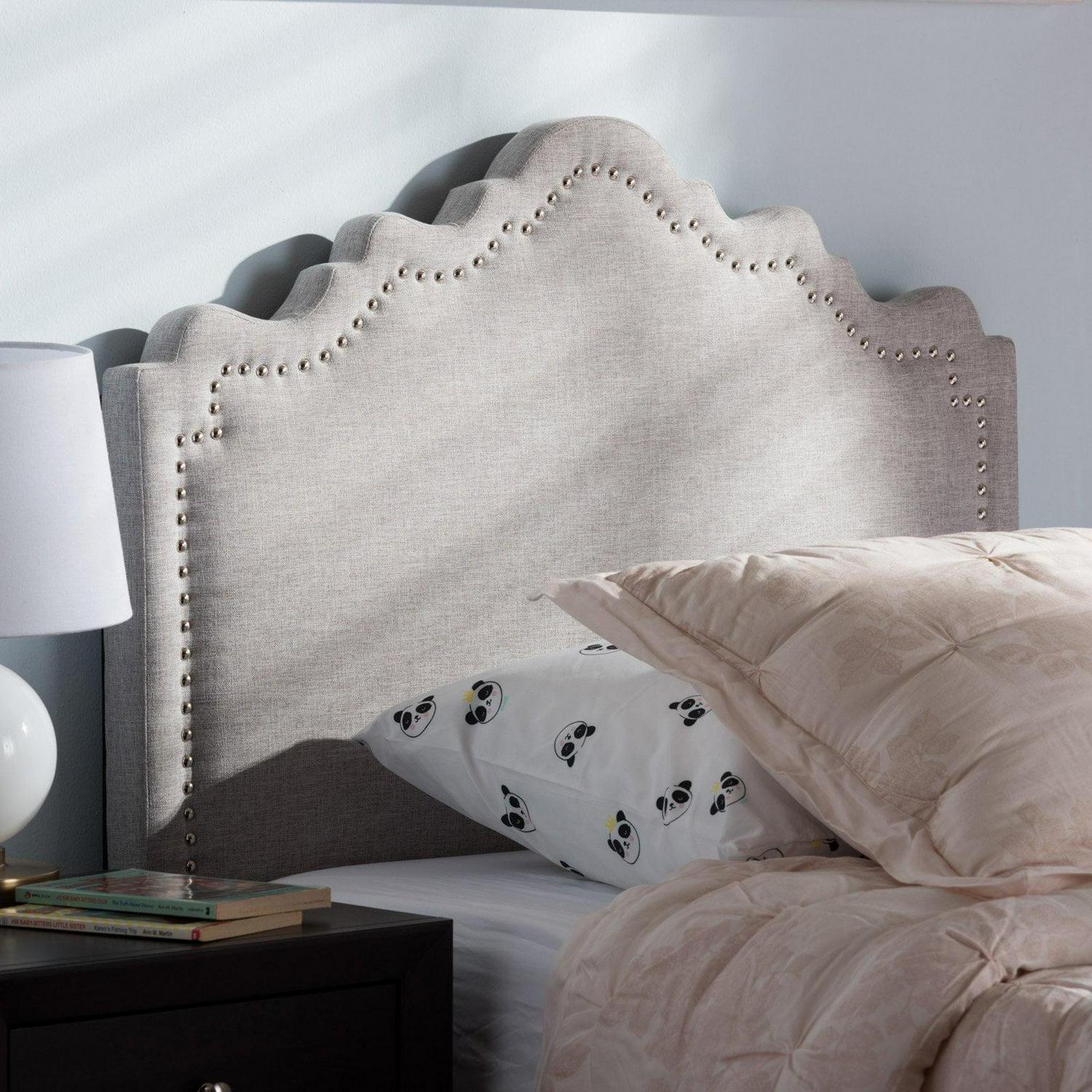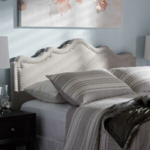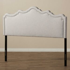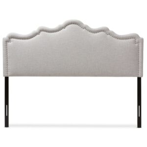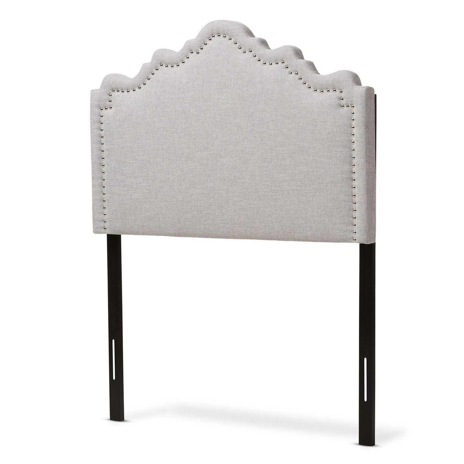 Baxton Studio Nadeen Modern and Contemporary Greyish Beige Fabric Twin Size Headboard,Wholesale Interiors Complete your bedroom interior with the Nadeen fabric upholstered headboard. Constructed of solid rubberwood and MDF, the Nadeen twin size headboard is upholstered in durable greyish beige polyester fabric. Featuring curvaceous design with silver nail heads trim for a glamour look, the Nadeen offers a touch of modern sophistication. Mounting wood post is made from quality rubberwood for stability and strength. The wood posts, featuring 5-level adjustable to the headboard and 2-level adjustable to the bed frame provide more flexibility for you to configure the height of your bed. Traditional adjustable metal bed frame such as Leggett and Platt bed frame will work well with the headboard. Cushioned headboard provides softness and shape, allowing you to rest comfortably. Made in Malaysia, the Nadeen requires assembly.