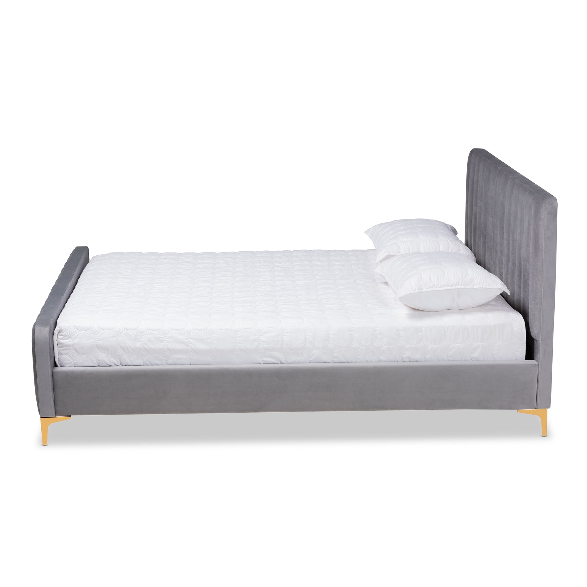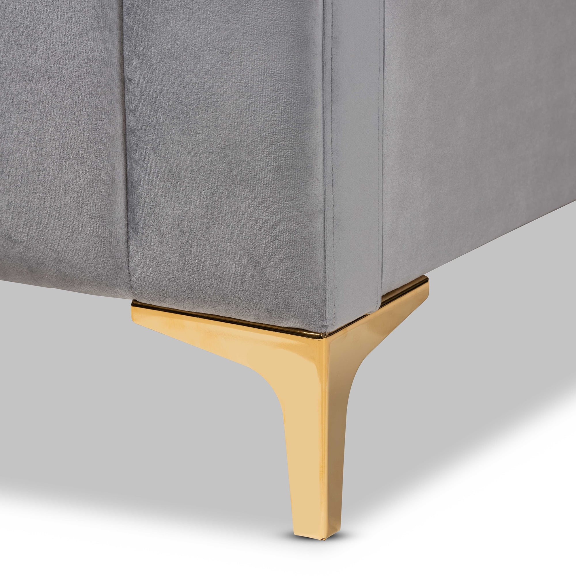 • Constructed from metal and engineered wood• Upholstered in velvet polyester fabric and padded with foam• Channel tufted• Wood slats eliminate the need for a box spring• Gold finished legs• Assembly required• Made in Malaysia• Product Weight: 86 Pound• Package Weight: 101.4 Pound• Overall Dimensions: 40.9″ High(from floor to top of headbord) x 80.7″ Wide x 86.6″ Deep; Headboard: 35.6″ Wide x 80.7″ Long x 3.5″ Deep; Headboard Thickness: 3.5″ Thick; Distance between slats: 2.8″; Height from floor to top of slat: 9.4″ High; Legs: 5.3″ High;• Product Color: Light grey/Gold• Product Composition: Fabric Polyester 100%/MDF/Foam/Metal