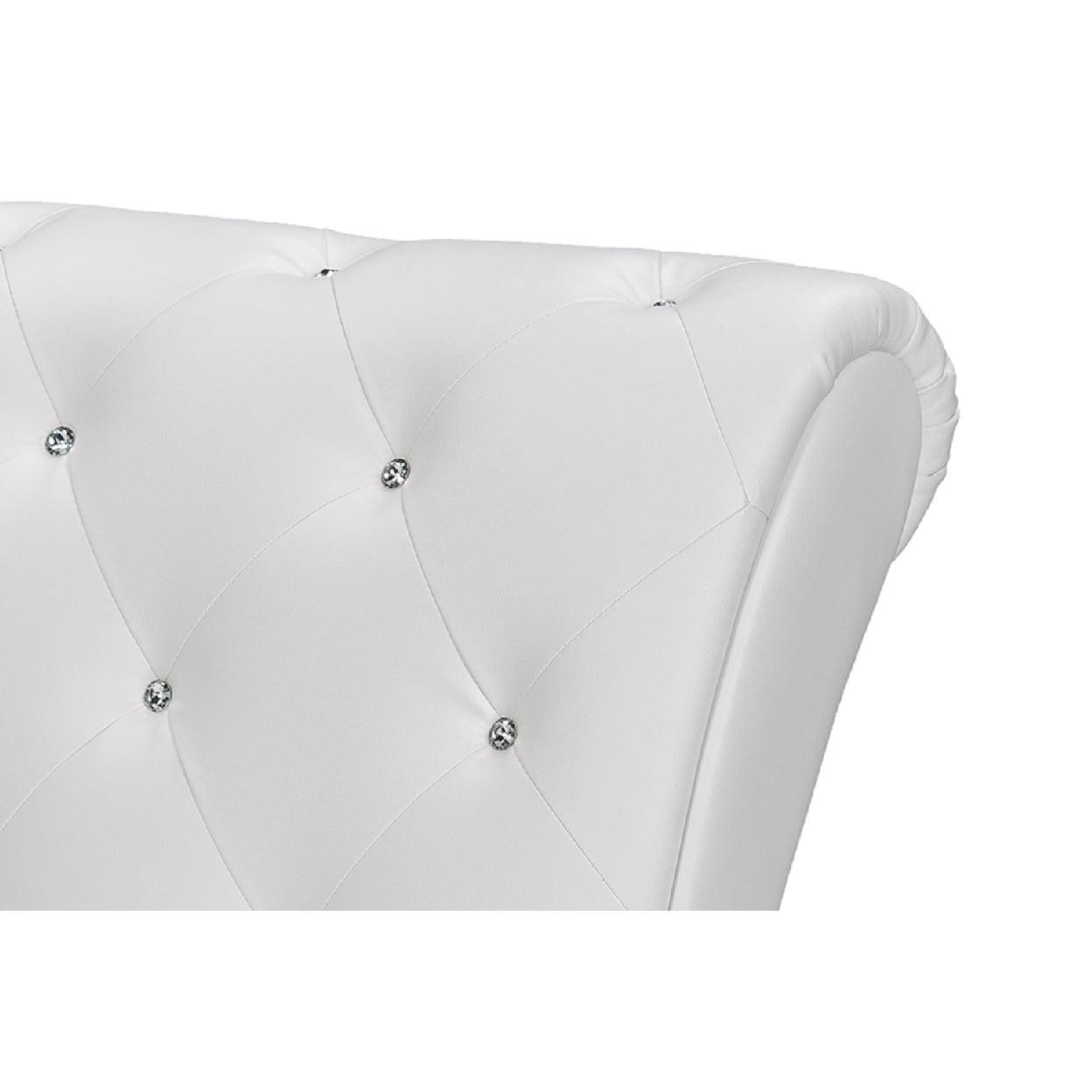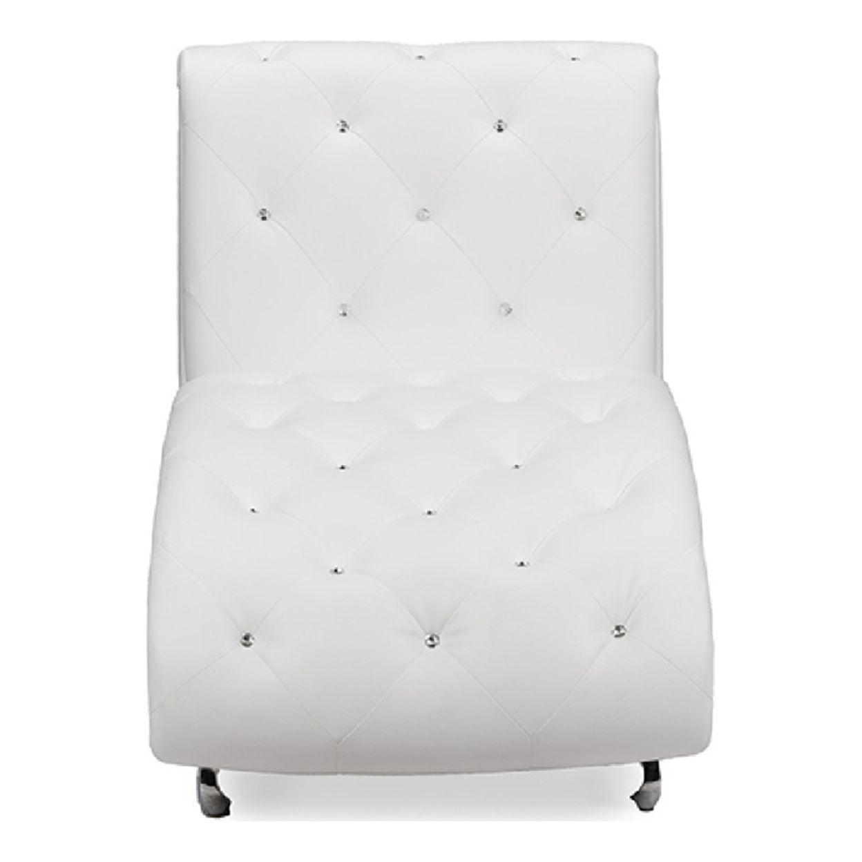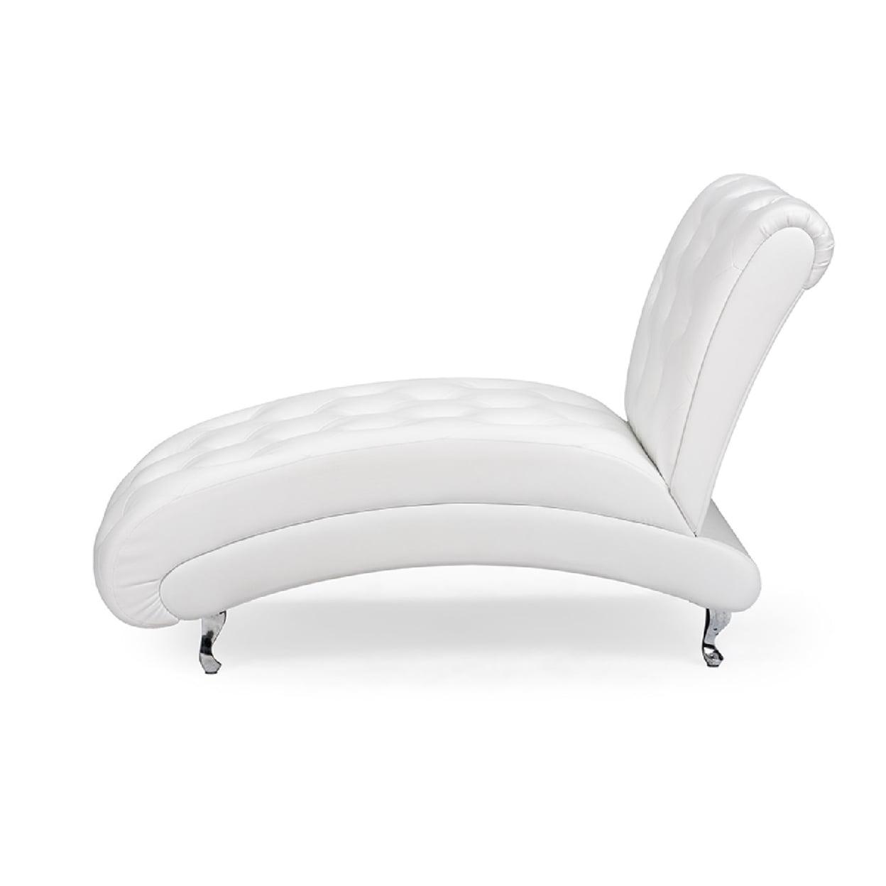 Baxton Studio Pease Contemporary White Faux Leather Upholstered Crystal Button Tufted Chaise Lounge Extend your legs in comfort on this elegant chaise lounge. This Pease cotemporary white leather upholstered and crystal tufted chaise lounge features white faux leather upholstery and faux crystal buttons tufting that lends itself well to a variety of decor.