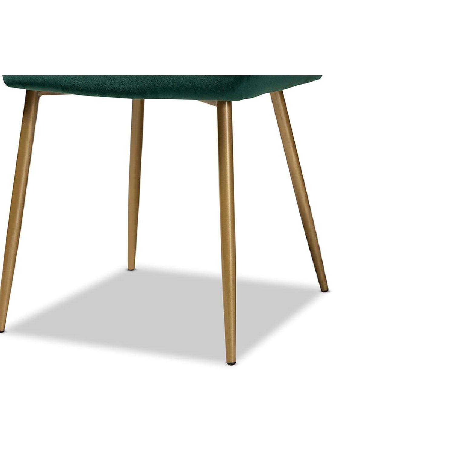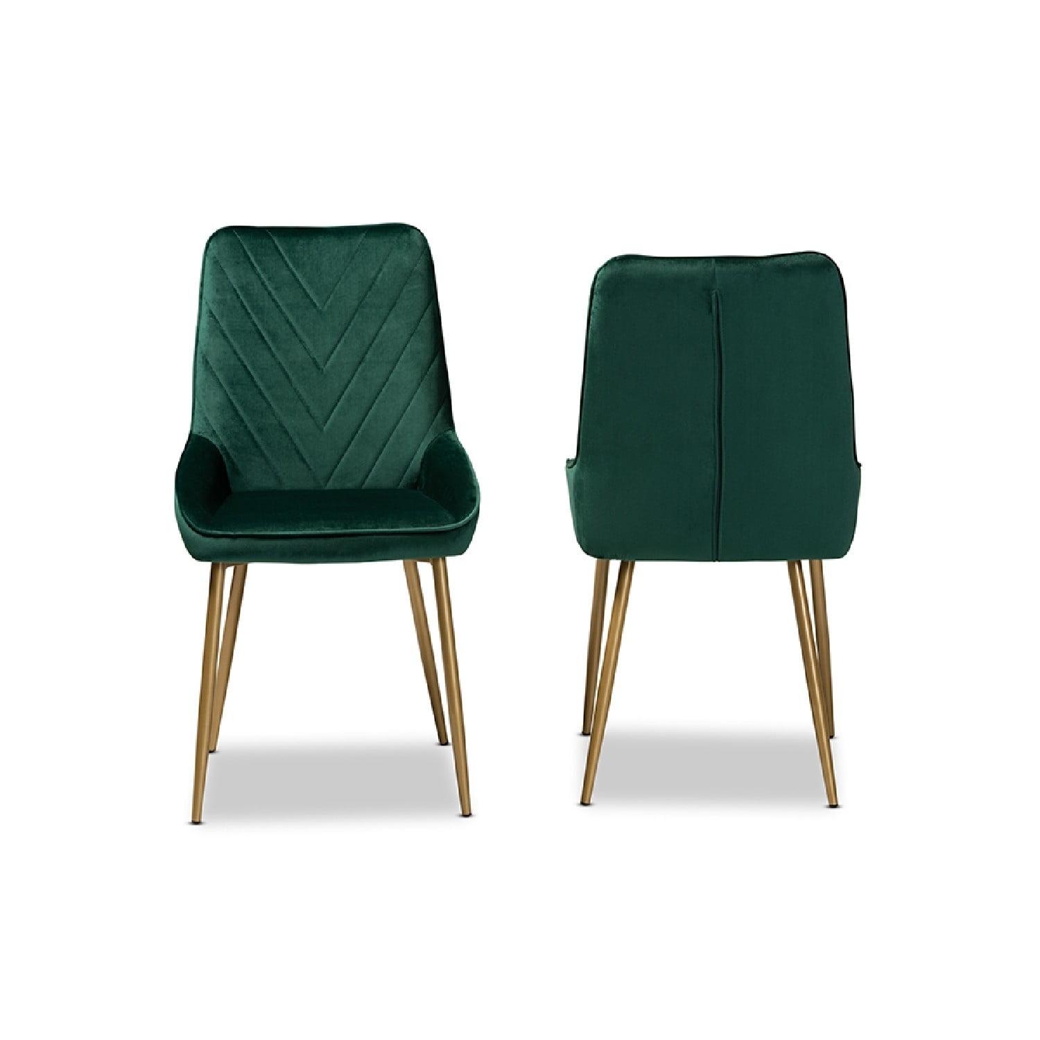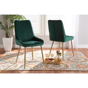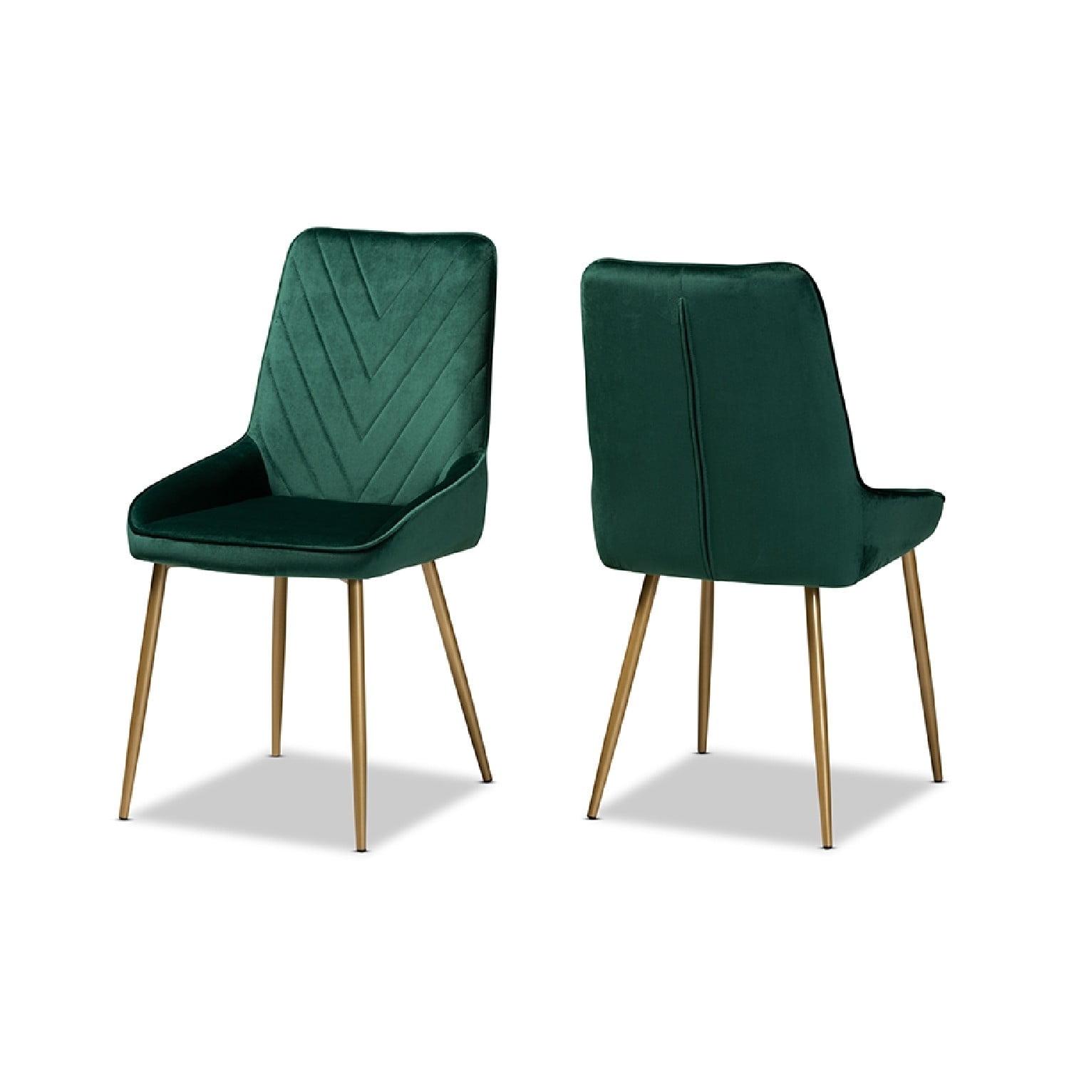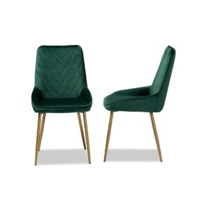 Baxton Studio Priscilla Contemporary Glam and Luxe Green Velvet Fabric Upholstered and Gold Finished Metal 2-Piece Give your dining room a luxurious makeover with the stunning Priscilla dining chair. Made in China, this chair is comprised of a strong metal and wood frame padded with plush foam and upholstered in luscious velvet fabric. Angular stitching creates a geometric display that highlights the rich hues of the velvet. Requiring assembly, the Priscilla utilizes angled, gold finished metal legs for stable support that exudes modern glamour. With a sleek outline that radiates modern opulence, the Priscilla dining chair transforms every meal into a lavish occasion.
