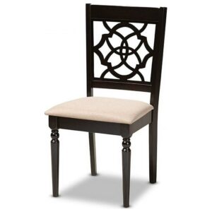 Baxton Studio Renaud Modern and Contemporary Sand Fabric Upholstered Espresso Brown Finished 5-Piece Wood Dining Set Elegant design marries quality craftsmanship in the Renaud 5-piece dining set. Constructed from solid oak wood, this dining set includes one table and four chairs, each upholstered in a light polyester fabric that complements the rich espresso wood finish. Designed with both comfort and style in mind, each chair features a plush foam-padded seat, as well as an exquisite cut-out design on its back. Turned legs add a classic, refined touch. Whether used for chic dinner parties or casual family dinners, the Renaud dining set is sure to elevate any dining experience. The Renaud 5-piece dining set is made in Malaysia and requires assembly.