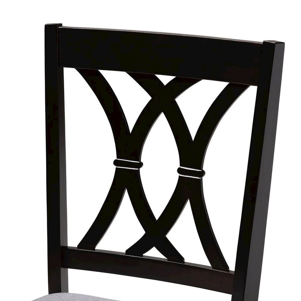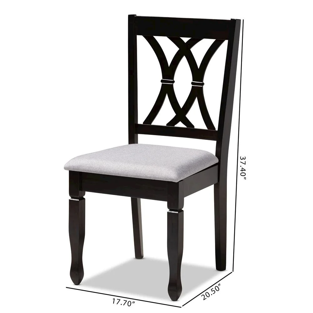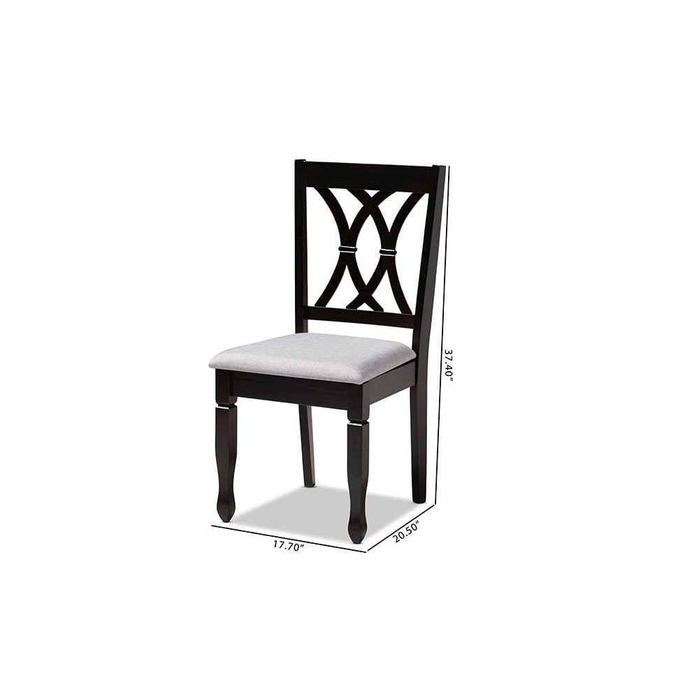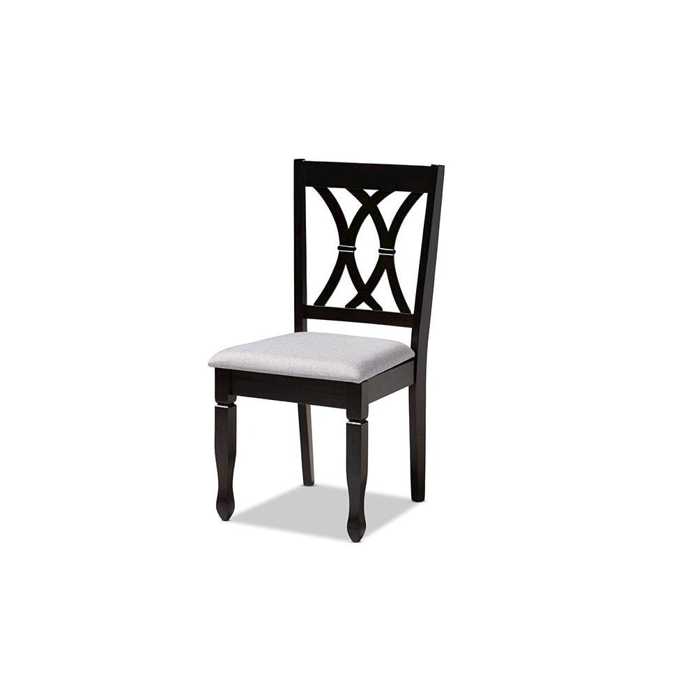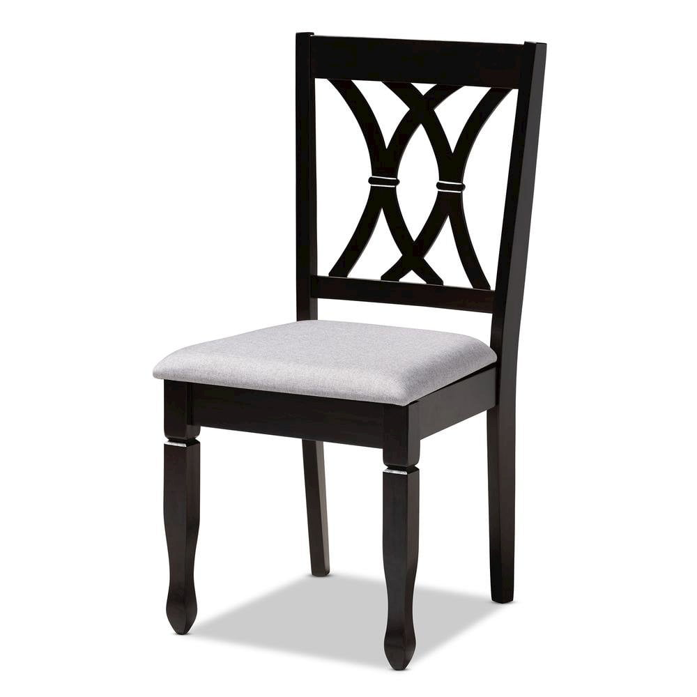 Featuring an exquisitely crafted frame, the Reneau dining chair adds elegance to any dining space. This solid rubberwood chair displays a sleek espresso brown finish that complements the light polyester fabric upholstery. Designed to add both comfort and style to your dining space, the chair features a plush foam-padded seat, as well as a stunning cut-out design on its back. Tapered feet add a classic, refined touch. Built for long dinners with family and friends, the Reneau is sure to enhance any dining experience. The Reneau dining chair is made in Malaysia and requires assembly. Features: Constructed from rubberwood Espresso brown finish Polyester fabric upholstery Specifications: Seat Height: 18.5 Seat Depth: 16.1 Seat Width: 18.5