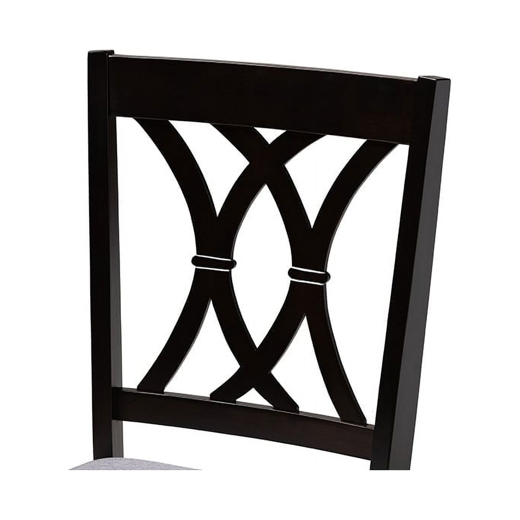 Baxton Studio Reneau Modern and Contemporary Gray Fabric Upholstered Espresso Brown Finished Wood 5-Piece Dining Set Crafted with the utmost attention to detail, the Reneau 5-piece dining set adds elegance to any dining space. Constructed from solid rubberwood in an espresso finish, this dining set includes one table and four chairs, each upholstered in a light polyester fabric that complements the dark wood finish. Designed to add both comfort and style to your dining space, each chair features a plush foam-padded seat, as well as a stunning cut-out design on its back. Tapered feet add a classic, refined touch. Built for long dinners with family and friends, the Reneau set is sure to enhance any dining experience. The Reneau 5-piece dining set is made in Malaysia and requires assembly. Specifications: Modern and contemporary dining set includes one (1) table and four (4) chairs Constructed from rubberwood Espresso brown finish Polyester fabric upholstery Cut-out back design Assembly required Made in Malaysia
