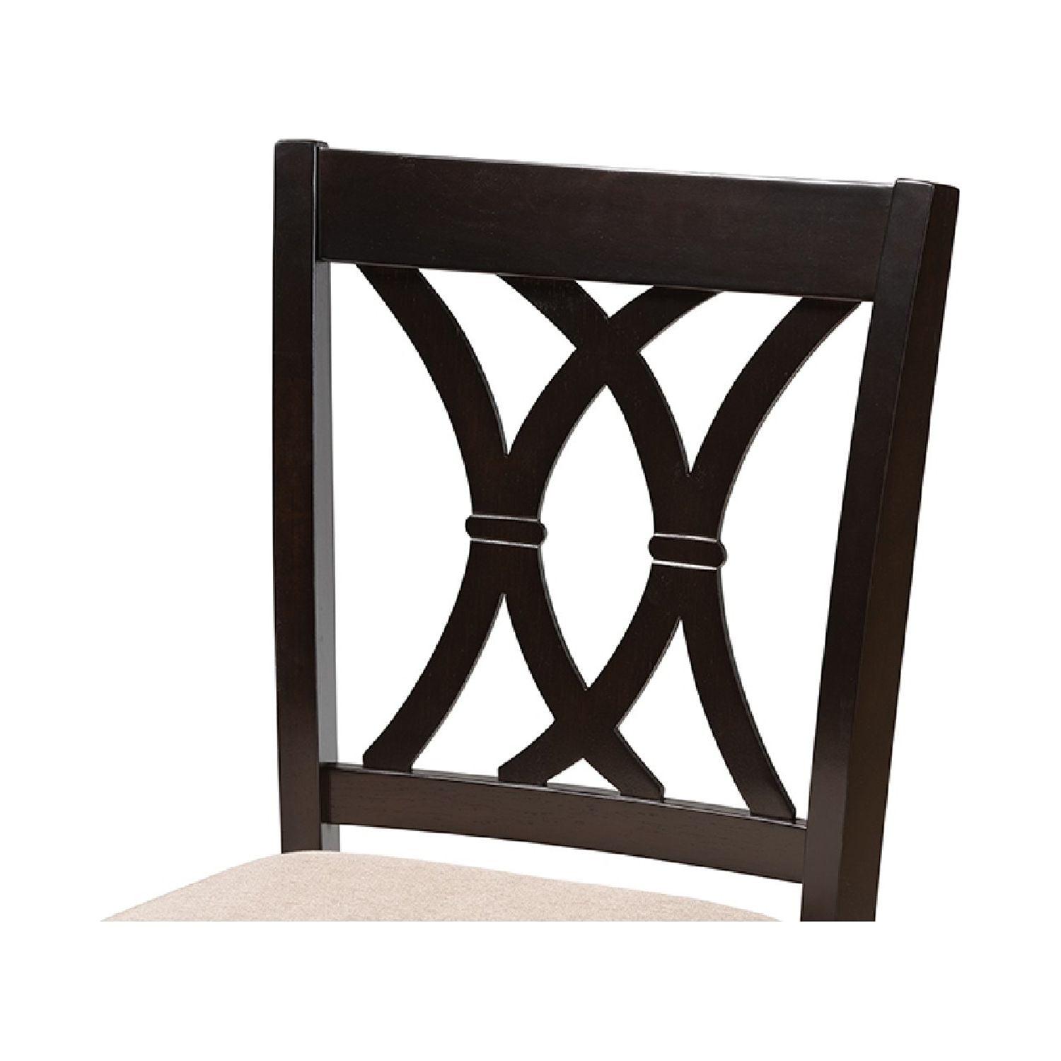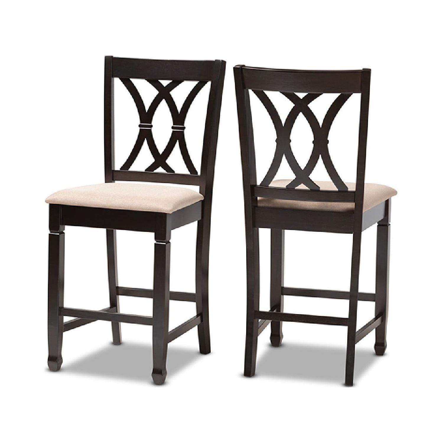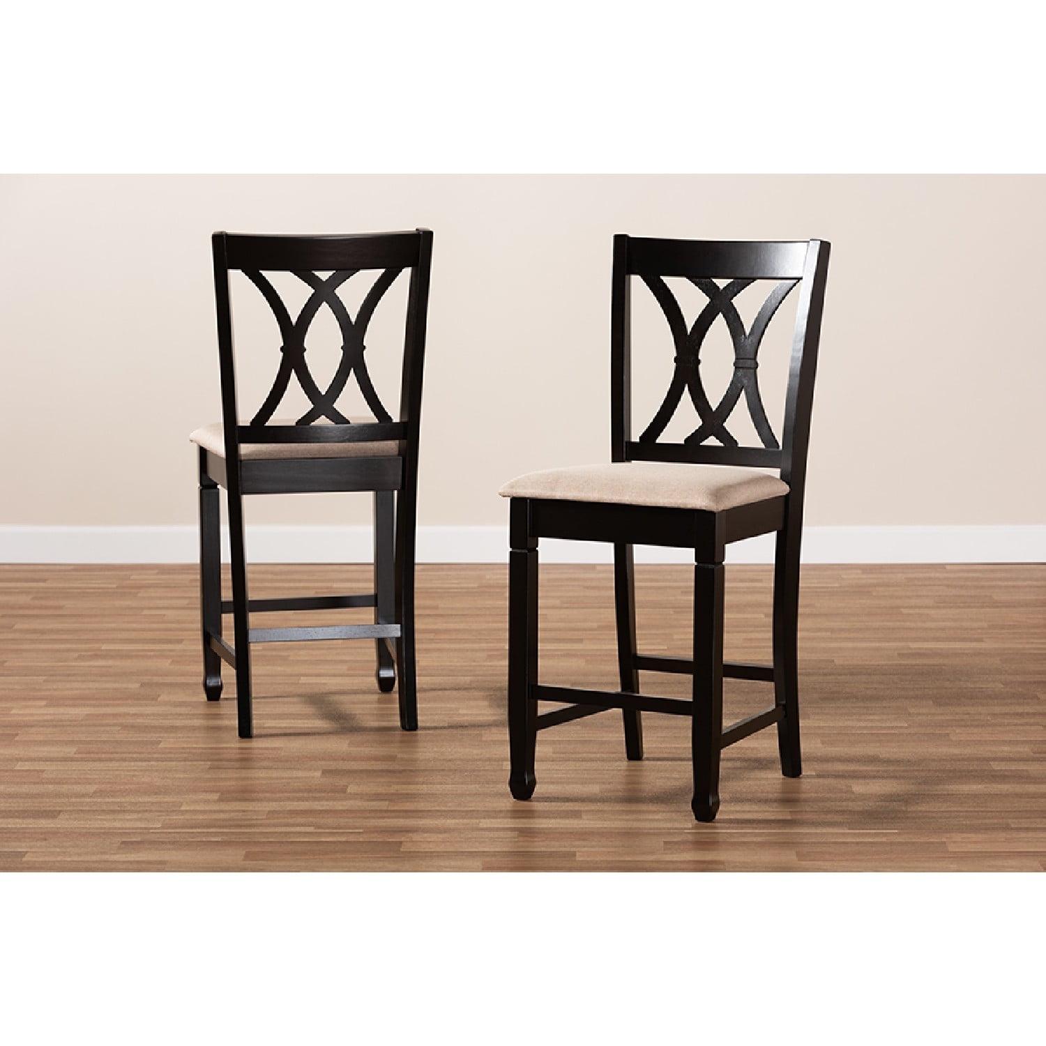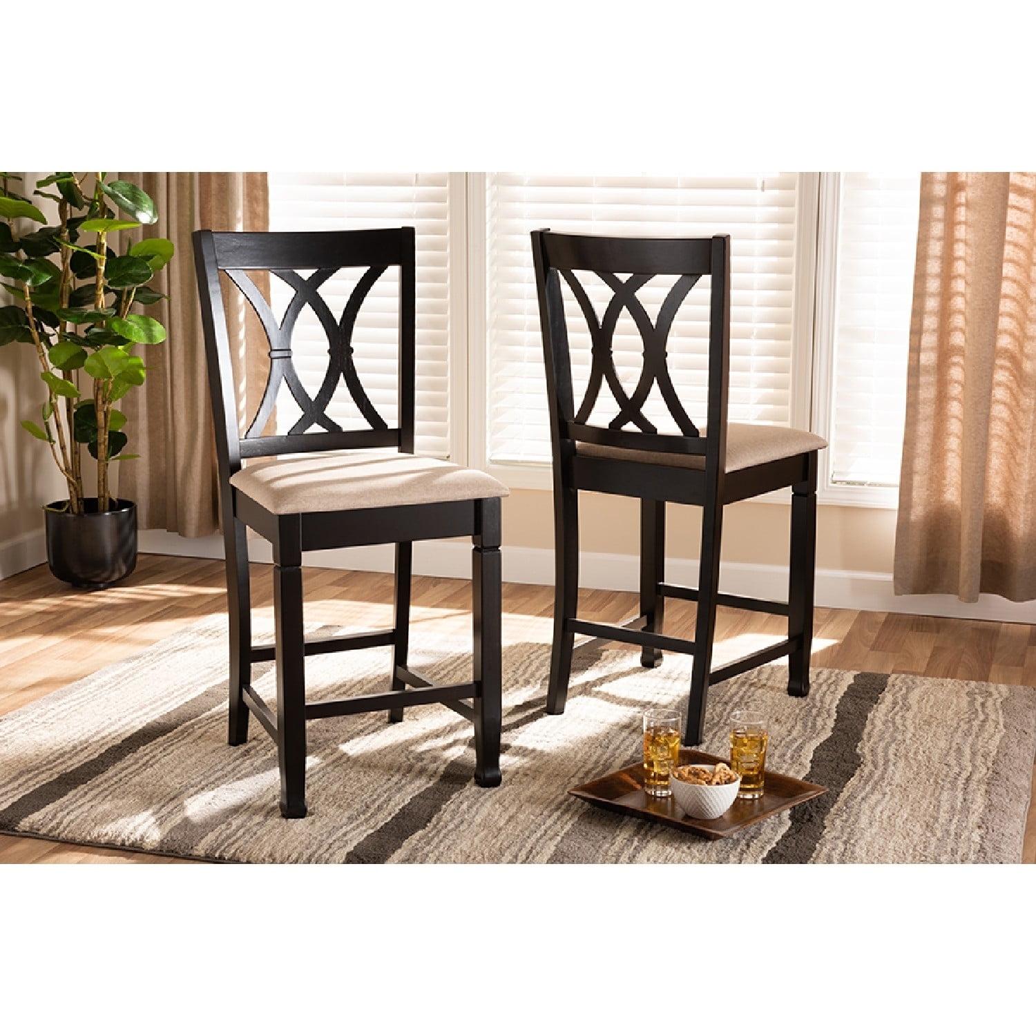 Baxton Studio Reneau Modern and Contemporary Sand Fabric Upholstered Espresso Brown Finished Wood Counter Height Pub Featuring an exquisitely crafted frame, the Reneau pub chair adds elegance to any dining space. This solid rubberwood chair displays a sleek espresso brown finish that complements the light polyester fabric upholstery. Designed to add both comfort and style to your dining space, the Reneau features a plush foam-padded seat, as well as a stunning cut-out design on its back. Tapered feet add a classic, refined touch. Constructed at counter height, the Reneau is well suited for use with kitchen counters and pub tables. The Reneau pub chair is made in Malaysia and requires assembly.