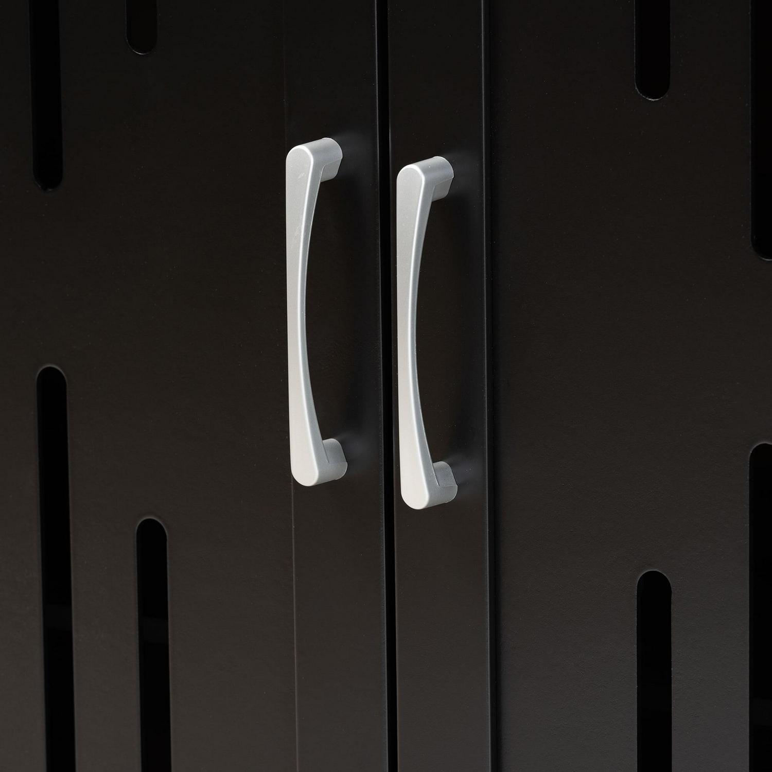 Grace the entryway of your home with the refreshing design of the Renley shoe cabinet. This handy piece is constructed from sturdy wood. Four shelves located behind the doors provide storage space for around eight pairs of shoes, depending on size. The Renley requires assembly and features long cut-outs on the doors to allow for air circulation and dispersal odors. Long metal handles complete the look, making the Renley shoe cabinet an efficient yet elegant solution to your storage needs.