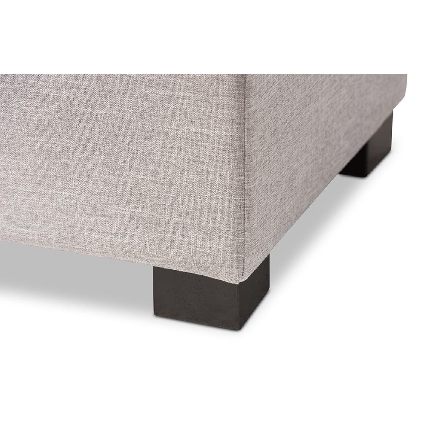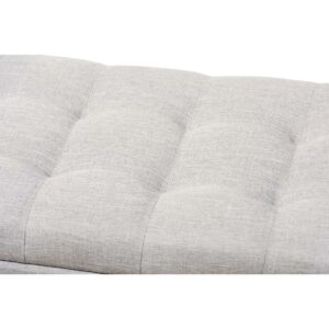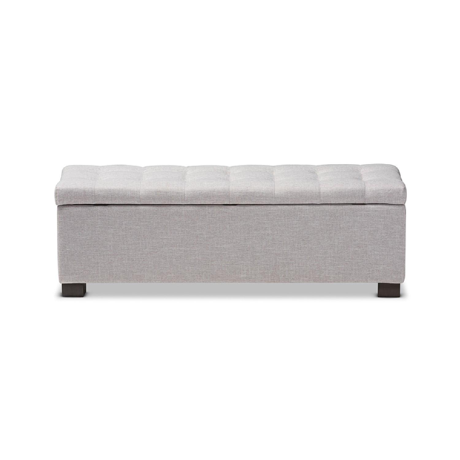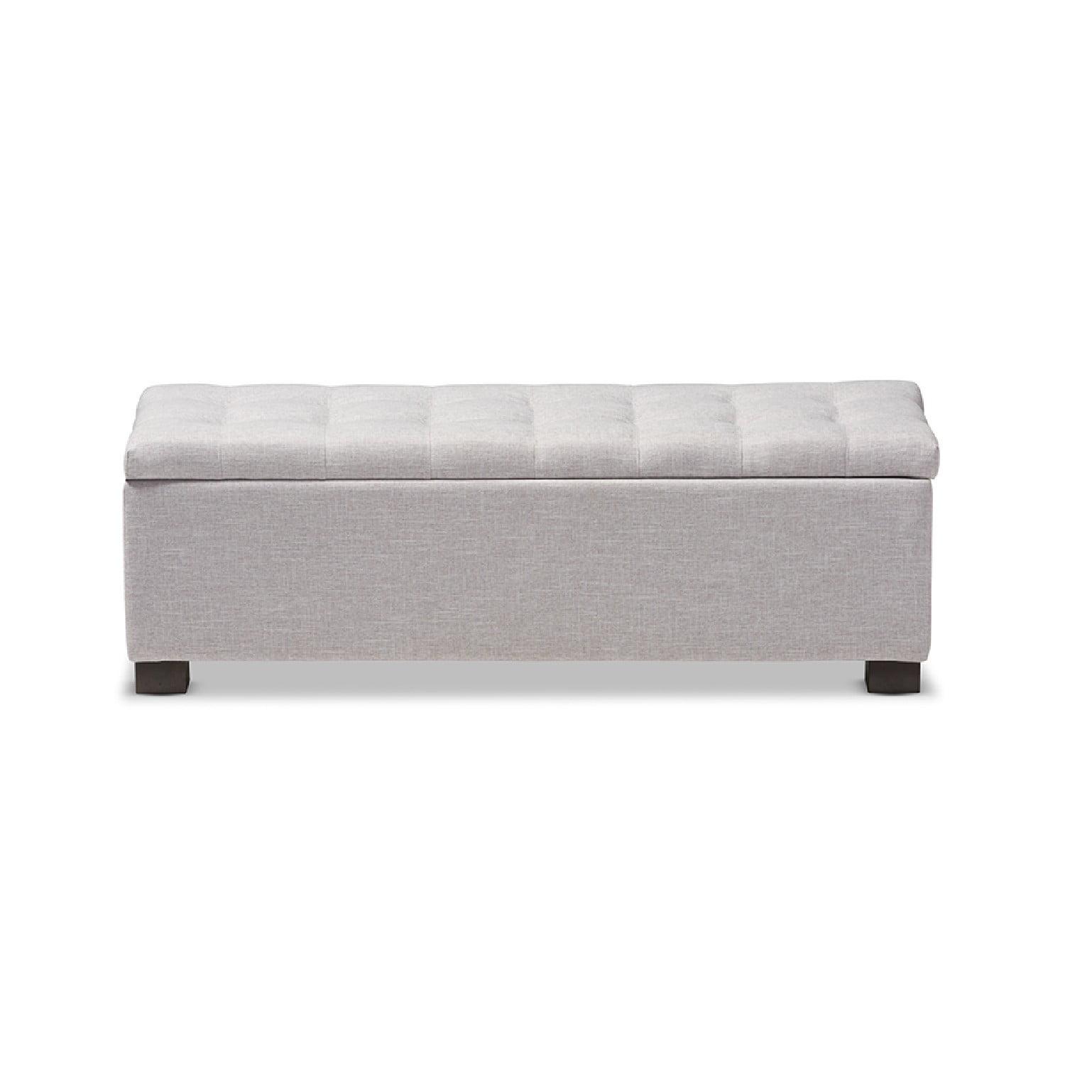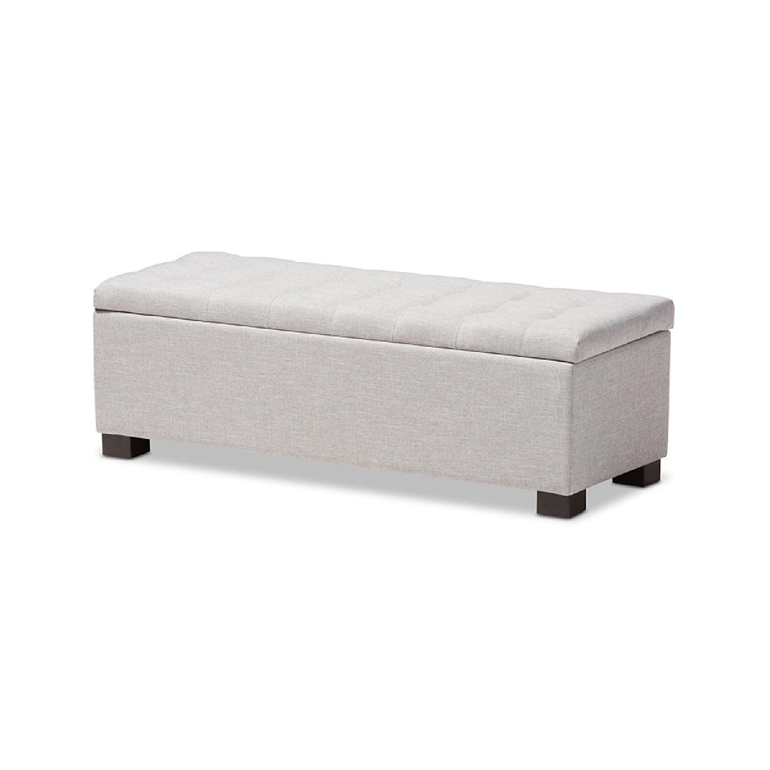 Baxton Studio Roanoke Modern and Contemporary Grayish Beige Fabric Upholstered Grid-Tufting Storage Ottoman Bench Perfect as a bed end bench for your bedroom or as an accent piece in your living space, the Roanoke storage ottoman bench combines handy seating and storage in a stylish way. Constructed of solid rubberwood frame, the storage ottoman bench features cushioned seat upholstered in quality polyester blend fabric thats durable and stain-resistant, available in your choice of beige, greyish beige, dark grey or light blue color for a neutral or statement look. Featuring grid-tufting design, the hinged top reveals spacious storage trunk while the black solid wood legs create a strong foundation and an elegant look. Made in Malaysia, the Roanoke storage ottoman requires minor legs assembly.