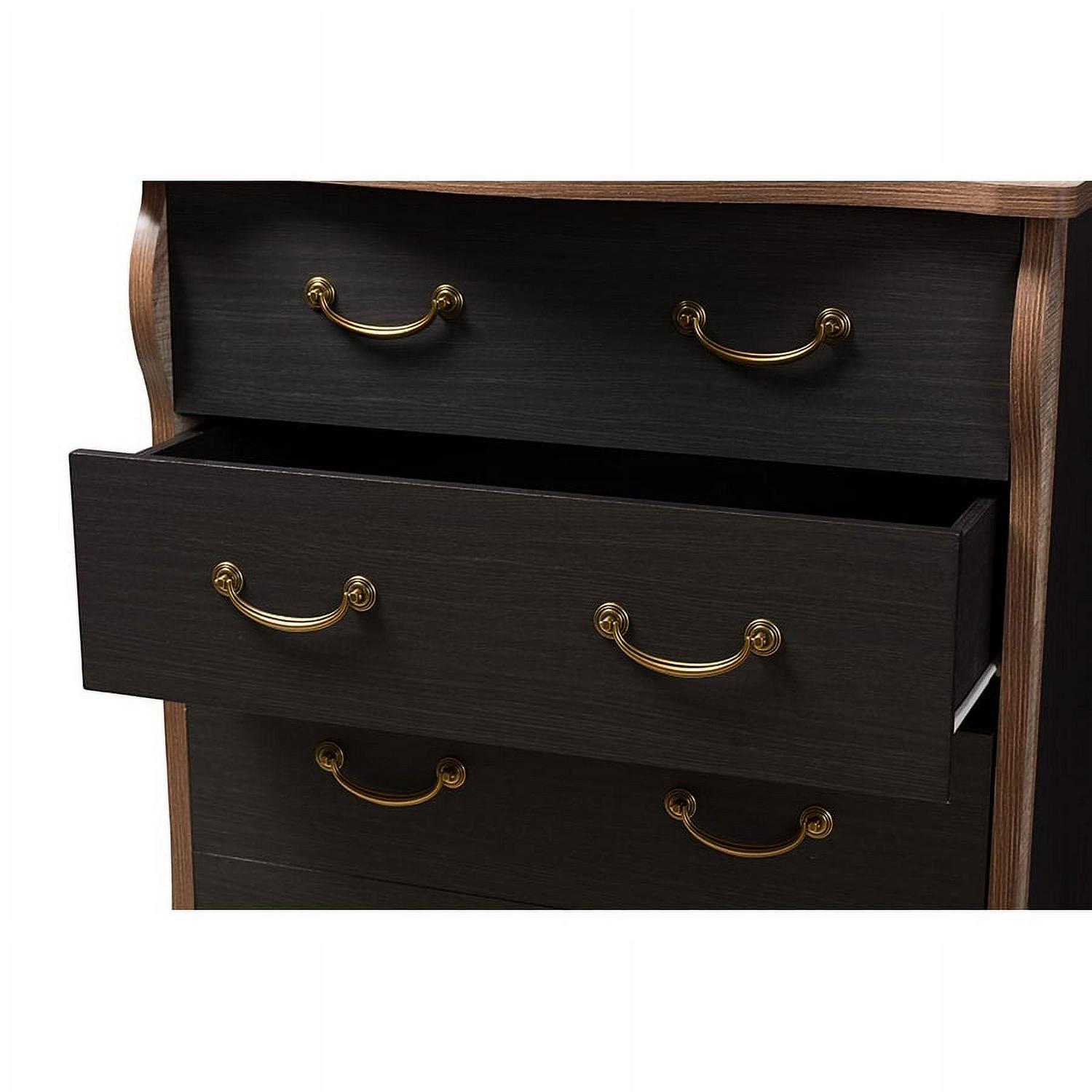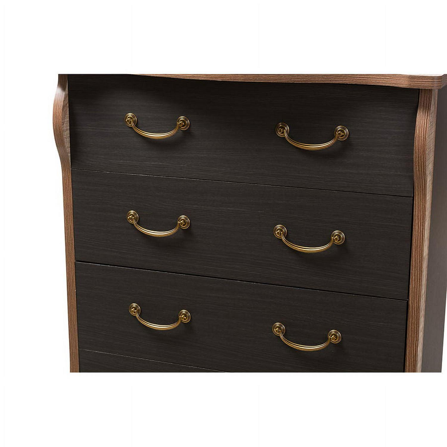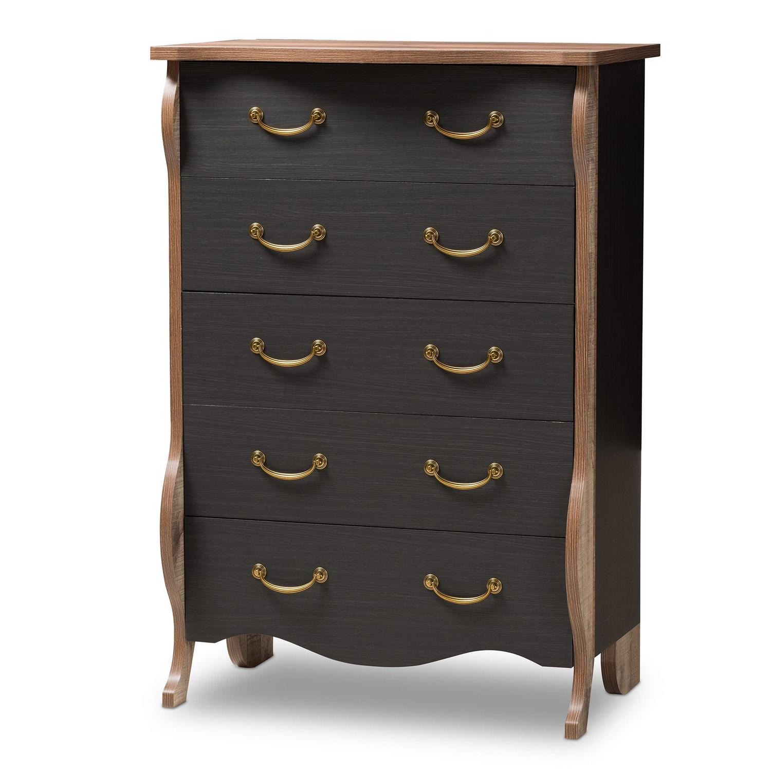 Baxton Studio Romilly Country Cottage Farmhouse Black and Oak-Finished Wood 5-Drawer Chest The Romilly 5-drawer chest is an exciting spin on a traditional look. The classic and traditional-inspired design is evident in the serpentine curves of the frame and attention to detail. The two-tone finish is where the updated look of this chest comes in. The sides and drawers of the chest are finished in black, contrasting and complementing the oak finish of the wings and top of the chest. All five drawers of the Romilly easily pull out on rolling slides. The chest features charming gold-finished metal drawer pulls with ornate grooves for extra detail. The Romilly is dynamic and can be coordinated with a wide range of decor, from romantic, rustic and French styles all the way through contemporary. Add this versatile charm to your bed room, guest room, nursery, or any space needing storage and style. Made in Malaysia, the Romilly requires assembly.