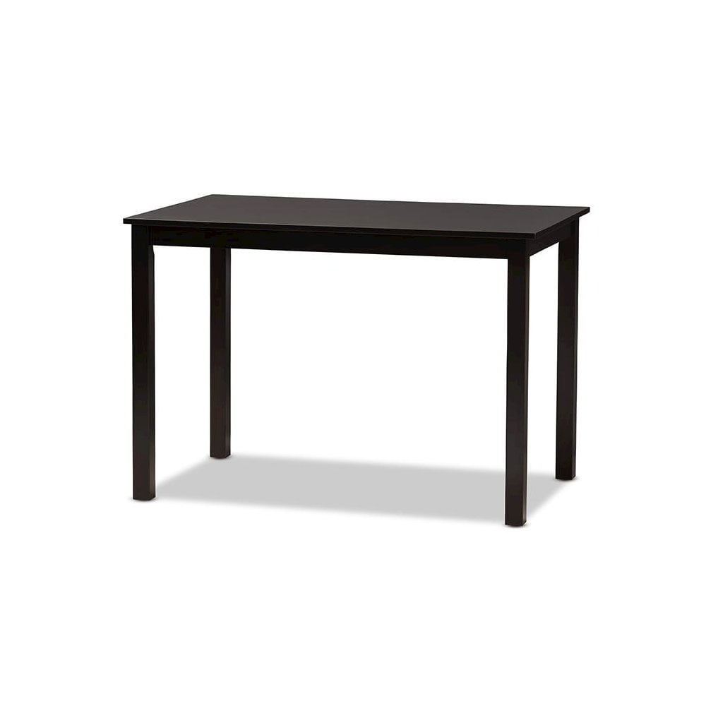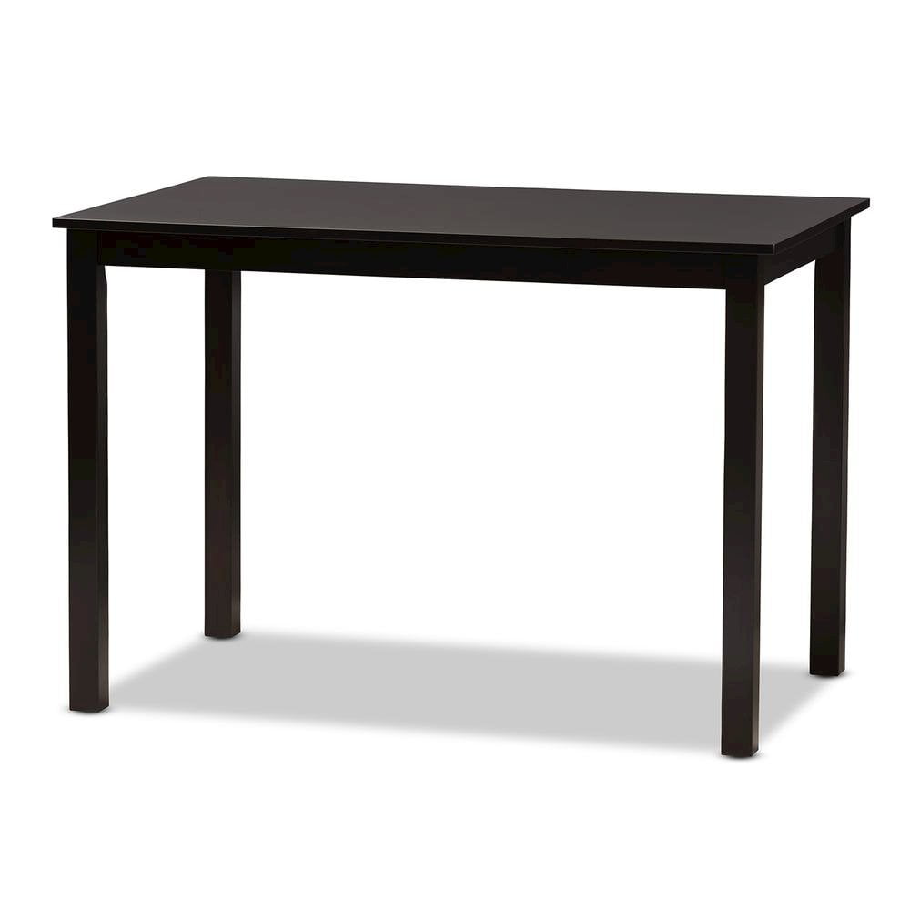 Modern and contemporary 5-piece dining set Set includes one table and four chairs Solid rubberwood construction with mdf table top Dark brown finishing Dining table is with shaker legs Upholstered seat in sand polyester fabric Assembly required VS1379 VS1379 VS1379 Care instruction : Table: wipe with a damp cloth; chairs: spot clean only Table Dimensions: 29.13″ High x 43.31″ Wide x 27.56″ Deep; Legs: 28.35″ High; Weight: 39.68 lbs.; Chairs Dimensions: 36.42″ High x 17.01″ Wide x 17.5″ Deep; Seating Dimensions: 18.11″ High (from Floor) x 16.93″ Wide x 15.16″ Deep; Back: 36.42″ High; Legs: 16.54″ High; Weight: 10.58 lbs.