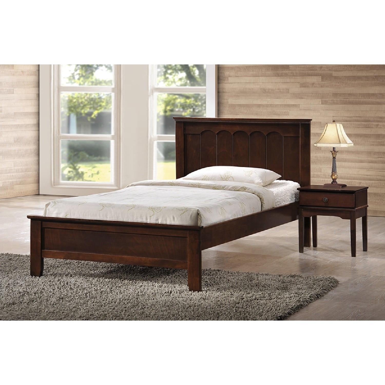 Baxton Studio Schiuma Cappuccino Wood Contemporary Twin-Size Bed Our Schiuma Wood Contemporary Twin-Size Bed offers understated styling at a budget price without cutting corners on quality. Featuring genuine rubberwood construction, this essential bedroom-furniture element offers an actual carved classic design on the headboard. The cappuccino finish lends warmth to any bedroom.