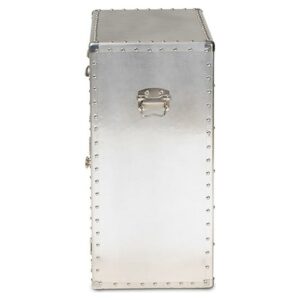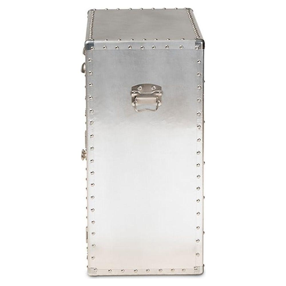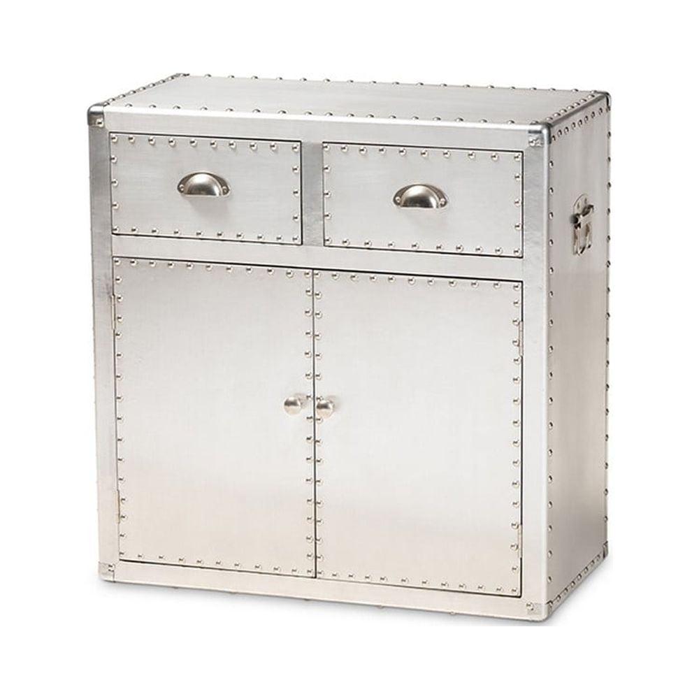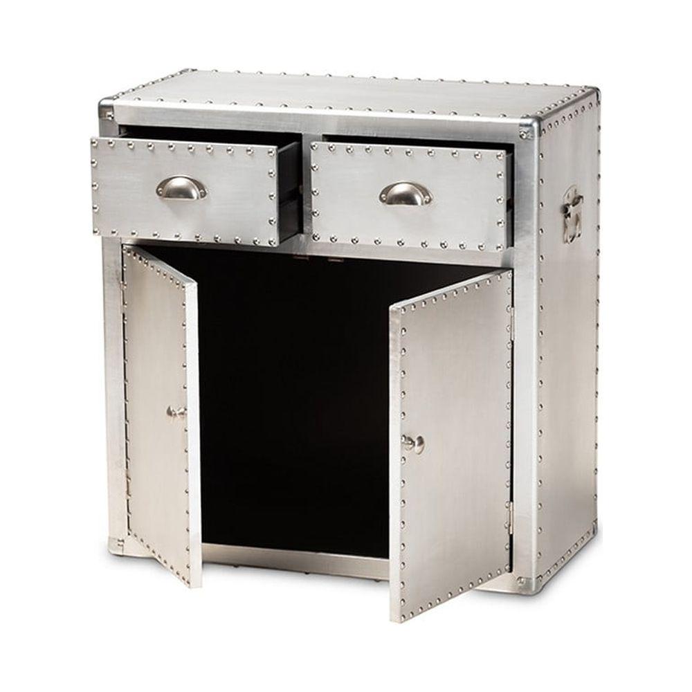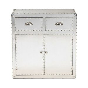 Baxton Studio Serge French Industrial Silver Metal 2-Door Accent Storage Cabinet Bring chic industrial style into your space with the Serge cabinet. Constructed from wood and metal, the Serge features two drawers and one concealed compartment, behind two doors, to keep items organized and out of sight. Polished silver metal drawer handles add a sleek touch. Inspired by vintage storage trunks, the Serge is embellished with rivets and corner protectors. This unique piece is well suited for a living room, bedroom, or entryway. The Serge cabinet is made in China and will arrive fully assembled.