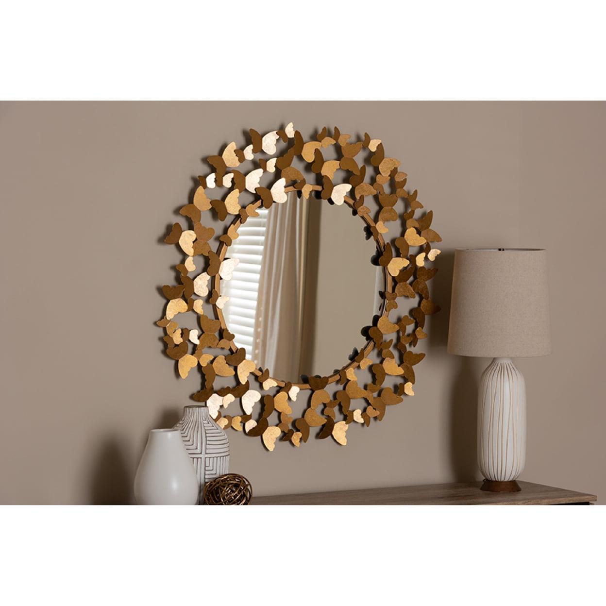 Baxton Studio Soleil Modern and Contemporary Antique Gold Finished Butterfly Accent Wall Mirror,Wholesale Interiors Featuring a flock of golden butterflies, the Soleil wall mirror will give your space an ethereal aura. The Soleil is constructed from durable metal in a rustic gold finish for an antique appearance. The circular mirror is framed by a cluster of butterflies in flight, transmitting a sense of energy. These stunning butterfly figures are sure to become the focal point of any room they are placed in. The Soleil wall mirror is made in China and will arrive fully assembled.