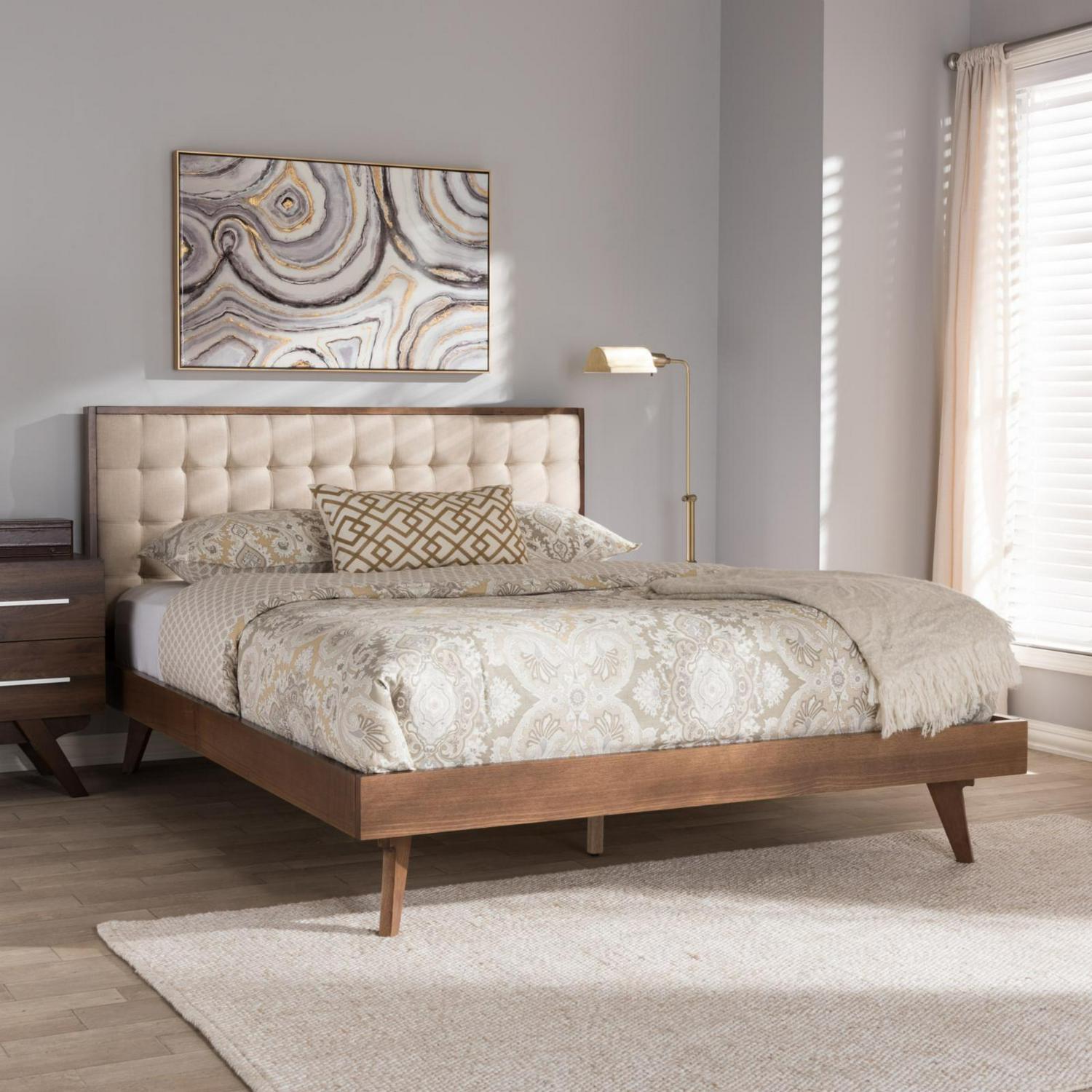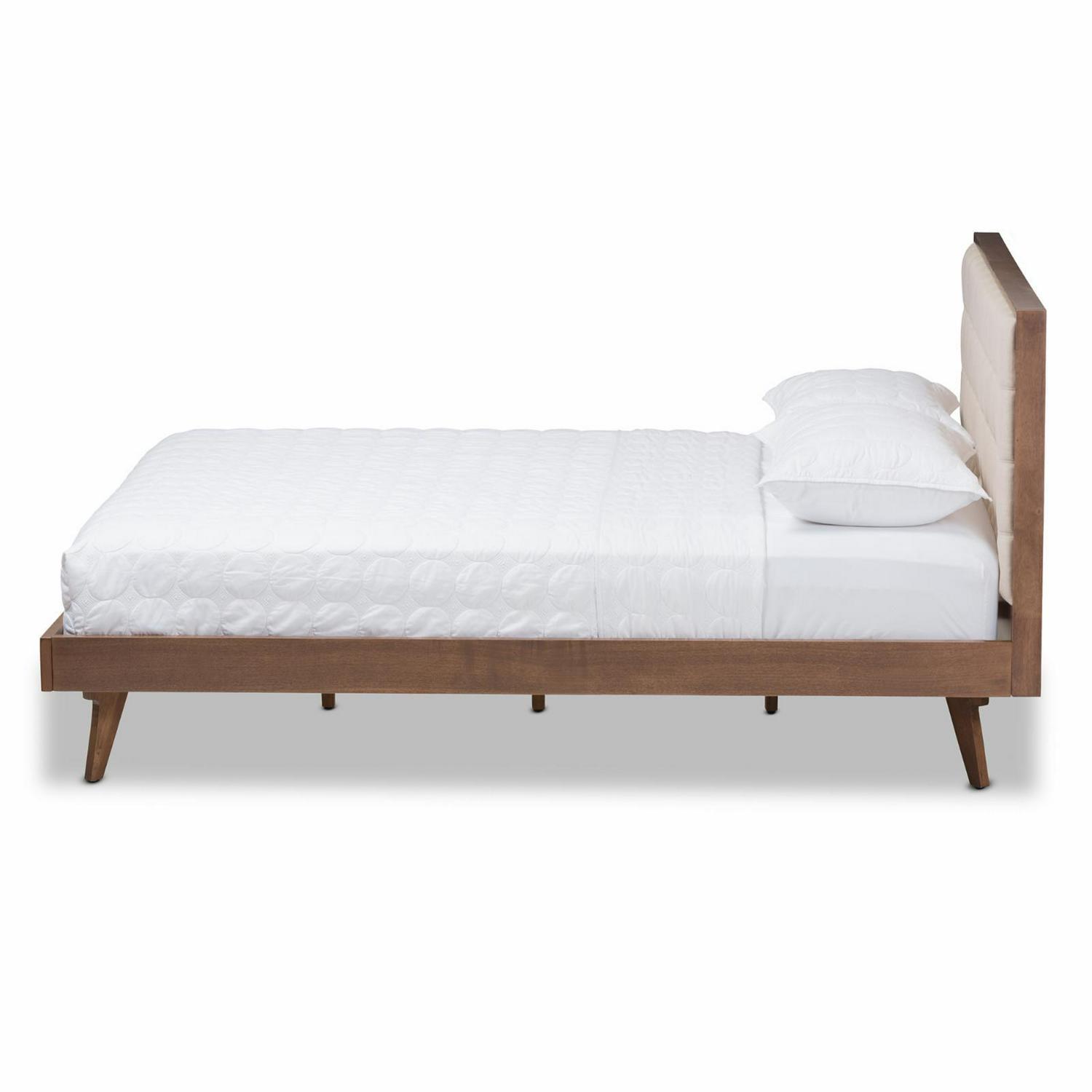Baxton Studio Soloman Mid-Century Modern Light Beige Fabric and Walnut Brown Finished Wood Platform Bed, Multiple Sizes
