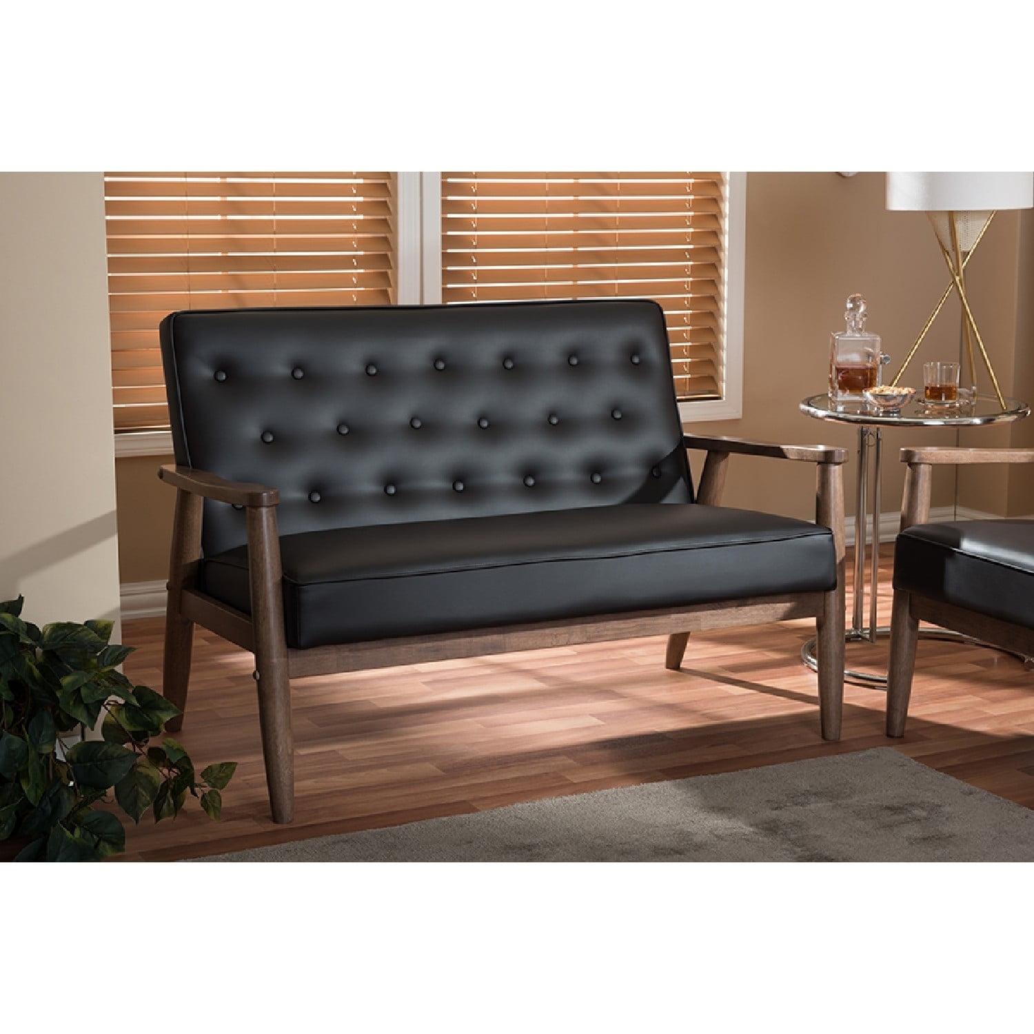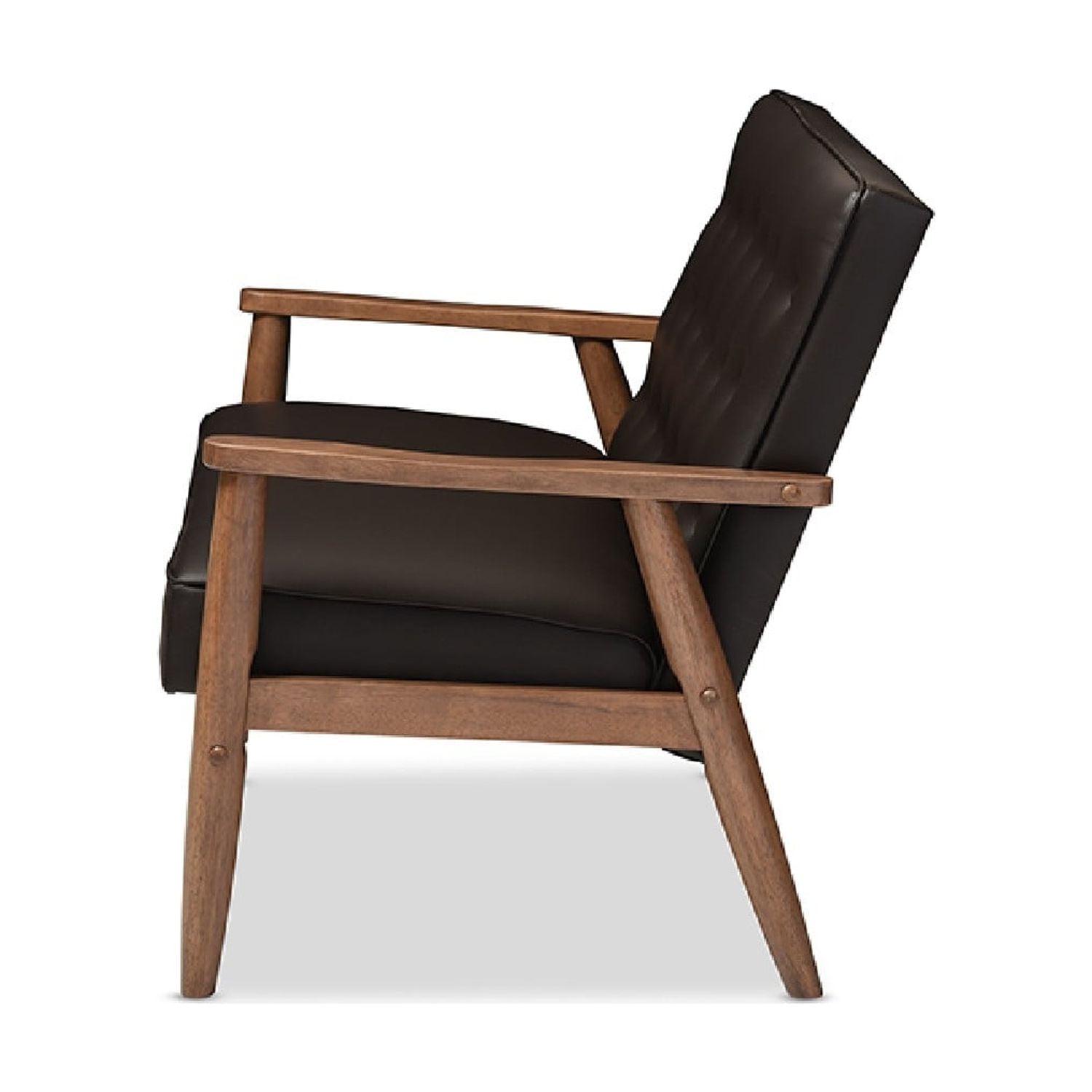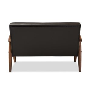 Baxton Studio Sorrento Mid-century Retro Modern Brown Faux Leather Upholstered Wooden 2-seater Loveseat A simple, post-modern design that works well with a variety of styles, the Sorrento 2-seater loveseat is upholstered in brown faux leather with solid rubberwood legs and frame. The sculptural arms and wide, welcoming seat are a throwback to classic 1950s and 60s Danish design. A fully upholstered seat with exposed dark walnut wood looks great from all angles, whether in a lounge arrangement, public waiting area or private office. The splayed legs and button-tufting design add a retro modern touch to this piece of clean lines furniture. The Sorrento features light weight and easy handling. It will be suitable for those urban dwellers with limited space. It could be a cool-looking reading nook within 30 minutes of assembly out of a box. Made in Malaysia, the Sorrento will be a standout piece in any modern interior.