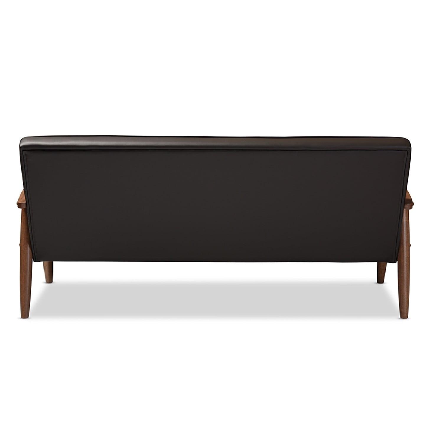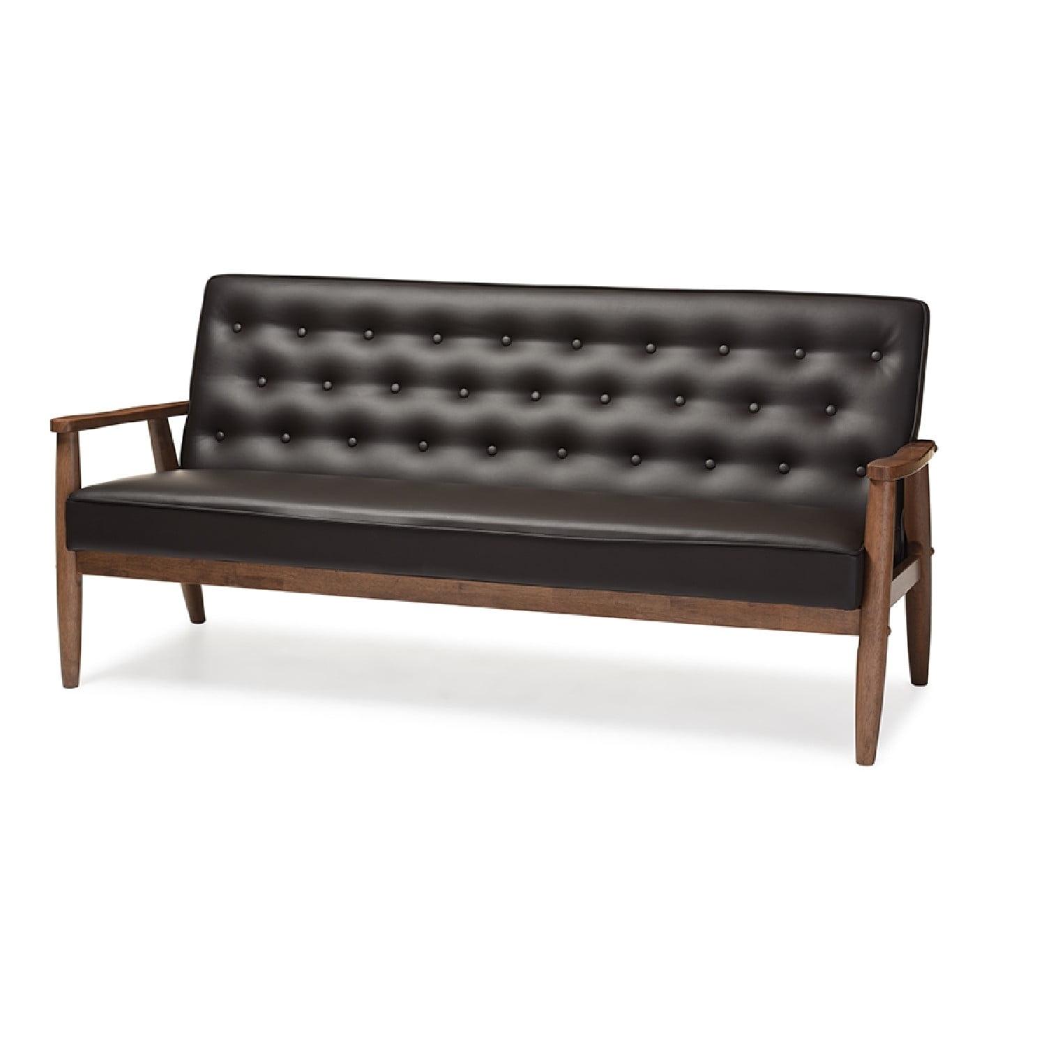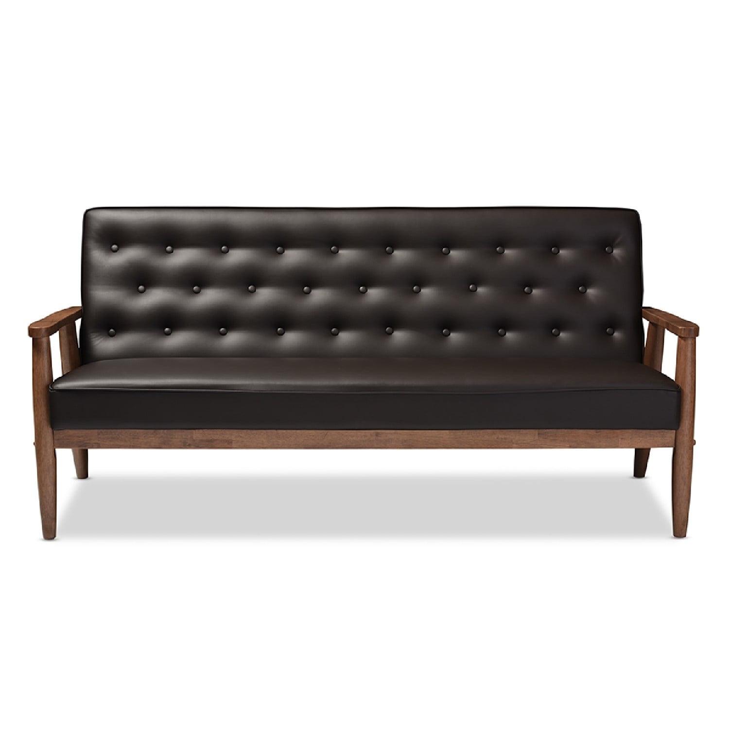 Baxton Studio Sorrento Mid-century Retro Modern Brown Faux Leather Upholstered Wooden 3-seater Sofa A simple, post-modern design that works well with a variety of styles, the Sorrento 3-seater sofa is upholstered in brown faux leather with solid rubberwood legs and frame. The sculptural arms and wide, welcoming seat are a throwback to classic 1950s and 60s Danish design. A fully upholstered seat with exposed dark walnut wood looks great from all angles, whether in a lounge arrangement, public waiting area or private office. The splayed legs and button-tufting design add a retro modern touch to this piece of clean lines furniture. The Sorrento features light weight and easy handling. It will be suitable for those urban dwellers with limited space. It could be a cool-looking reading nook within 30 minutes of assembly out of a box. Made in Malaysia, the Sorrento will be a standout piece in any modern interior.