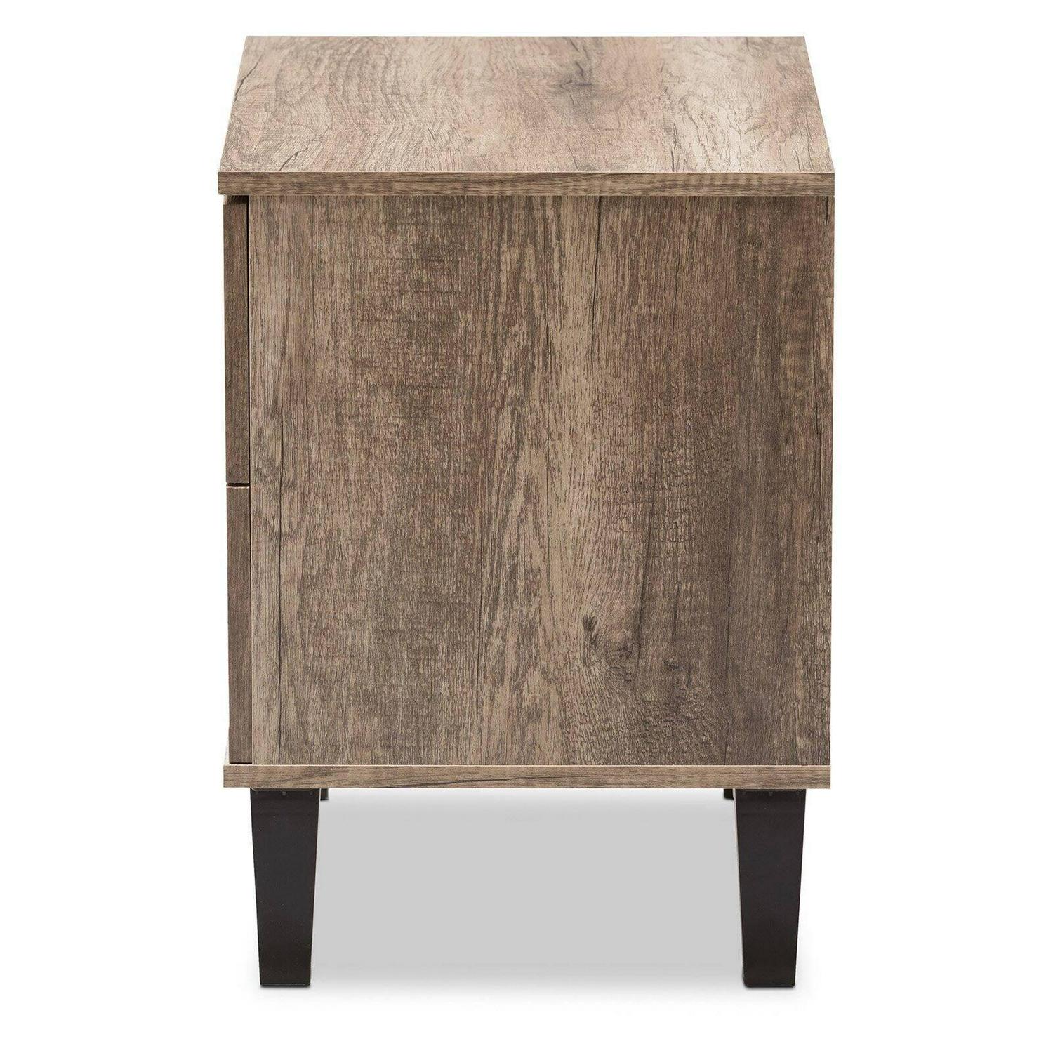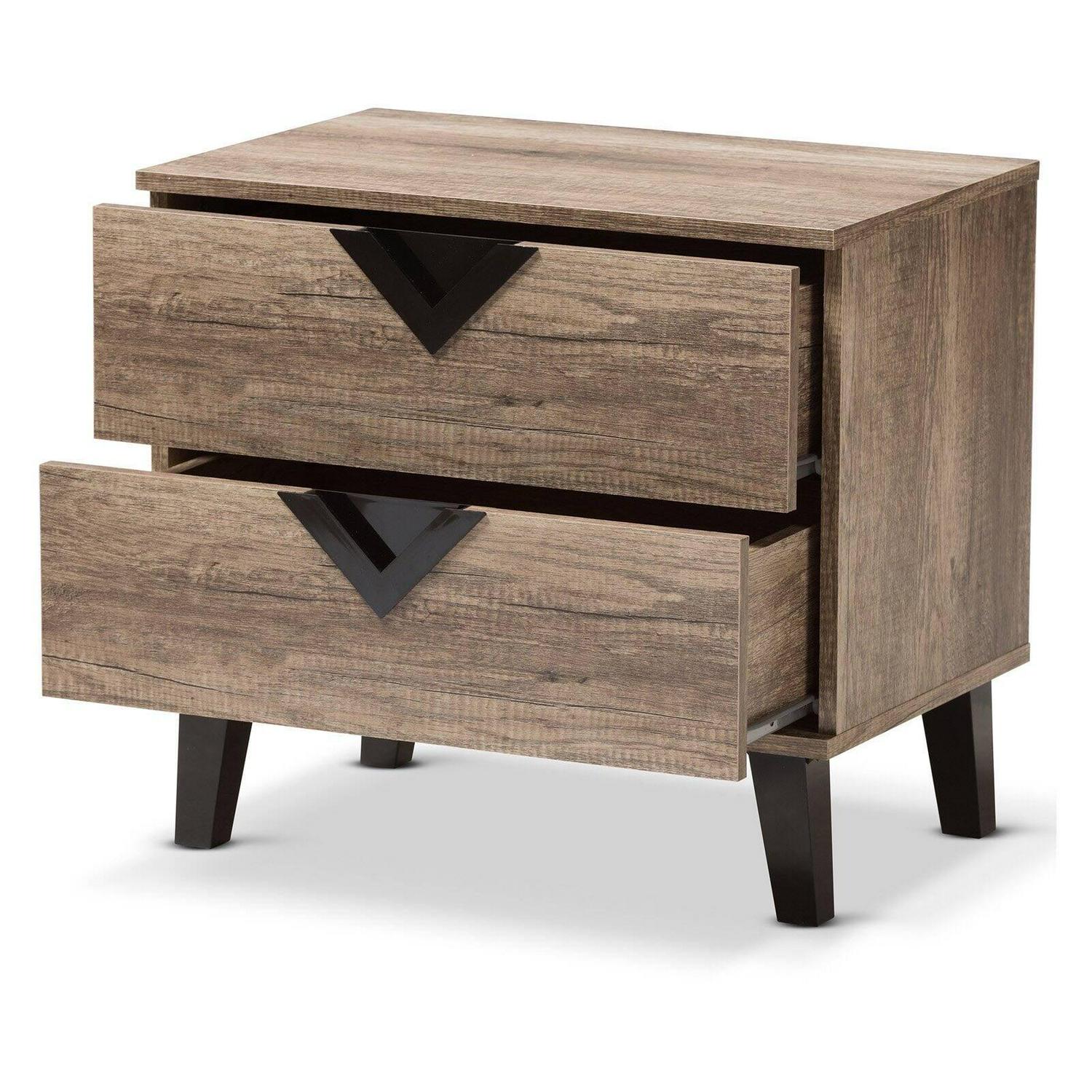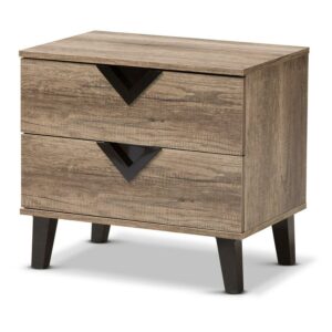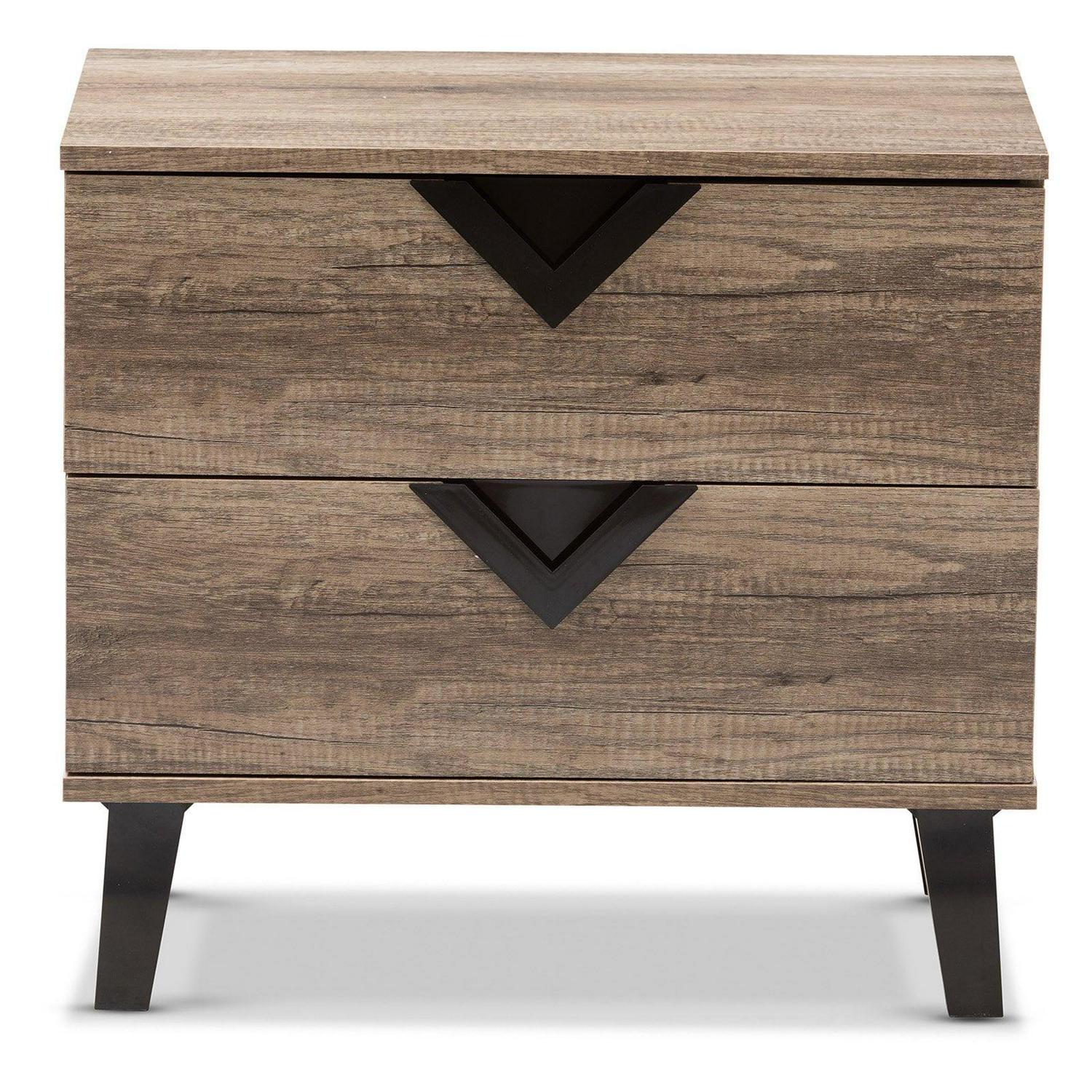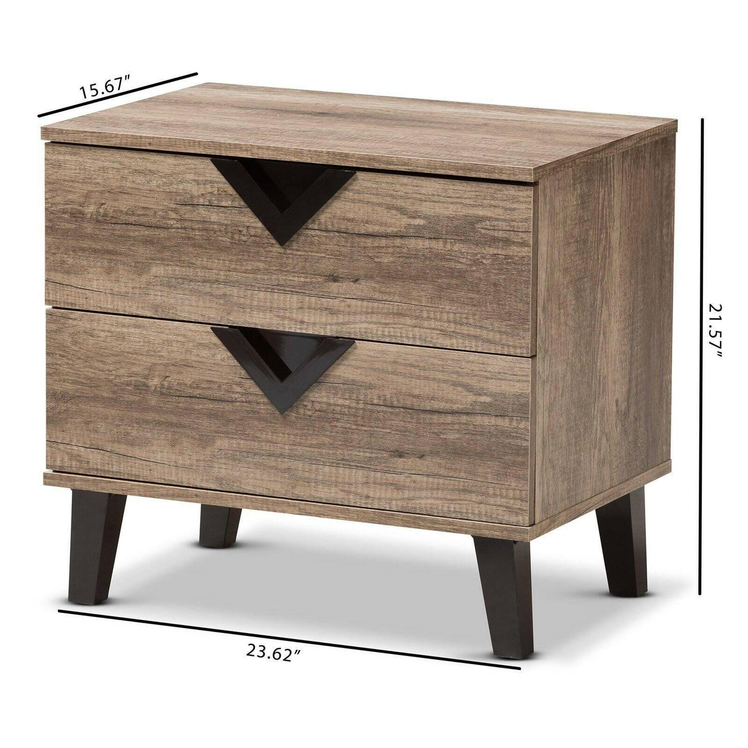 Let bold colors and sharp lines accent your modern bedroom with the Baxton Studio Swanson Light Brown Wood 2-Drawer Nightstand. This bulky nightstand offers a wealth of storage, featuring two wide and deep drawers. Each drawer has V-shaped notched handles made from black vinyl plastic. Smooth ball-bearing glides outfit the drawers. The frame is made from tough engineered wood with angled block legs made from plastic. A weathered oak finish tops the wood with a matching black finish for the legs.