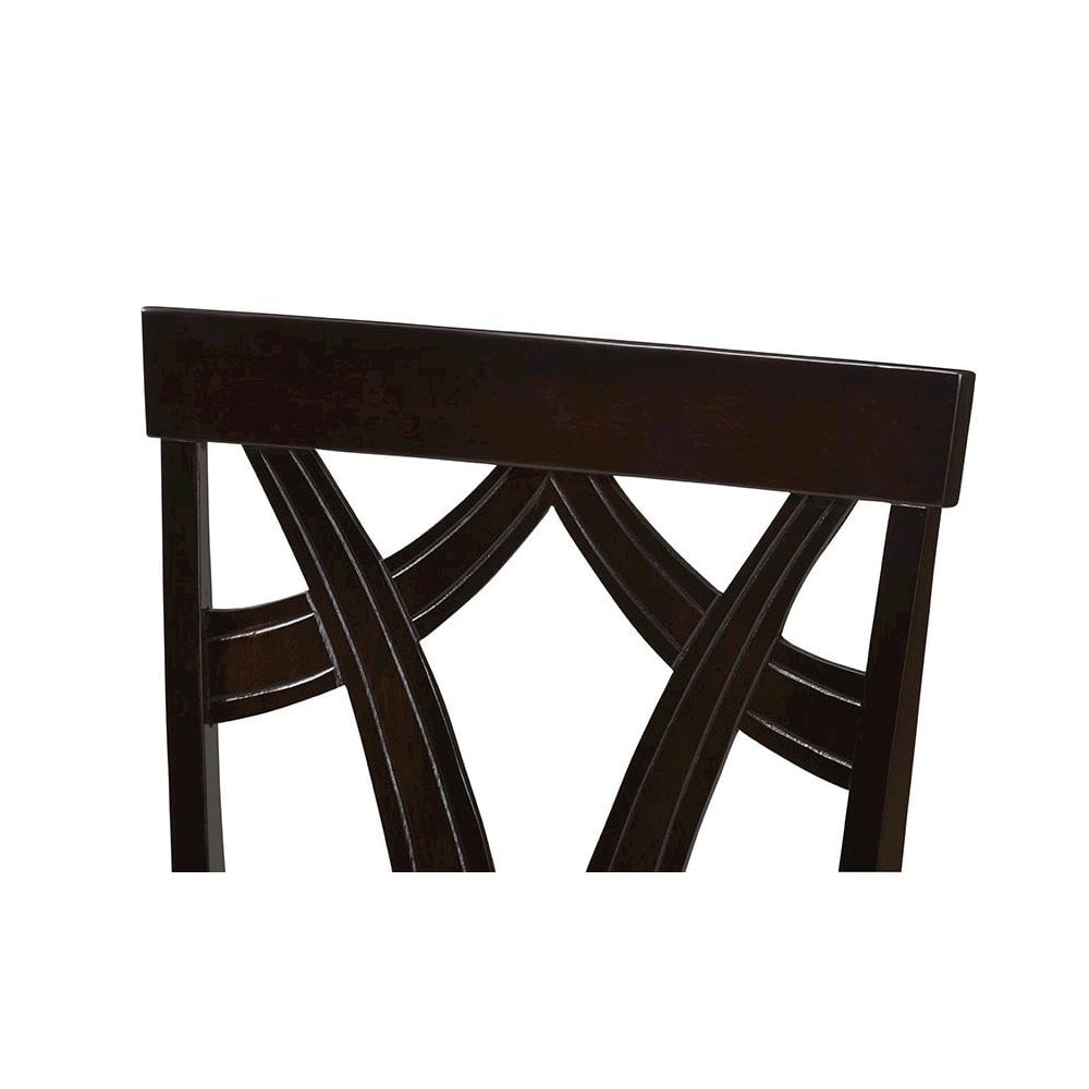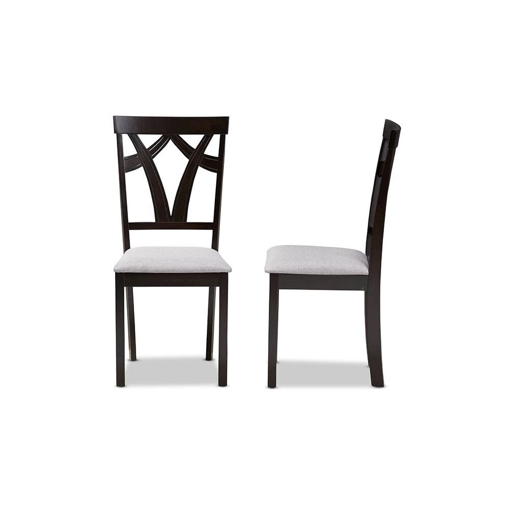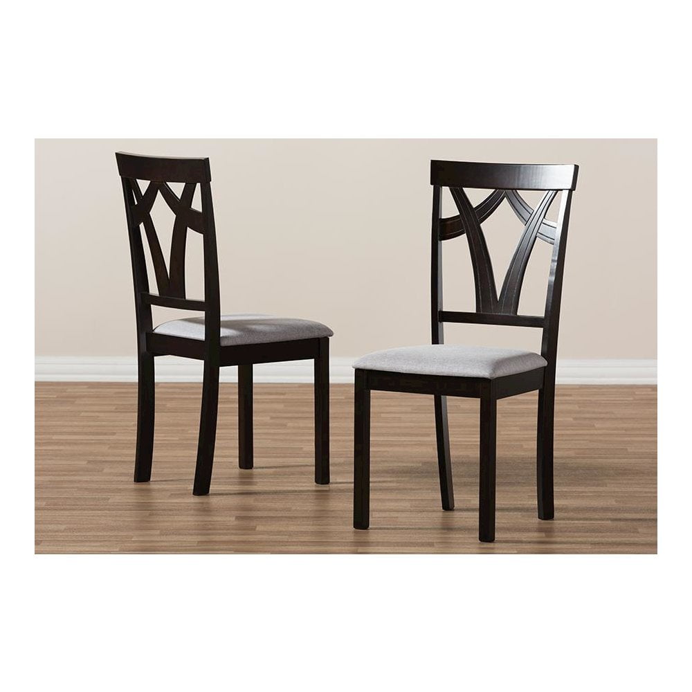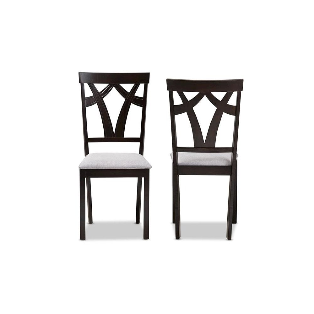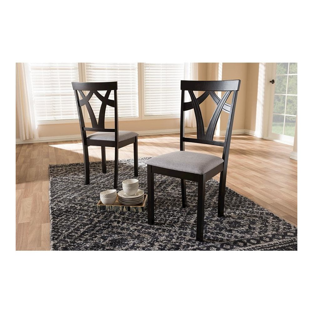 Sold as 2 pieces/Set. Modern and contemporary dining chair set. Tapered legs. Set includes two chairs. Upholstered seat in grey polyester fabric. Solid rubberwood construction. Assembly required. Dark brown finishing. Dimensions: 37.01″ High x 17.36″ Wide x 17.99″ Deep; Seating Dimensions: 18.11″ High (from Floor) x 16.93″ Wide x 15.16″ Deep; Back: 18.9″ High; Legs: 16.54″ High.