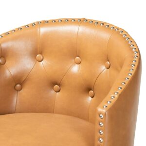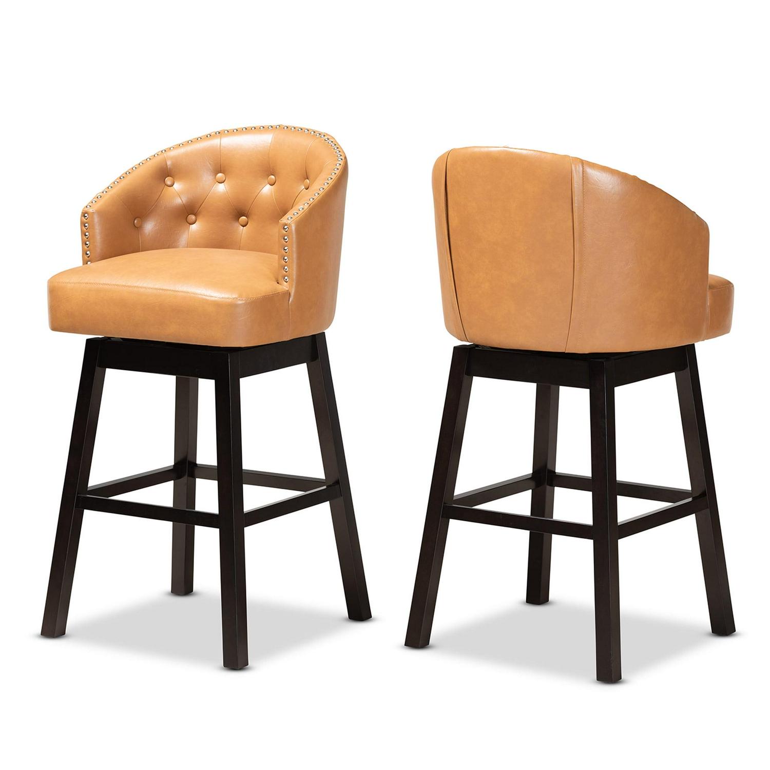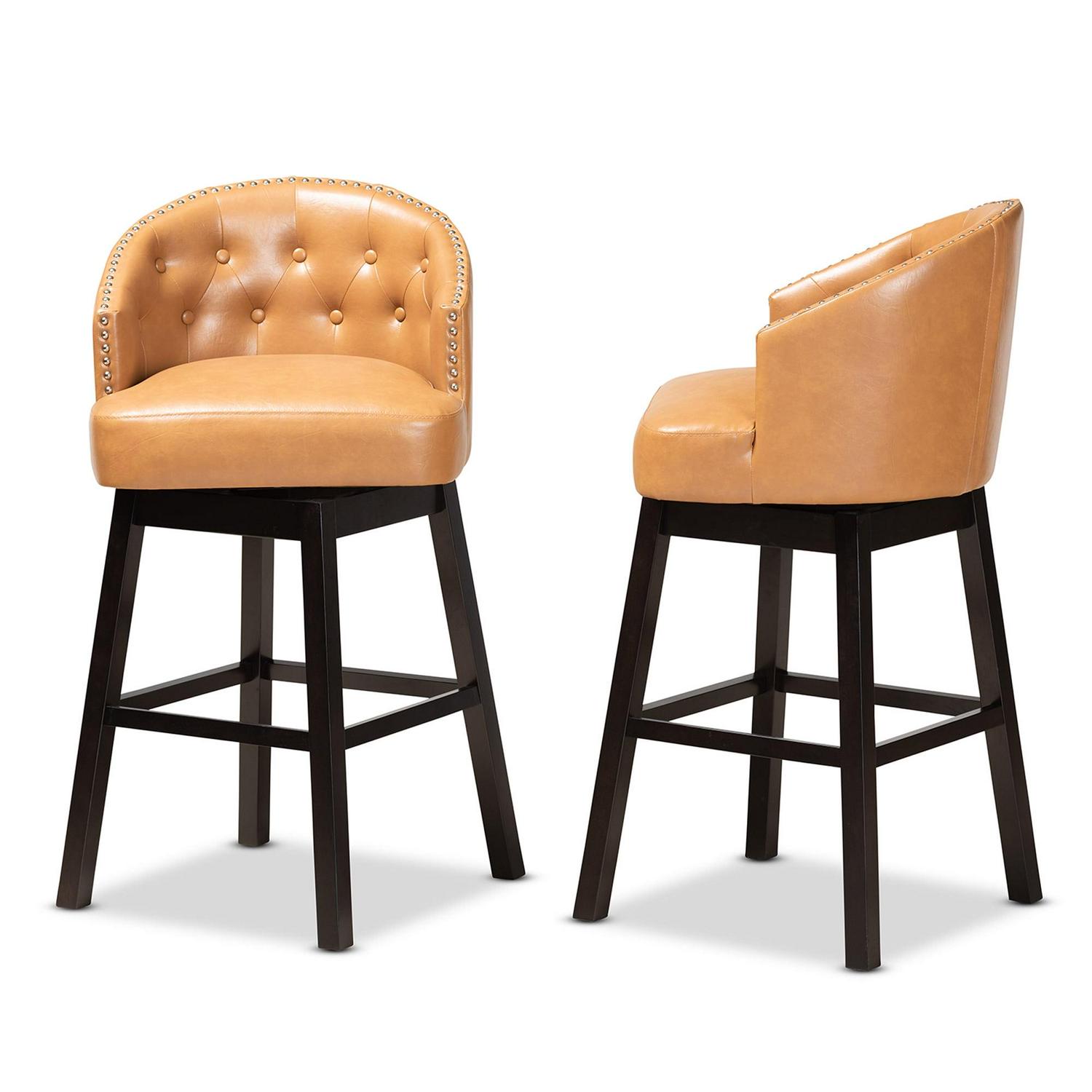 Set includes two (2) bar stools Constructed from rubberwood and engineered wood Dark brown finish Upholstered in faux leather and padded with foam Swivel seat Accented with button tufting and silver finished metal nailheads Assembly required Product Weight: 23.8 Pound Package Weight: 53.4 Pound Dimensions: 41.1″ High x 21.7″ Wide x 21.7″ Deep; Seat Dimensions: 30.9″ High(From Floor) x 17.7″ Wide x 17.7″ Deep; Arm Height (from floor): 35″ High; Back: 10.2″ High; Legs: 24.8″ High; Product Color: Tan/Dark Brown Product Composition: Faux Leather/MDF/Foam/Rubberwood