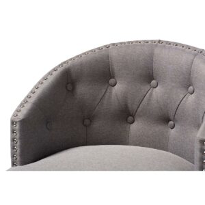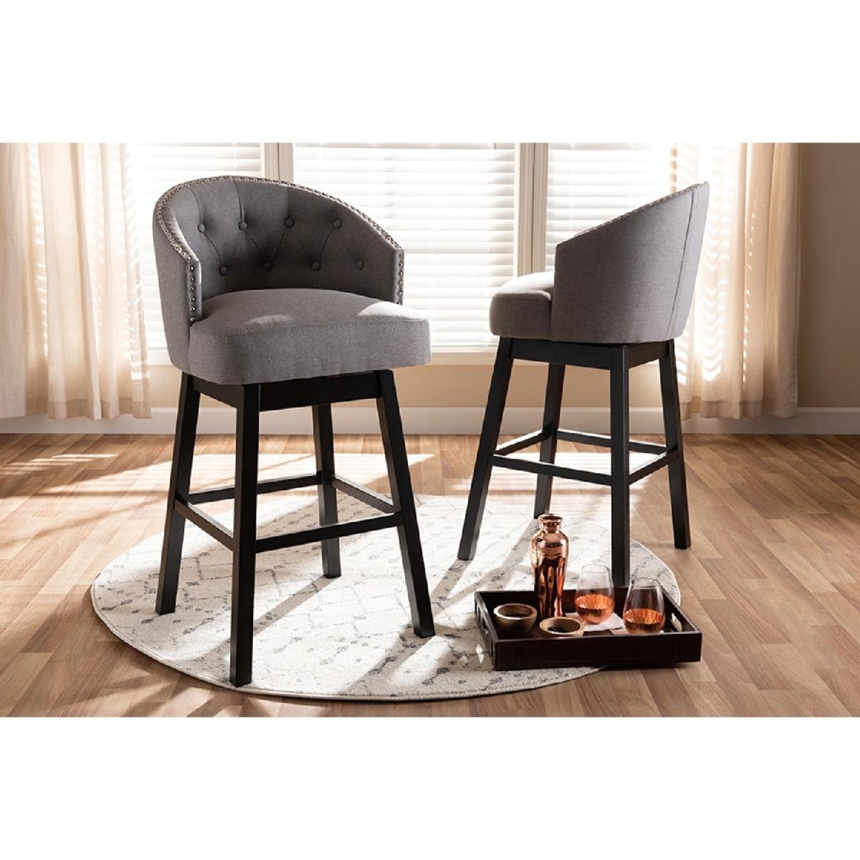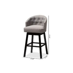 Baxton Studio Theron Transitional Gray Fabric Upholstered Wood Swivel Bar Stool Set of 2 Bring happy hour to your home with the elegant Theron bar stool. Constructed from solid rubberwood, the Theron showcases a stunning dark brown finish. The seat and back are upholstered in polyester fabric and padded with foam for endless comfort as you sip cocktails. A built-in foot rest provides additional comfort, while button tufting and silver-finished nailheads add a touch of glamour. Equipped with swivel capability, the Theron is well suited for both a kitchen or bar setting. The Theron bar stool is made in Malaysia and requires assembly.
