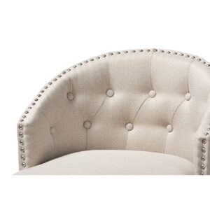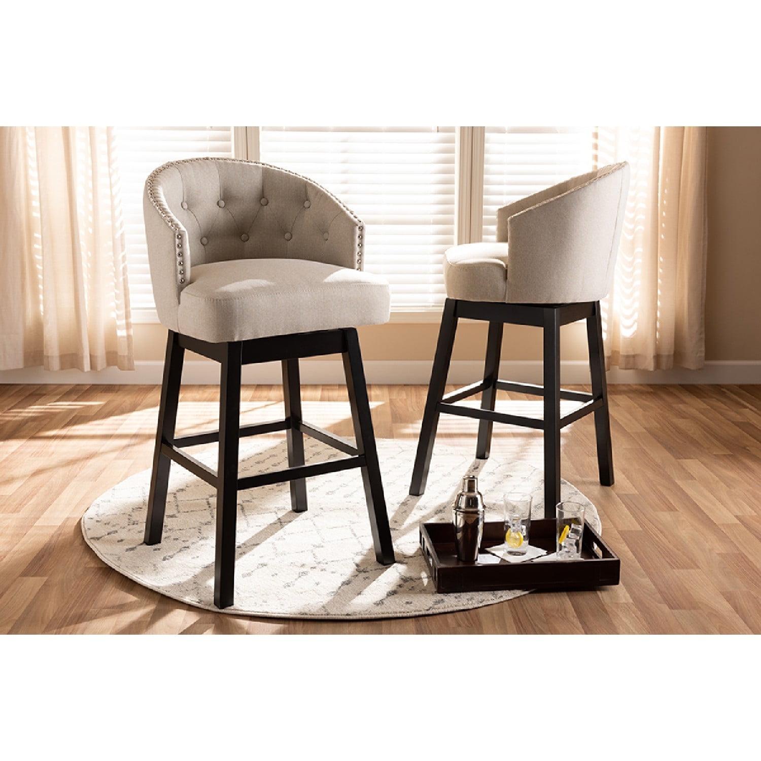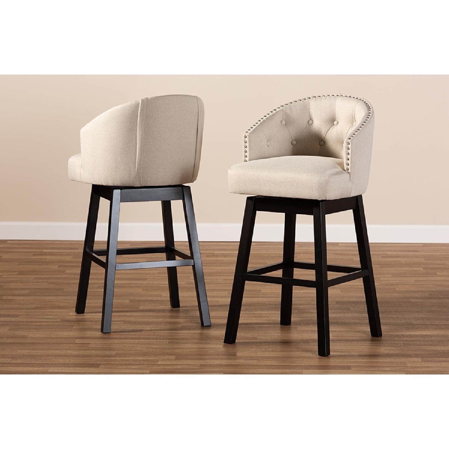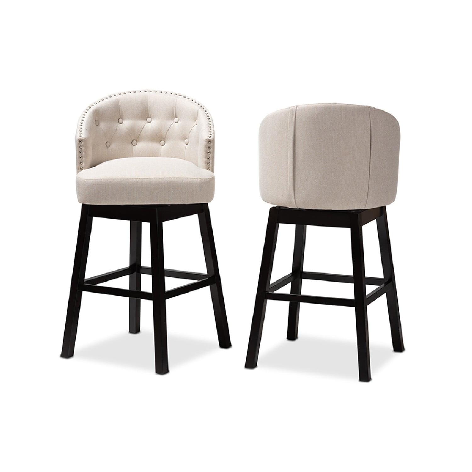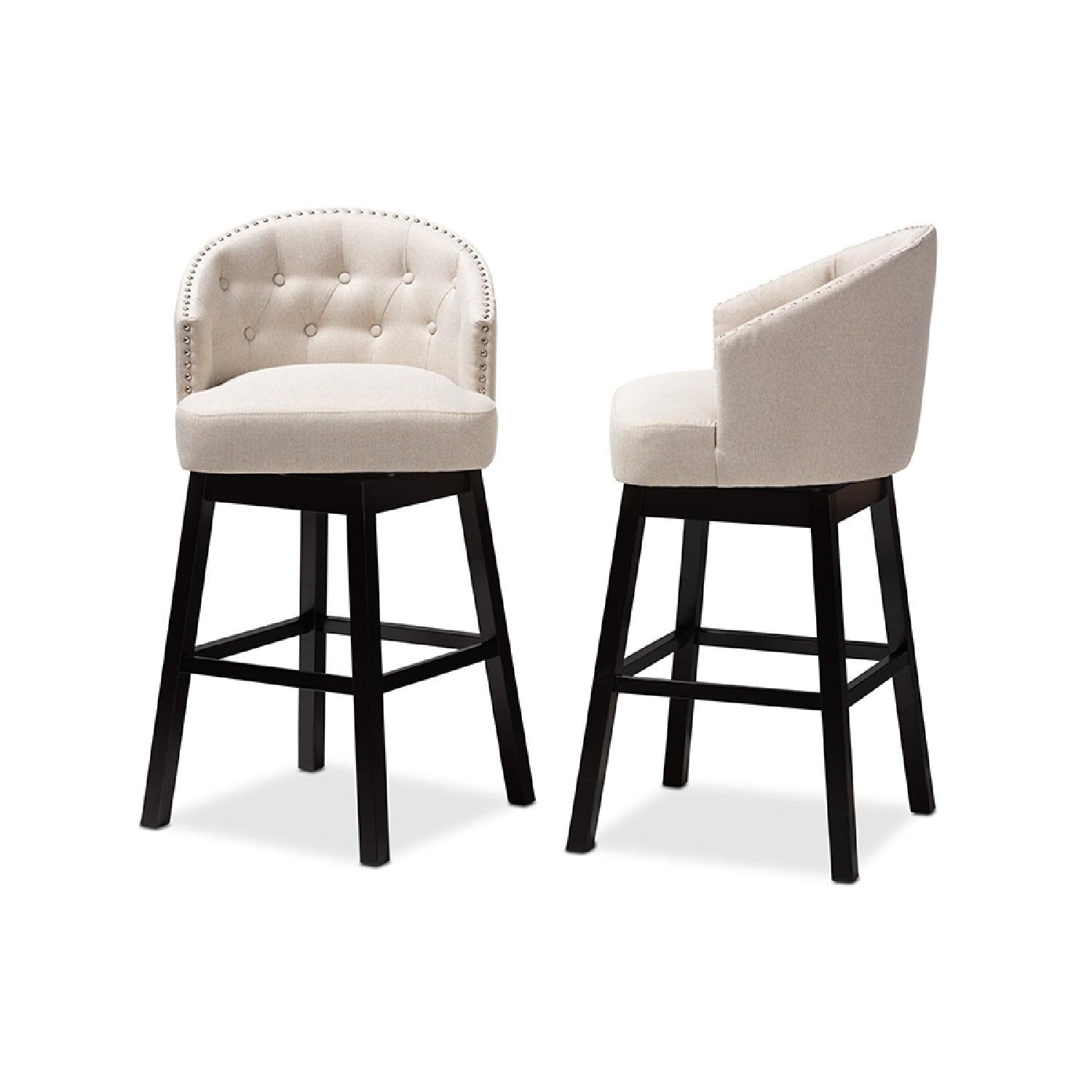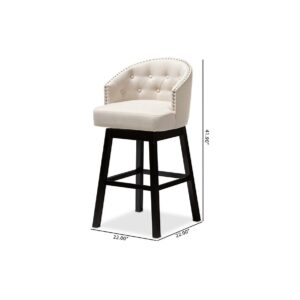 Baxton Studio Theron Transitional Light Beige Fabric Upholstered Wood Swivel Bar Stool Set of 2 Bring happy hour to your home with the elegant Theron bar stool. Constructed from solid rubberwood, the Theron showcases a stunning dark brown finish. The seat and back are upholstered in polyester fabric and padded with foam for endless comfort as you sip cocktails. A built-in foot rest provides additional comfort, while button tufting and silver-finished nailheads add a touch of glamour. Equipped with swivel capability, the Theron is well suited for both a kitchen or bar setting. The Theron bar stool is made in Malaysia and requires assembly.