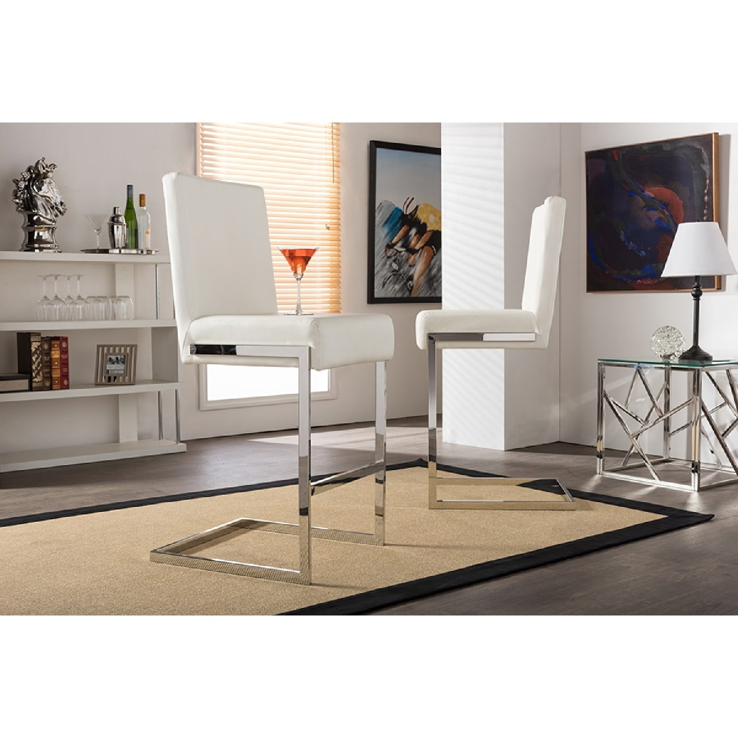 Baxton Studio Toulan Modern and Contemporary White Faux Leather Upholstered Stainless Steel Barstool (Set of 2) High-polished stainless steel sled base frame gives Toulon barstool a striking silhouette, and the feel is actually quite comfortable. Thanks to the extra thick cushion covered in durable white faux leather, Toulon barstool will bring a sophisticated modern look to your dining room, kitchen space or home bar at an affordable price. The Toulan bar chair is an elegant combination of modern design and comfort. Made in China, the bar chair requires assembly. Specifications: Modern and contemporary upholstered Barstool Clean lines and geometric design High-polished stainless steel sled base frame Faux Leather to complete the look Plush foam filled ultra thick cushion
