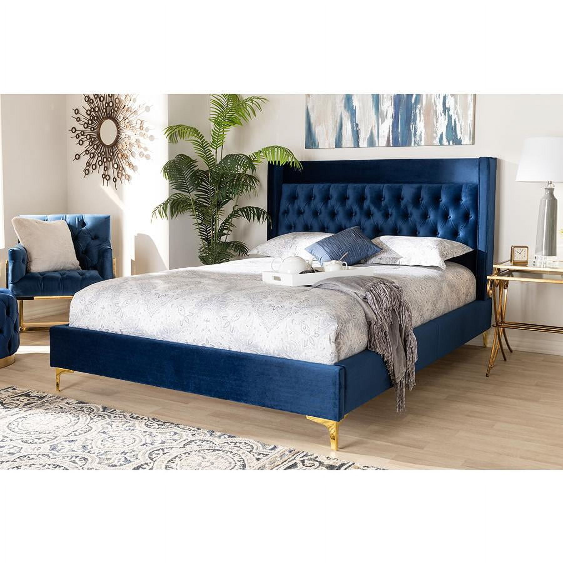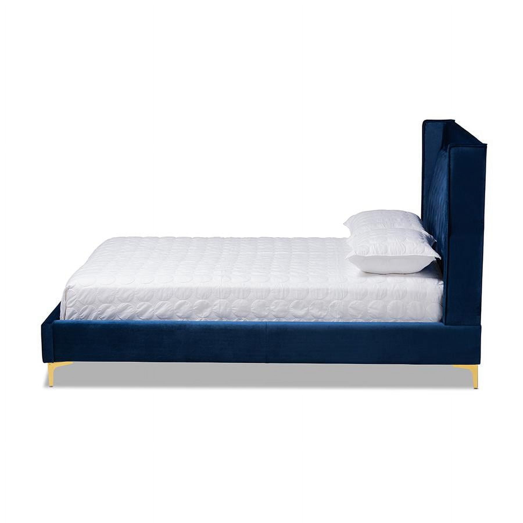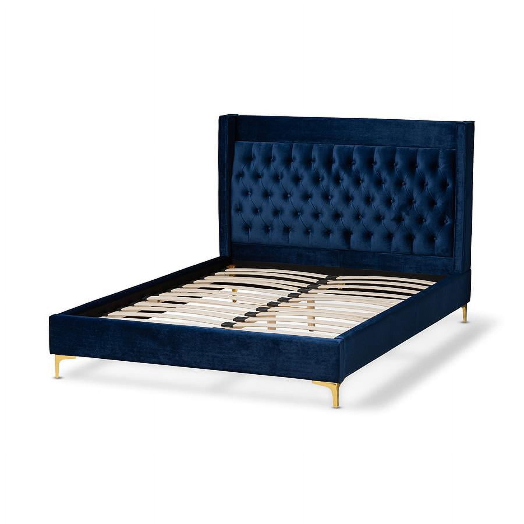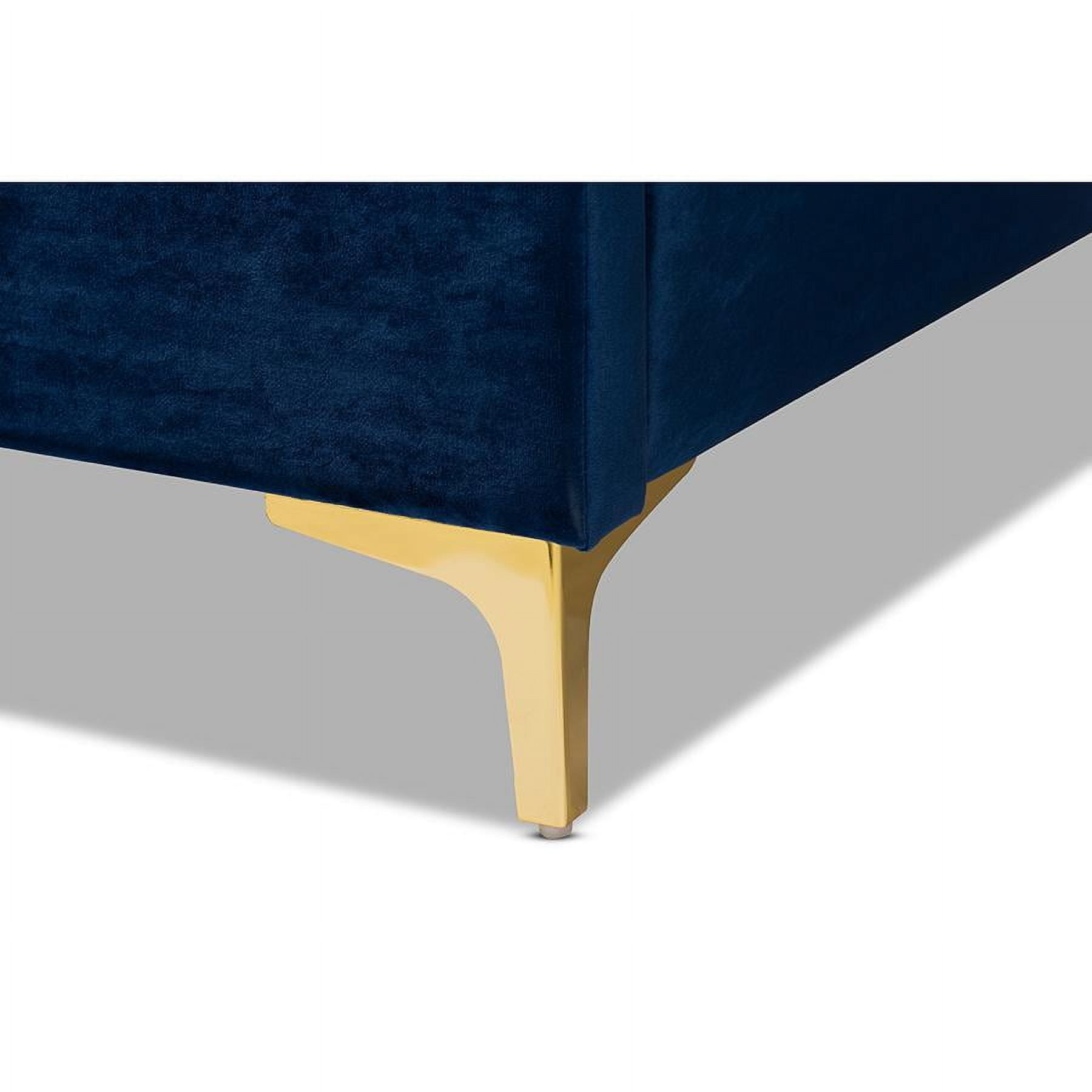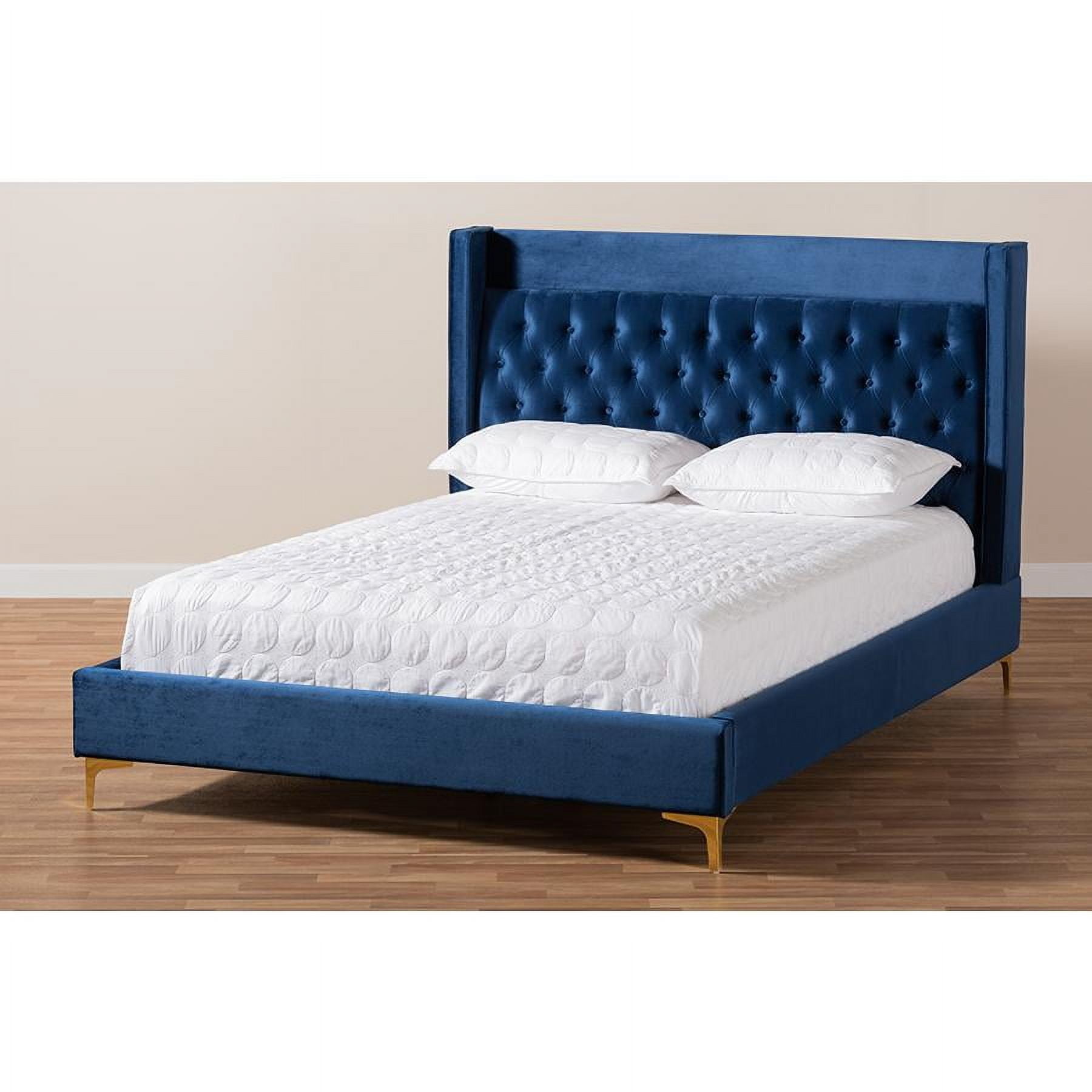 Baxton Studio Valery Modern and Contemporary Navy Blue Velvet Fabric Upholstered Queen Size Platform Bed with Gold-Finished Legs
