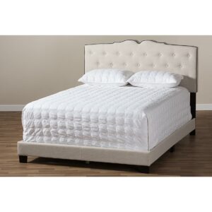 Baxton Studio Vivienne Modern and Contemporary Light Beige Fabric Upholstered King Size Bed The details put into the design of the Vivienne king size bed are what make it both stylish and fun. The modern and contemporary-inspired design features light beige fabric upholstery and low profile footboard styling. The headboard of the Vivienne showcases a graceful, subtle scroll design at the top, with piping all around the edges. The headboard also features foam-padding for comfort and tasteful button-tufting. The Vivienne is a charming piece, perfect for refreshing your guest room – or as a treat to yourself in your own bedroom. The bed is designed for use with a box spring and mattress. Made in Malaysia, the Vivienne requires assembly.