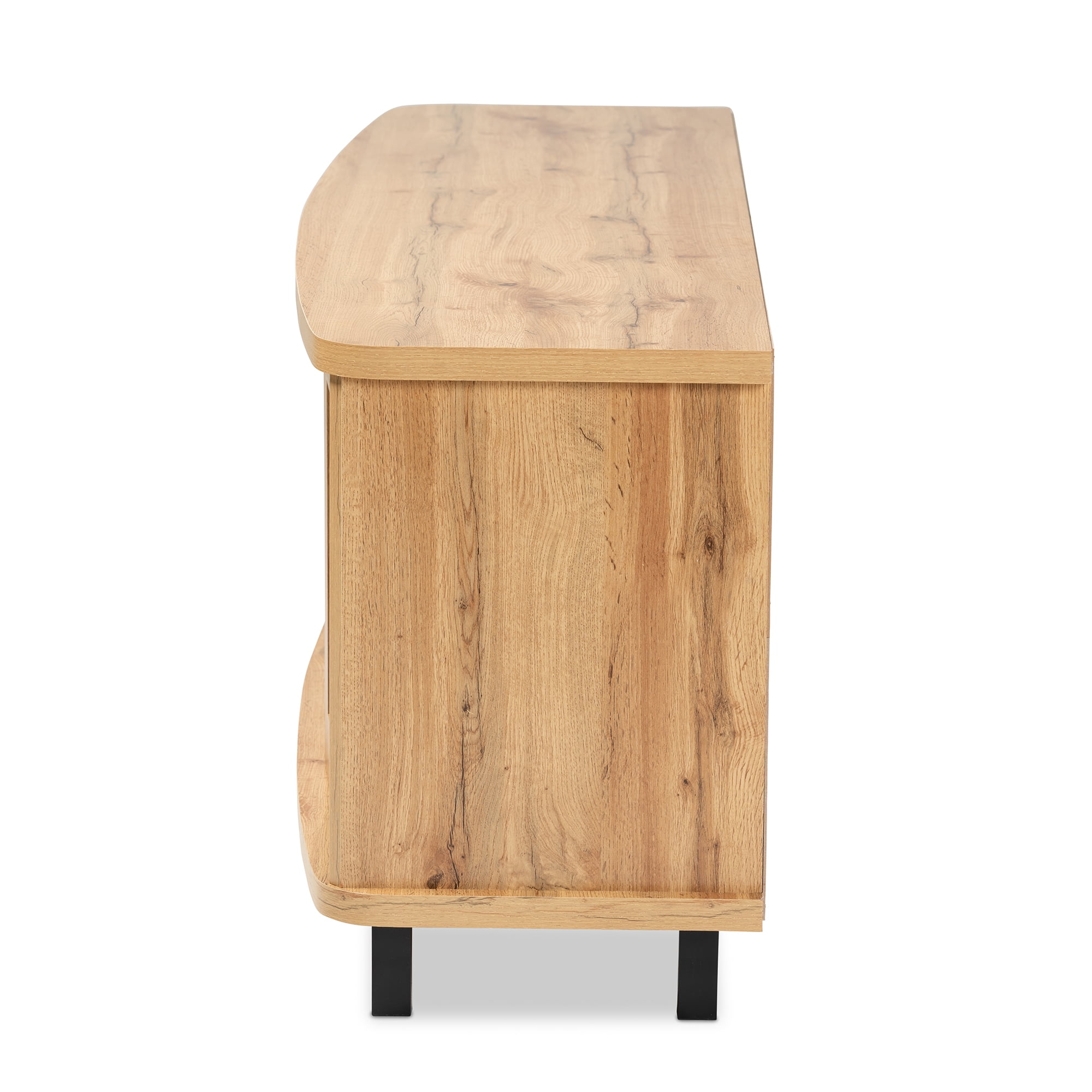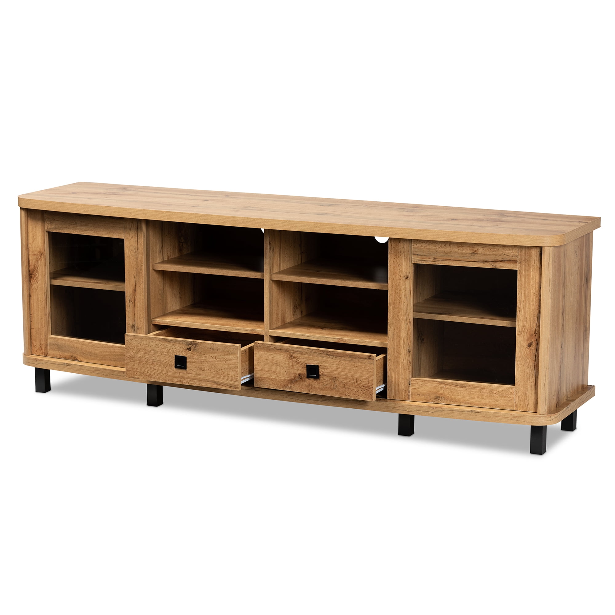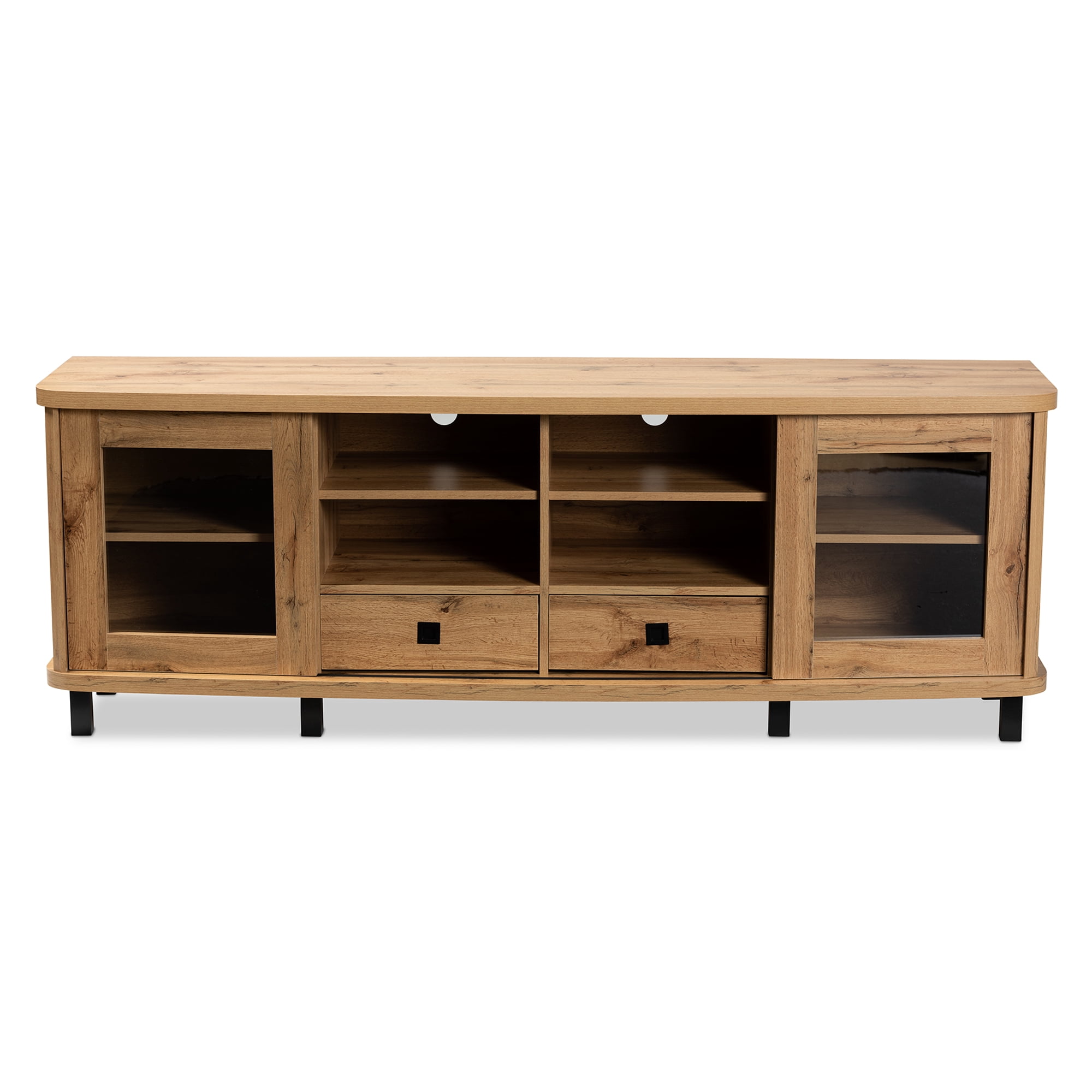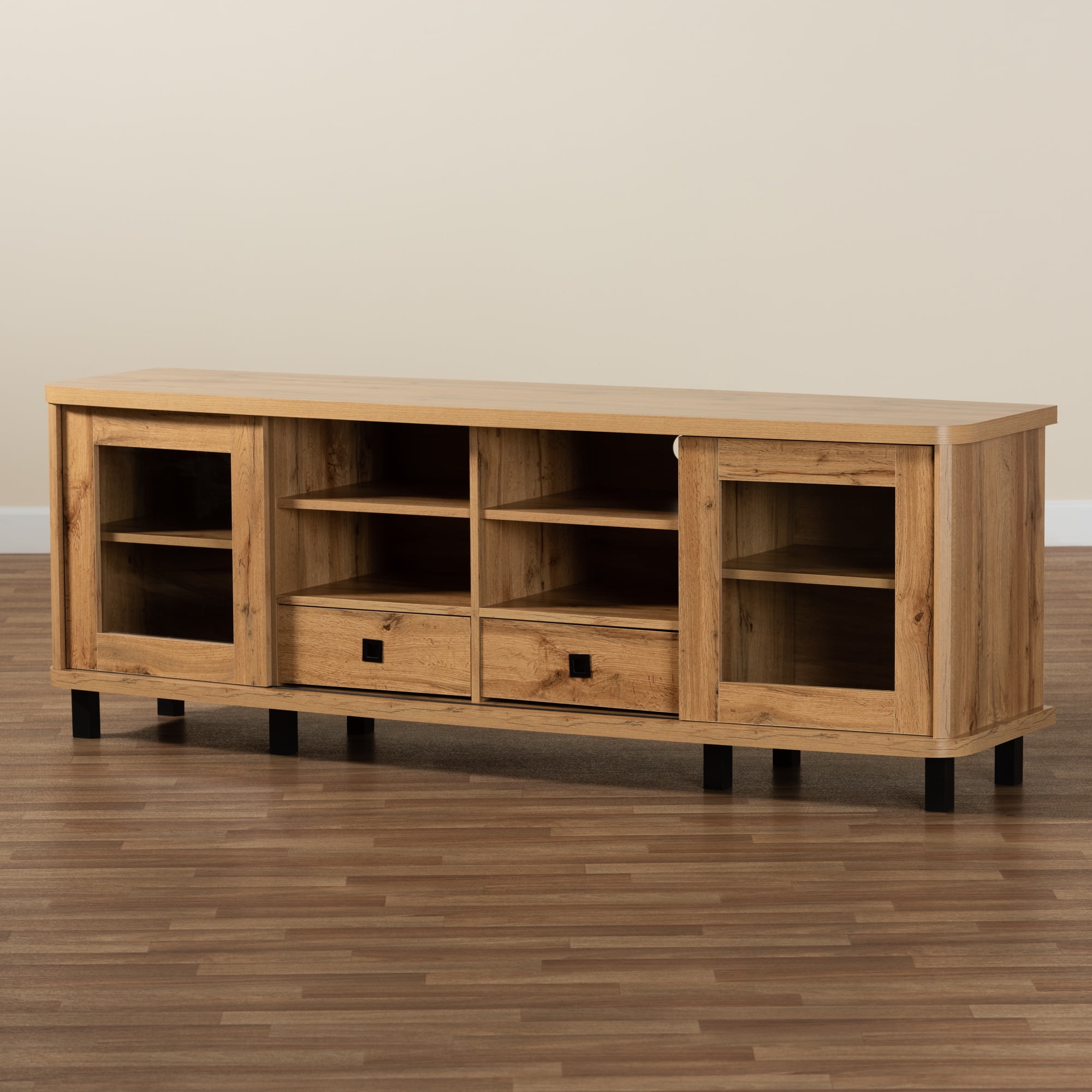 Give your living room a sleek and practical focal point with the Walda TV stand. Made in Malaysia, this TV stand is constructed from natural oak brown finished wood that blends well with a variety of modern room layouts. Four open shelves offer ample room to organize media devices, while two drawers and four additional shelves behind the sliding glass doors provide exceptional storage space. Requiring assembly, the Walda features two cord management holes in its back panel for quick and easy setup. A handy addition steeped in contemporary style, the Walda TV stand elevates the feel of any living room.