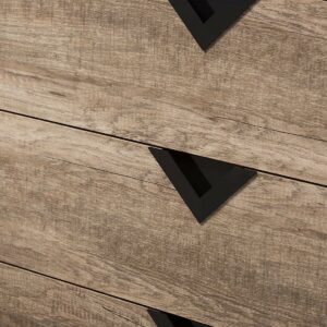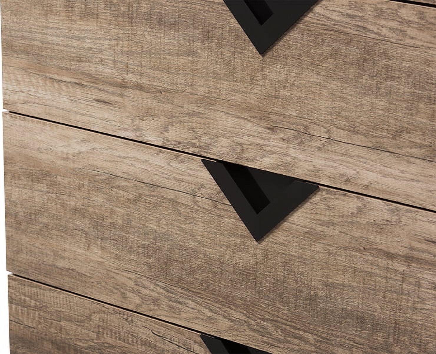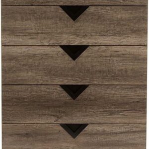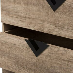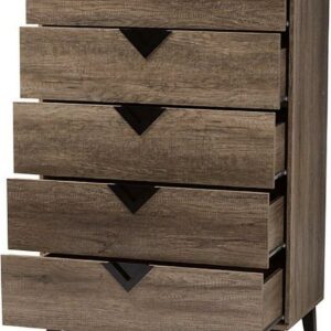 Baxton Studio Wales Modern and Contemporary Light Brown Wood 5-Drawer Chest The Wales 5-drawer dresser combines function and modern style. On a geometric silhouette, this oak veneered dresser features five drawers with black triangle vinyl handles. Angled, black legs support the Wales dresser while contrasting with the oak veneered finishing. Constructed of engineered wood, the dresser is built to last. The Wales comes with five pull-out drawers on metal runners for a smooth movement for your clothes and linens. The under clearance area allows you the dust as often as you like to keep the area clean. Made in Malaysia, the Wales dresser requires assembly.