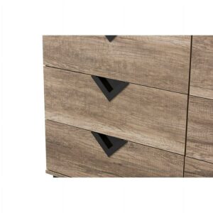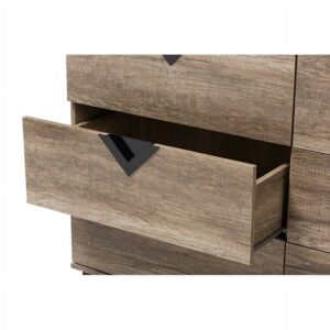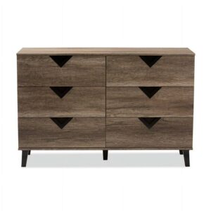 Baxton Studio Wales Modern and Contemporary Light Brown Wood 6-Drawer Dresser The Wales 6-drawer dresser combines function and modern style. On a geometric silhouette, this oak veneered dresser features six drawers with black triangle vinyl handles. Angled, black legs support the Wales dresser while contrasting with the oak veneered finishing. Constructed of engineered wood, the dresser is built to last. The Wales comes with six pull-out drawers on metal runners for a smooth movement for your clothes and linens. The under clearance area allows you the dust as often as you like to keep the area clean. Made in Malaysia, the Wales dresser requires assembly.