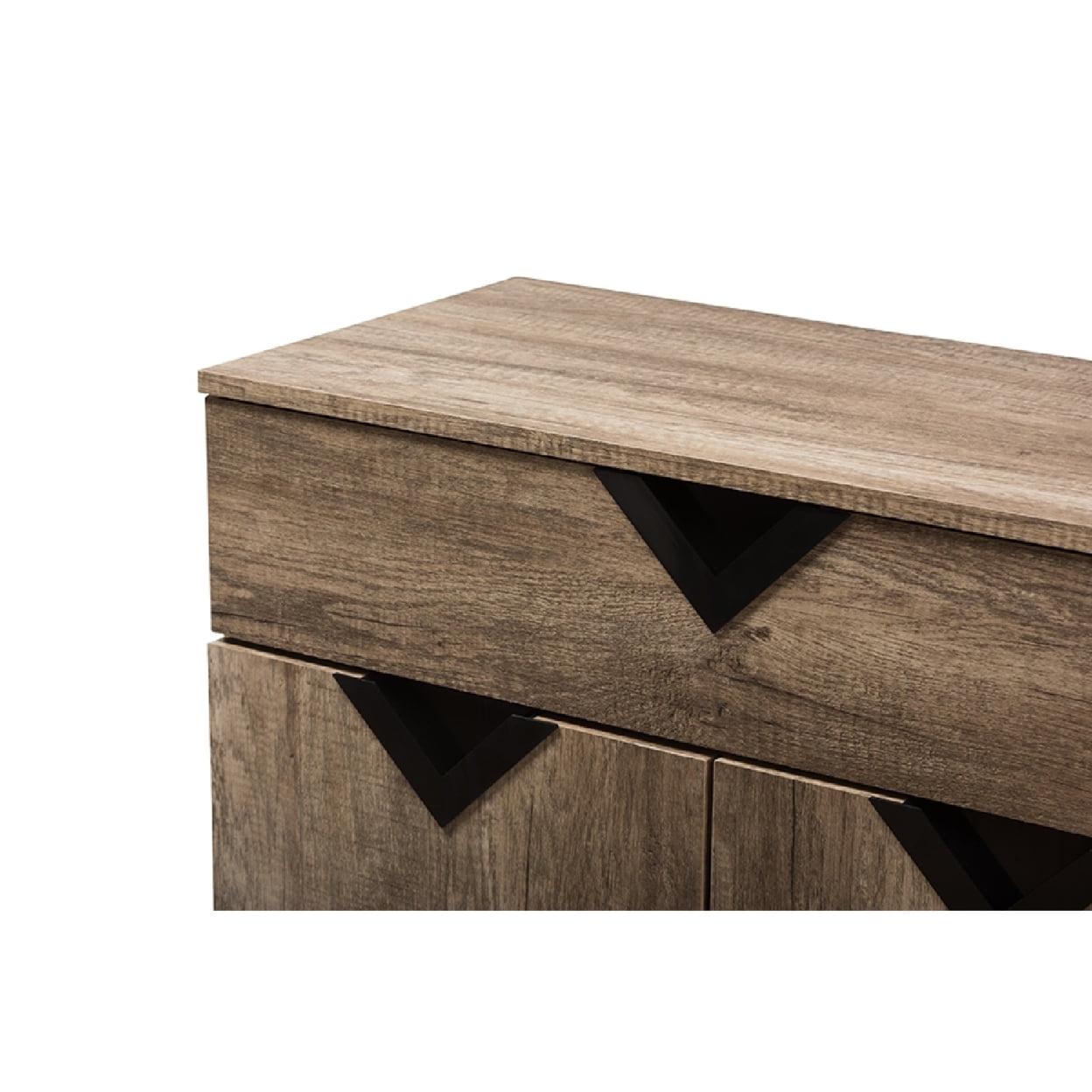 Baxton Studio Wales Modern and Contemporary Light Brown Wood Shoe Storage Cabinet The Wales shoe storage cabinet combines function and modern style. On a geometric silhouette, this oak veneered cabinet features two doors and a convenient top drawer with black triangle vinyl handles. The angled legs in black, supporting the storage cabinet while contrasting with the oak veneered finishing. Constructed of engineered wood, the cabinet is built to last. The cabinet comes with four shelves behind two hinged doors, enabling the storage of shoes, books, media discs, umbrellas – this versatile cabinet is a stylish and discreet way to keep your entryways or living rooms tidy and organized. The under clearance area allows you the dust as often to keep the area clean. Made in Malaysia, the Wales shoe cabinet requires assembly.