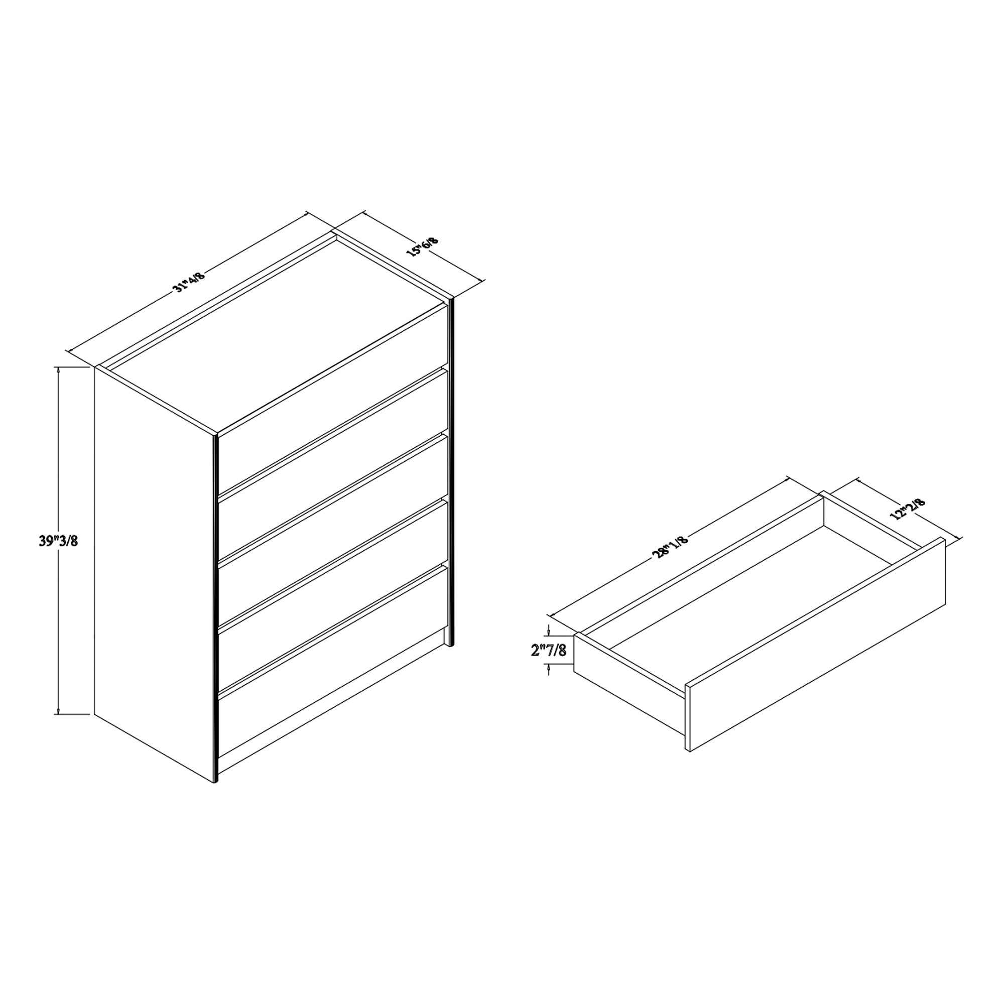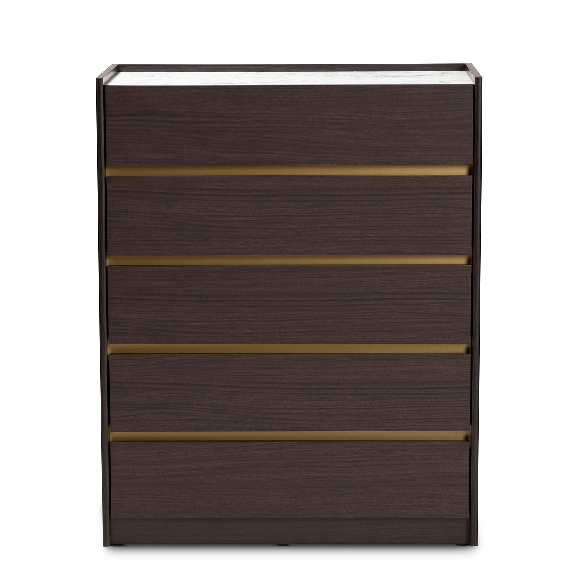 Constructed from engineered wood, faux marble, and polymer Dark brown and gold-tone finish Faux marble top Five (5) drawers Anti-topple kit included Assembly required Product Weight: 72.8 Pound Package Weight: 1 Pound Dimensions: 39.4″ High x 31.5″ Wide x 15.75″ Deep; Drawer Dimensions: 2.9″ High x 28.1″ Wide x 12.25″ Deep Product Color: Dark Brown/Marble/Gold Product Composition: MDF/PU Paper/Plastic