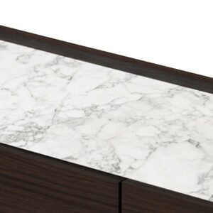 The sleek, modern flair of the Walker dresser organizes your space in stunning style. Made in Malaysia, the Walker radiates rich wood tones with its dark brown finished frame. Six spacious drawers, outlined in a striking gold-tone finish, help maintain busy rooms with ample storage space for clothes, linens, and more. Requiring assembly, the Walker features a faux marble top for a luxurious accent steeped in modern glamour. With its radiant design and flexible convenience, the Walker dresser is a superb addition to any space.