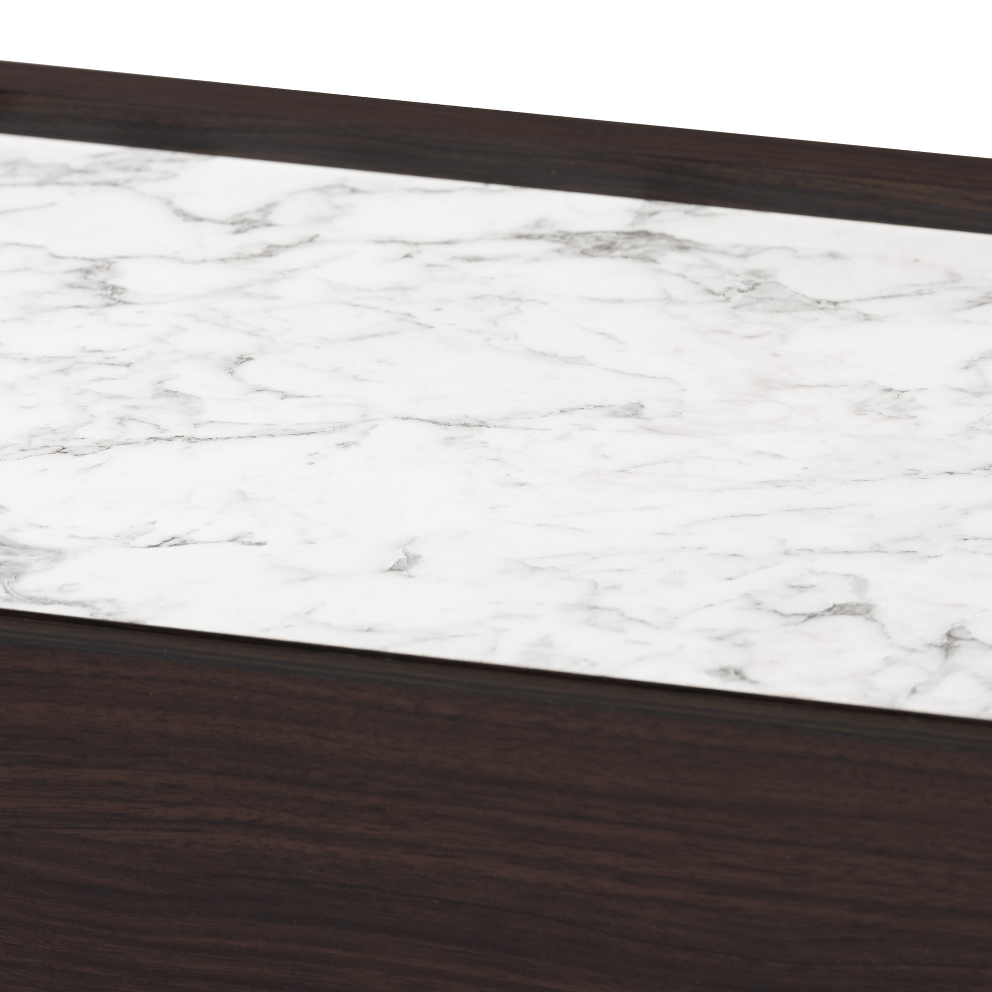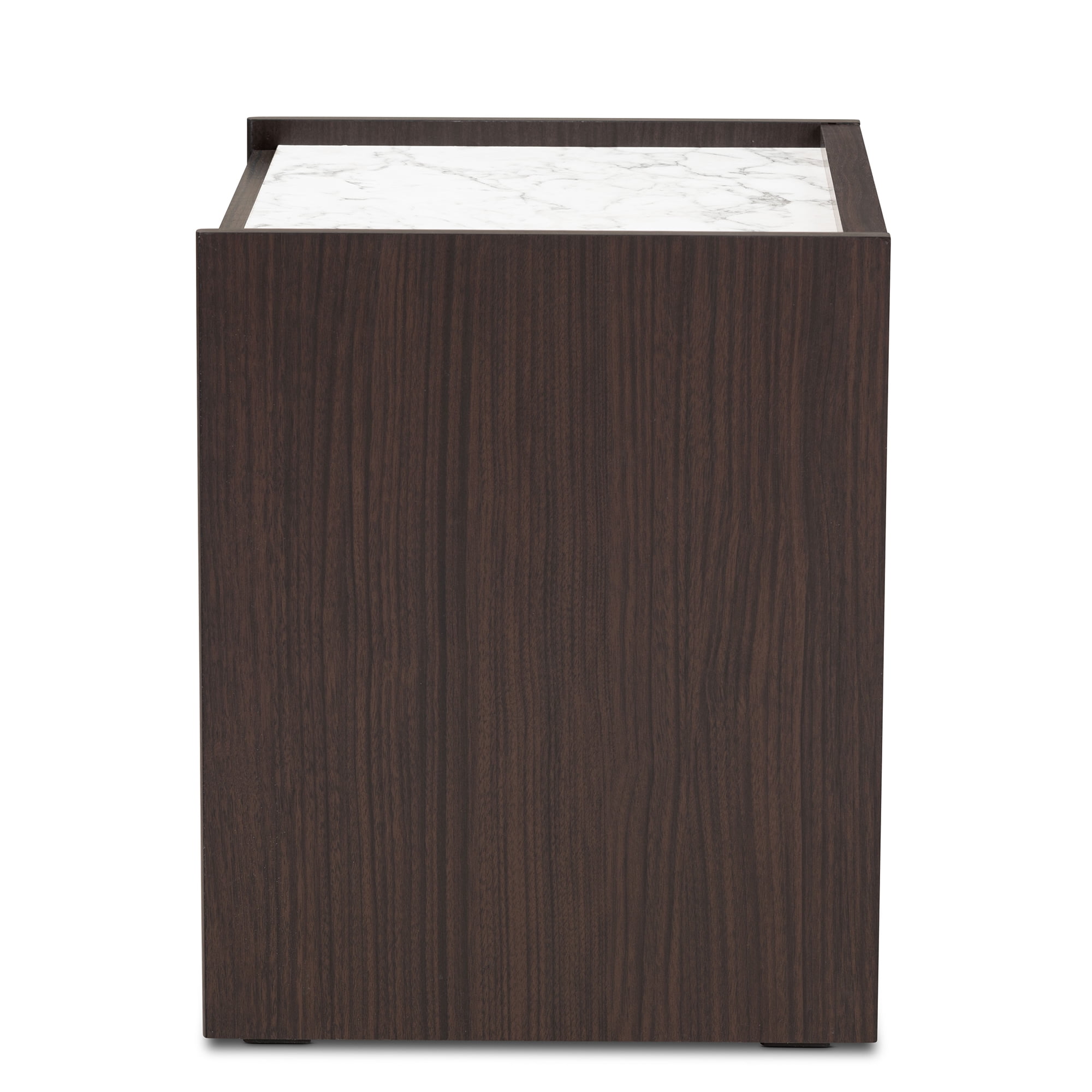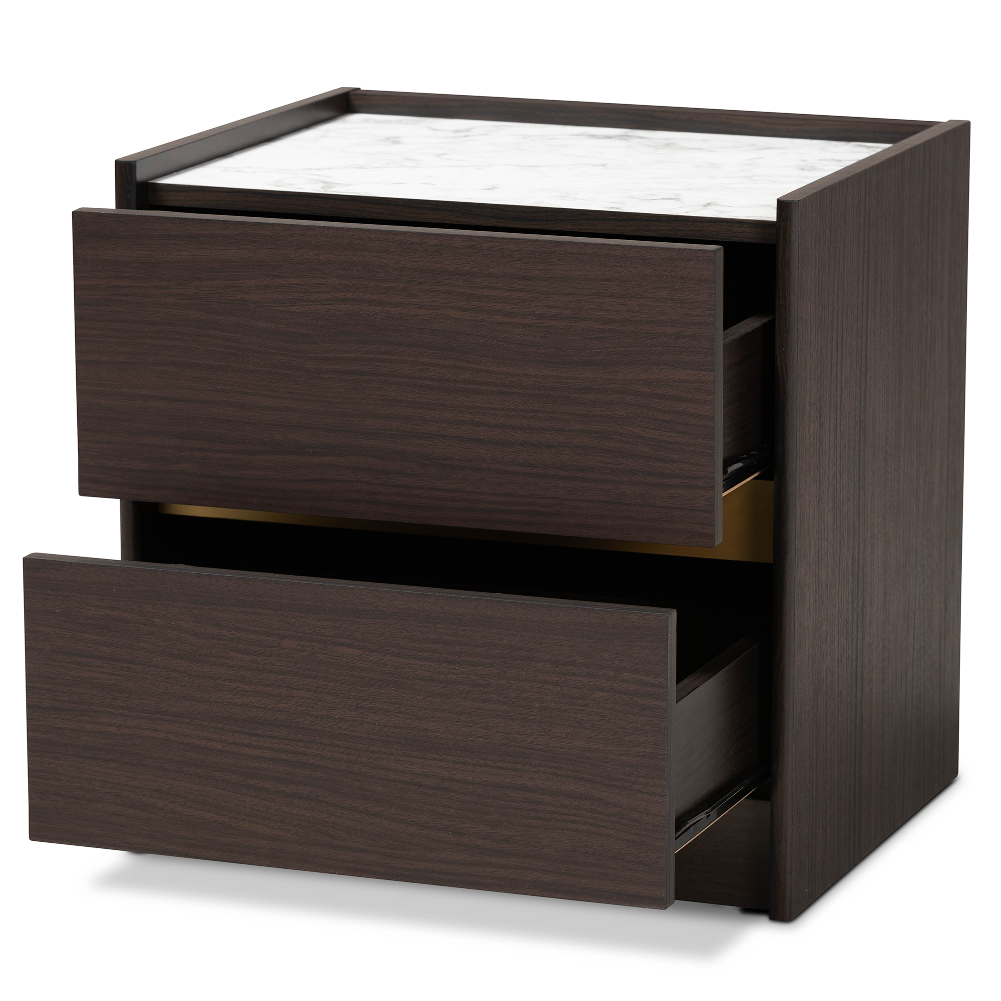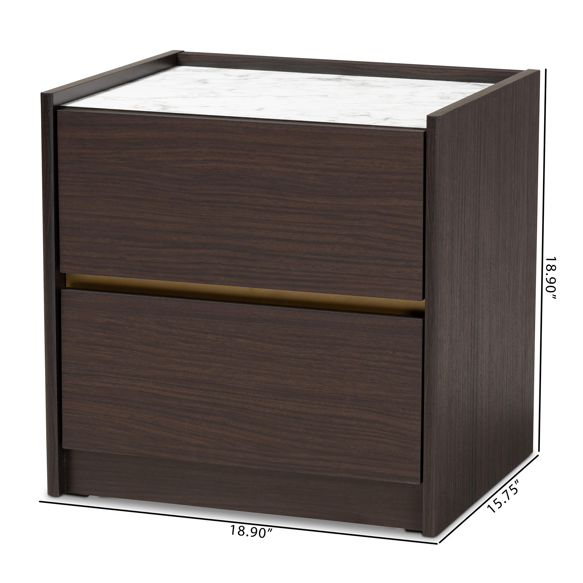 The sleek, modern flair of the Walker nightstand organizes your space in stunning style. Made in Malaysia, the Walker radiates rich wood tones with its dark brown finished frame. Two spacious drawers accommodate your lifestyle with plenty of space for bedside essentials. Requiring assembly, the Walker features a touch of gold, as well as a faux marble top, for luxurious accents steeped in modern glamour. With its radiant design and flexible convenience, the Walker nightstand is a superb addition to any space.