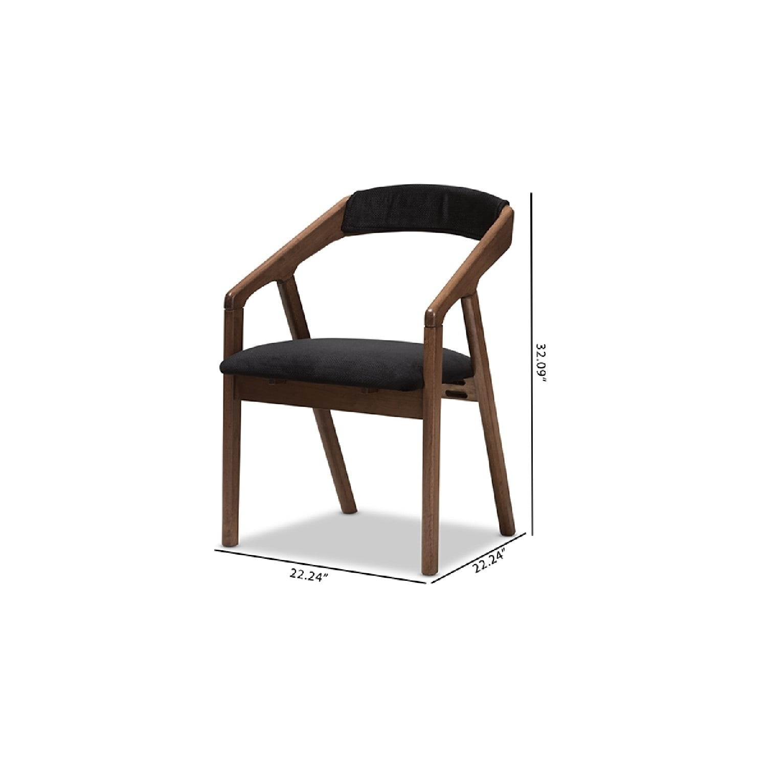 Dimensions: 22.24W x 22.24D x 32.09H in. Solid rubberwood frame and foam padded seat with polyester fabric upholstery Walnut finish with black velvet upholstery Modern arm chair design Set of 2 dining arm chairs