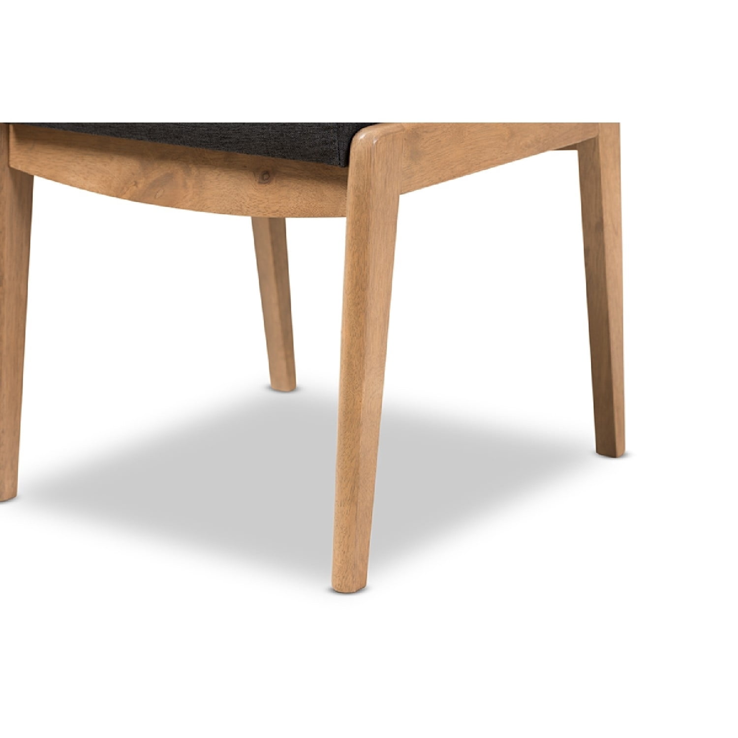 Dimensions: 17.91W x 18.31D x 19.09H in. 100% Polyester fabric upholstery Made of solid rubber wood Gray fabric and natural wood finish Modern style Contoured cushion for maximum comfort