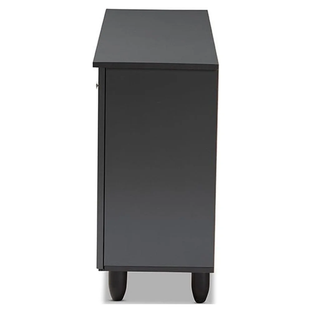Sold as 1 Each. Constructed from engineered wood in a dark grey finish. PVC legs. Baxton Studio offers a 30-Day parts replacement warranty on all items. If you experience any issue with your product, please contact us [email protected]. Four (4) shelves provide storage for up 12 pairs of shoes. Silver hardware. WARNING: California Proposition 65 Warning. This product can expose you to chemicals including lead, which are known to the State of California to cause cancer and birth defects or other reproductive harm. For more information go to . Slits in doors provide ventilation and deter mold growth. Assembly required. Magnetic door closures. Dimensions: 26.3″ High x 44.88″ Wide x 13.23″ Deep; Left Shelves: 6.9″ High x 28.03″ Wide x 9.25″ Deep; Right Shelves: 6.9″ High x 14″ Wide x 9.25″ Deep; Legs: 3.74″ High.