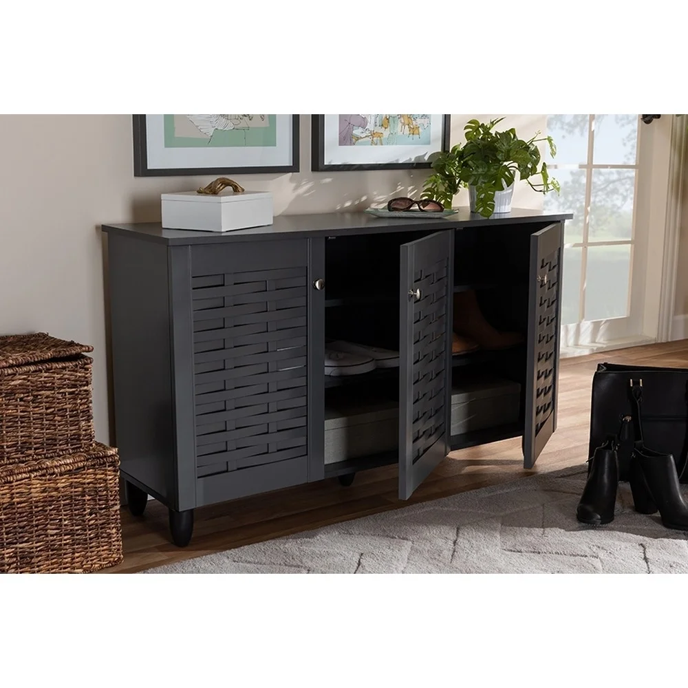 Baxton Studio Winda Modern and Contemporary Dark Gray 3-Door Wooden Entryway Shoe Storage Cabinet Keep your shoes organized and out of sight with the Winda cabinet. Featuring a stylish contemporary design and dark grey finish, the Winda is easy to coordinate with any style of decor. Three doors conceal four shelves with storage space for up to 12 pairs of shoes. Slits are embedded within the doors to enable air circulation and prevent mold growth on your shoes. The Winda cabinet is made in Malaysia and requires assembly. Specifications: Constructed from engineered wood in a dark grey finish Four (4) shelves provide storage for up 12 pairs of shoes Slits in doors provide ventilation and deter mold growth Magnetic door closures PVC legs Silver hardware Assembly required