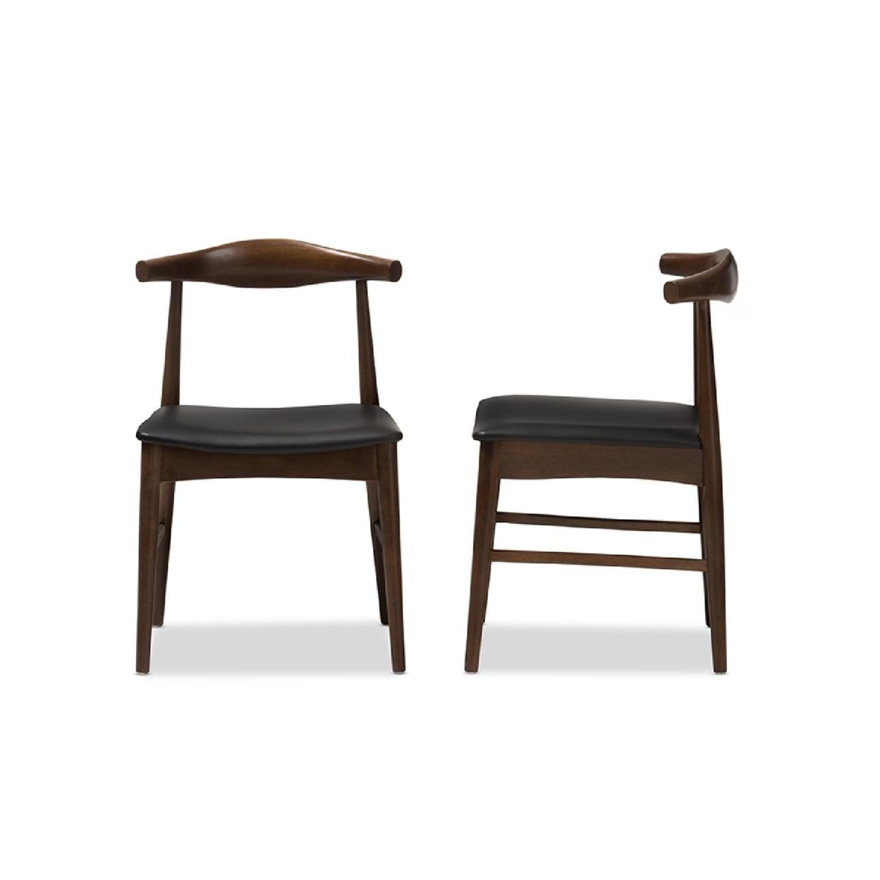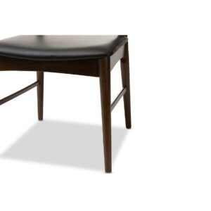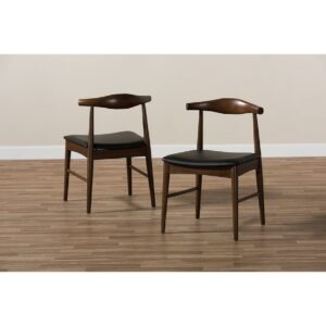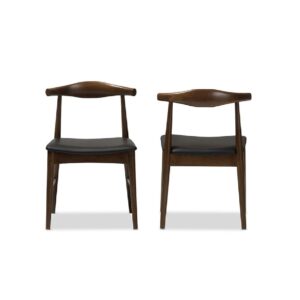 Baxton Studio Winton Mid-Century Modern Walnut Wood Dining Chair (Set of 2) Experience effortless style with the Winton dining chair. The mid-century modern-inspired style is clear to see in the low-profile and smooth, clean lines of this chair. Constructed of walnut-finished, solid rubberwood with stretchers for support, the Winton is made to last. The chair features a padded, black faux-leather seat for style and comfort. The Winton’s low profile design makes it adaptable for more than use as a dining chair – you can use it as a stylish desk chair, a warm accent to your living room, or a simple way to freshen-up reception and waiting areas. Possibilities abound with the Winton. Made in Malaysia, this chair requires assembly.
