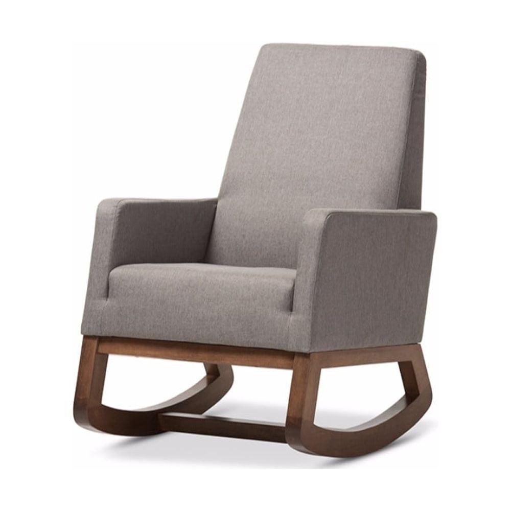 Baxton Studio Yashiya Mid-century Retro Modern Grey Fabric Upholstered Rocking Chair Inspired by mid-century modern design, the Yashiya rocking chair has blended the retro feel of a vintage upholstered rocking chair with the quality, made-to-last design youd expect from a modern piece of furniture. The result is our exclusive Yashiya Rocking Chair. Featuring polyester fabric in grey and a sturdy wood frame in a beautiful walnut finishing, this retro rocking chair feels right at home in a nursery, living room or any shared space. High back contoured design and ergonomic arm height add more charms to this piece. The Yashiya looks smart, modern, but comfortable can be a good rocking chair for nursery during middle of the night feedings and yet a pretty piece of furniture to accent the room. Made in Malaysia, the Yashiya requires assembly.
