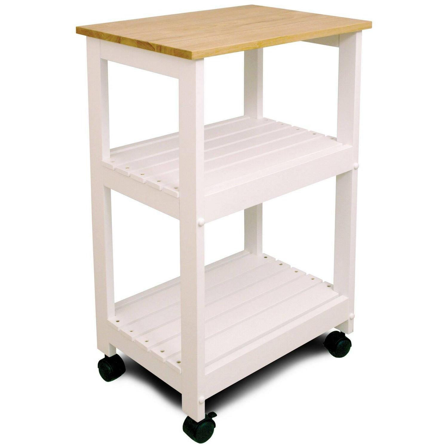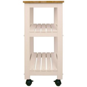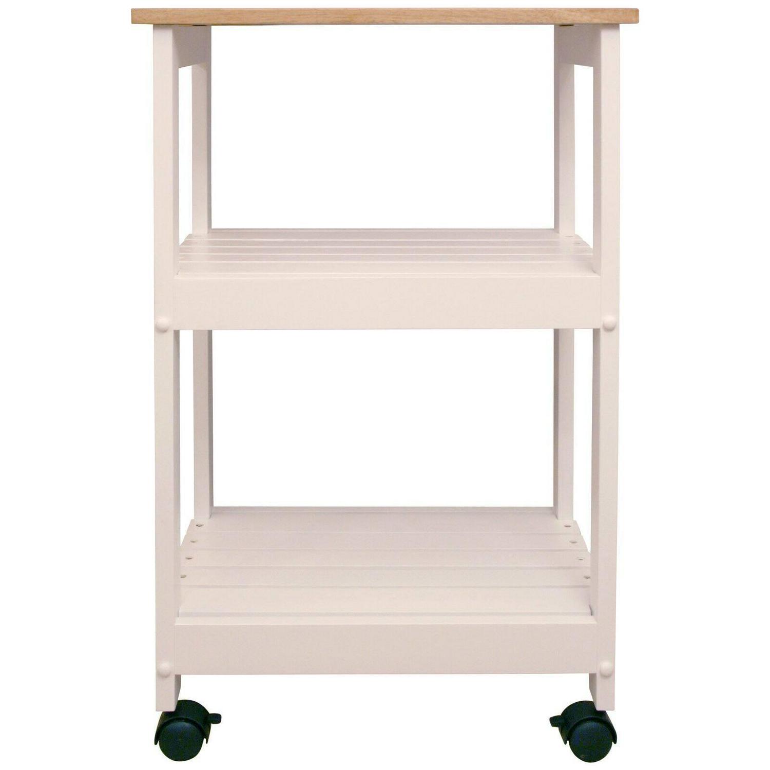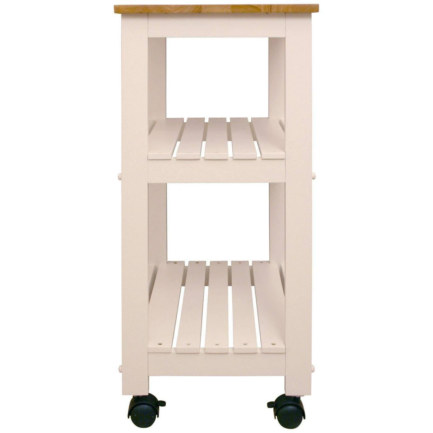 The Baywood Cart offers a classic design and plenty of storage space. This kitchen cart is made of a sturdy, solid wood and is complete with its white lacquered base. It also features a large capacity slatted shelves for storage. This cart is equipped with heavy duty 3 inch wheels that make it easy to move from the kitchen to the dining room. The Baywood Cart will make a delightful addition to your kitchen.