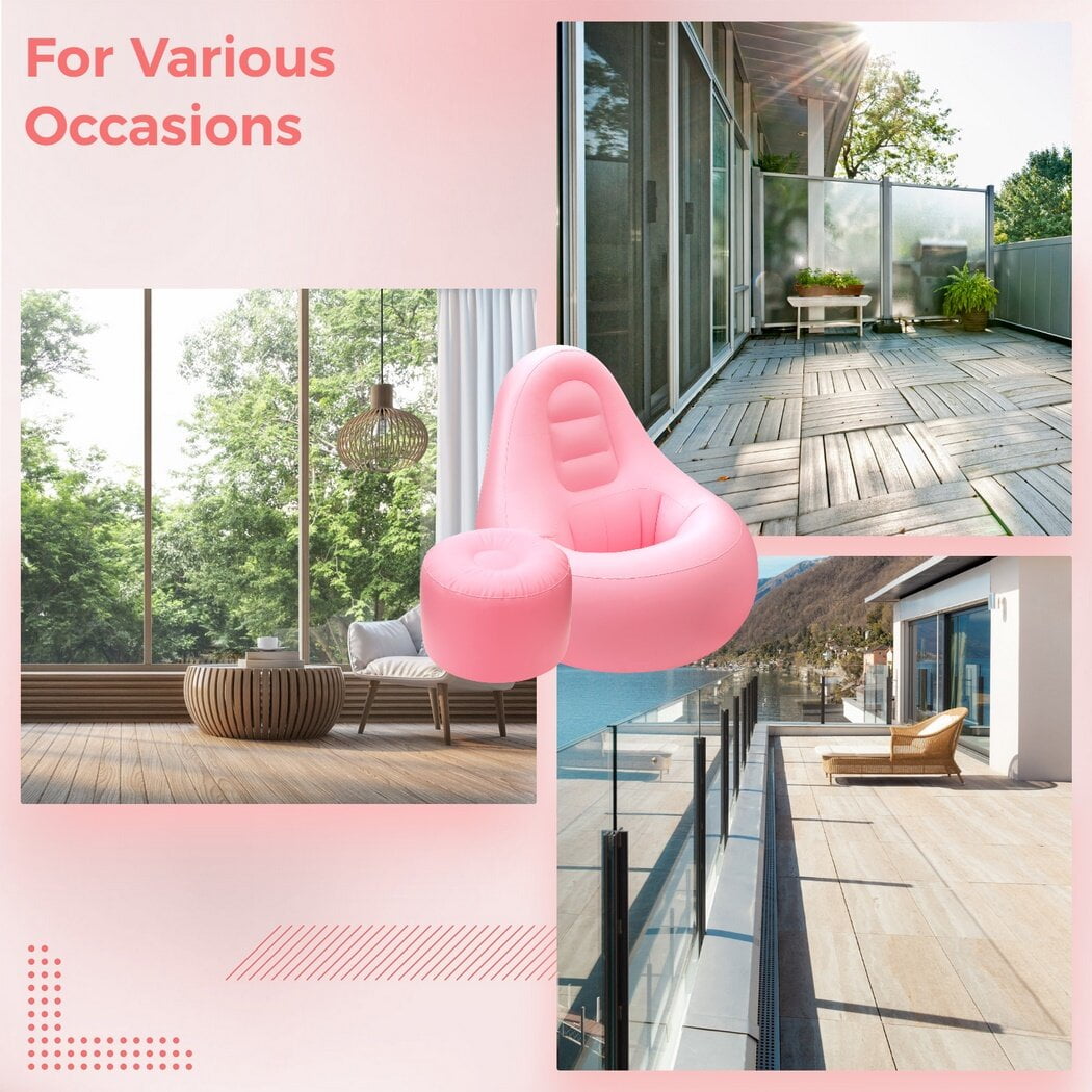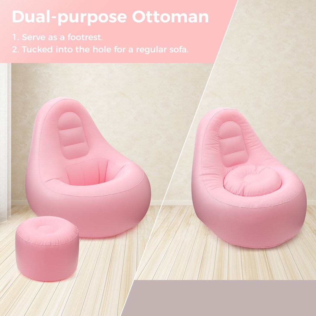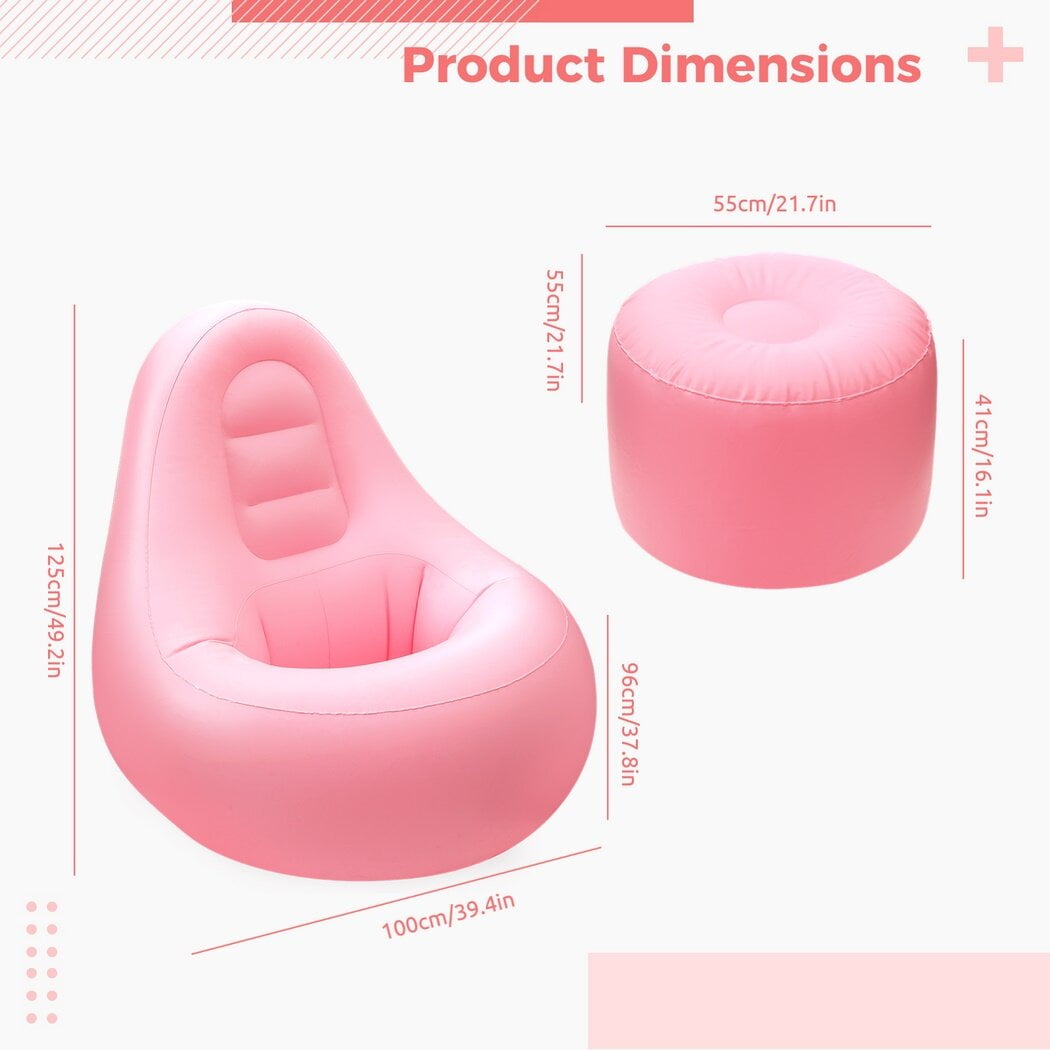 Color: pink Material: PVC Size: sofa: 49*39*38in, ottoman: 22*22*16in Package Includes: 1 pc * sofa, 1 pc * ottoman Note: – Please refer to the measurement. Tiny measuring error is allowable in normal range. – There might be a little color difference due to the monitor, camera or other factors, please refer to the physical item.
