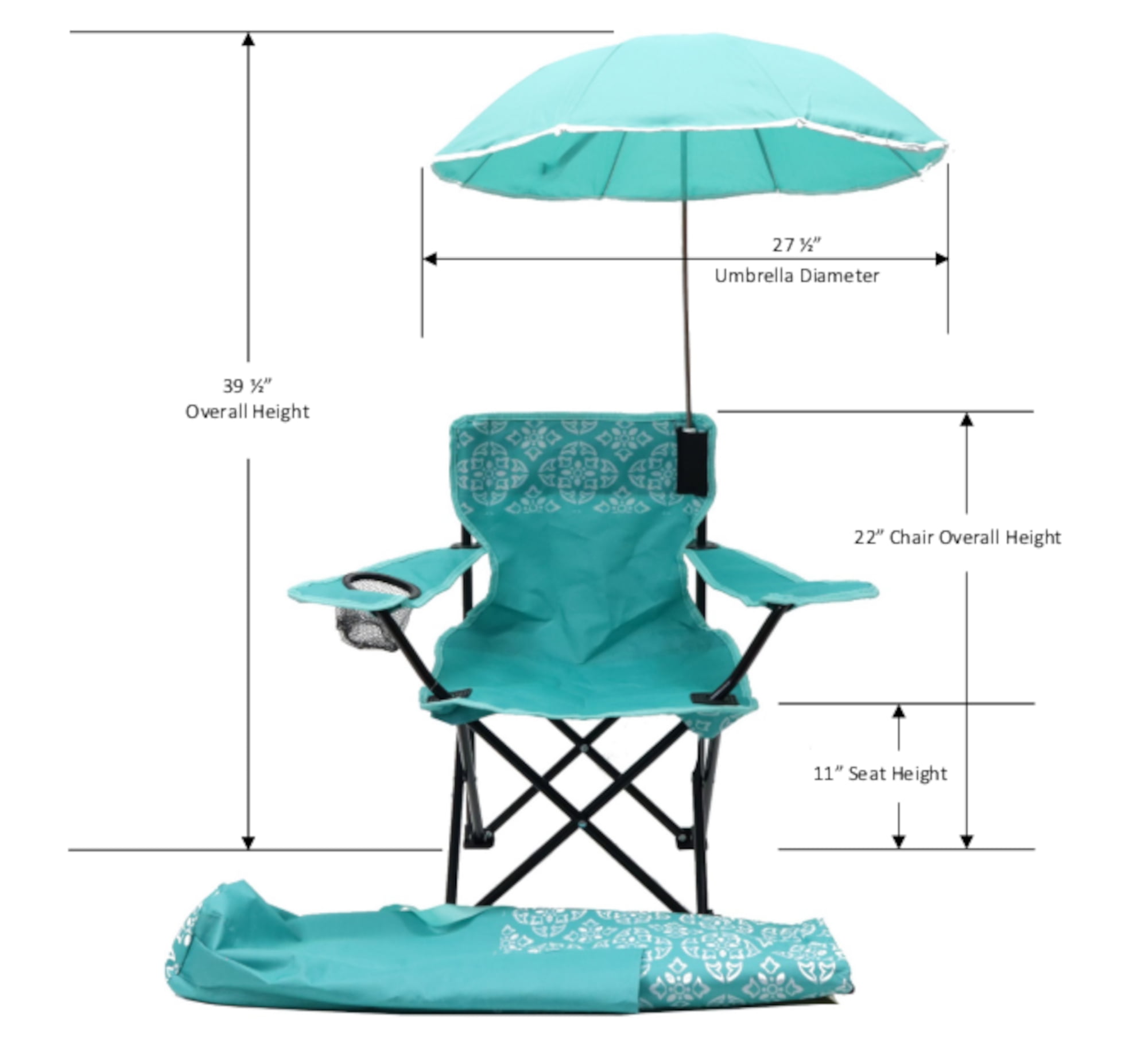Beach Baby toddler all-season umbrella chair Matching carry bag with double draw string and handy shoulder strap Dual safety chair locks to prevent inadvertant closing Provide protective shade for little ones in their own sized chair Convenient drink holder and arm rests Recommended for toddler ages 2 to 5 or 50# – Meets all US safety requirements for toddler chairs
