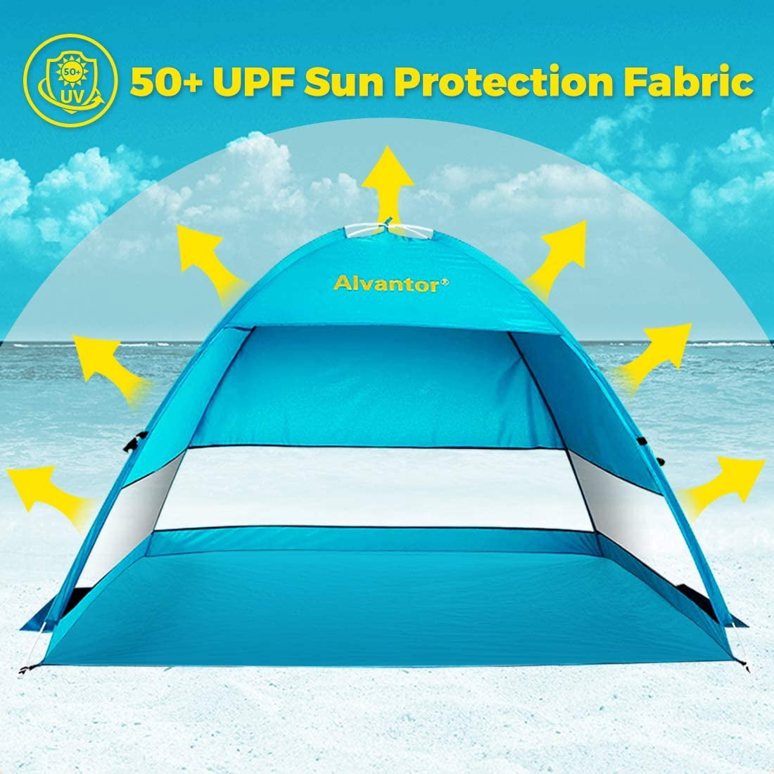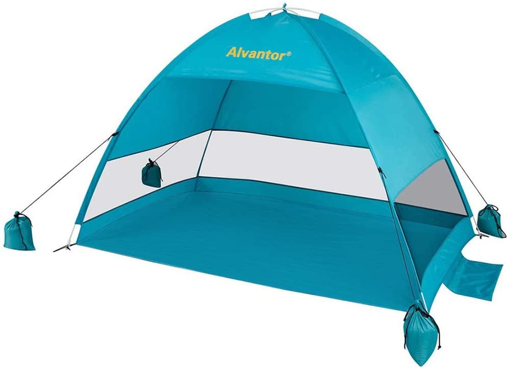 Super EASY up & down: this beach tent sun shelter pop up AUTOMATICAALY instant in a second. Sets up less than 30 seconds. Folds down handy, twist or figure 8, into roomy portable carrying bag, No need to struggle with this foldable beach sun shelter. Only 3 lbs! lightest sun shade beach tent on the market: new fiberglass frame, which is safe, durable and rust free, makes tent stably stand by itself and keeps shape after long time use. The new frame is 100% hassle free without those safety problems. Innovative design: 50+ UPF UV protection and water resistant fabric for walls and floor. 3 side mesh provides excellent ventilation. Includes 3 sand pockets and 4 extra sandbags Plus 4 stakes. This pop-up beach sun shelter is windproof up to 25 mph.