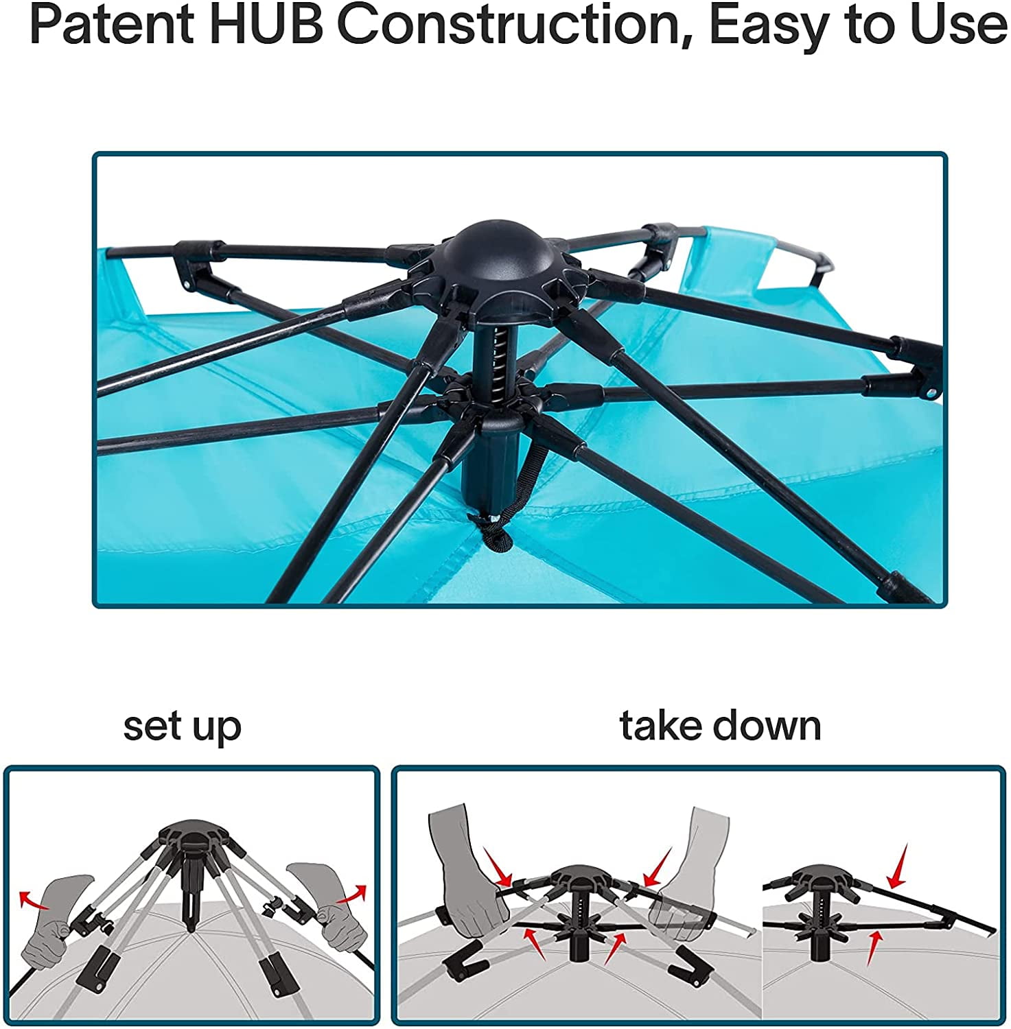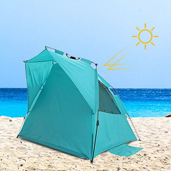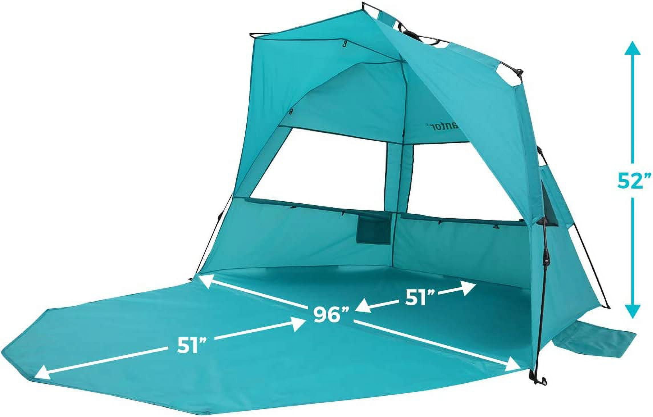 Description: GREAT FOR FAMILY TIME: This super cool beach tent is suitable for all ages who are trying to have a great time at hot beaches, camp sites, or parks. Families can relax and play all day in this portable beach tent. HALF DOME DESIGN: This vibrant beautiful teal color tent comes with 3 mesh windows that would be great for air flow. Our tent is very sturdy because it is supported by our unique 6-point support hub. We also included tent stakes for maximum stability. For extra support and stability we have included 5 fillable sand bags to weigh down the tent. It also provides 50+ UPF sun protection. EASY SET-UP & STORAGE: Setting up this Beach Tent is a fast and easy process that only takes 1 person. With the new mechanism we invented, the tent opens up automatically with little to NO force necessary. QUALITY: 100% Polyester walls, with a 100% polyethylene floor. Delicate sewing, air flow, super rigid material. Sturdy 6-point tent hub and rigid tent frame supports the tent without worry of collapse. It also comes with a storage bag so you can easily take it from place to place. Smooth material for easy set up and clean up! A quick scrub with a wet rag and all the dirt will disappear. DIMENSIONS: This beach tent measures 96” x 102” x 52”H which comfortably fits your whole family up to 4 adults, kids and pets. DIMENSIONS ROLLED-UP:compact carrying bag size, 5.5” x 5.5” x 37”H, for easy transport by car. WEIGHT: 6.6 LBS