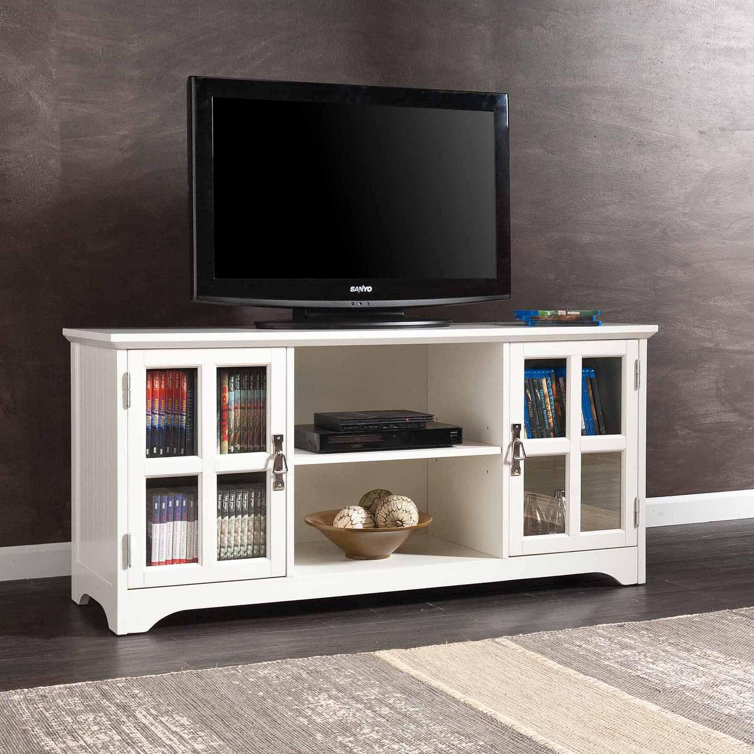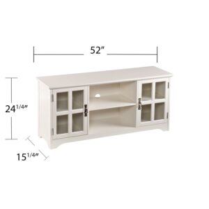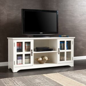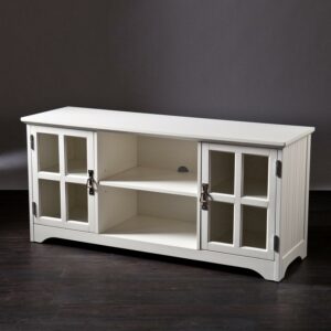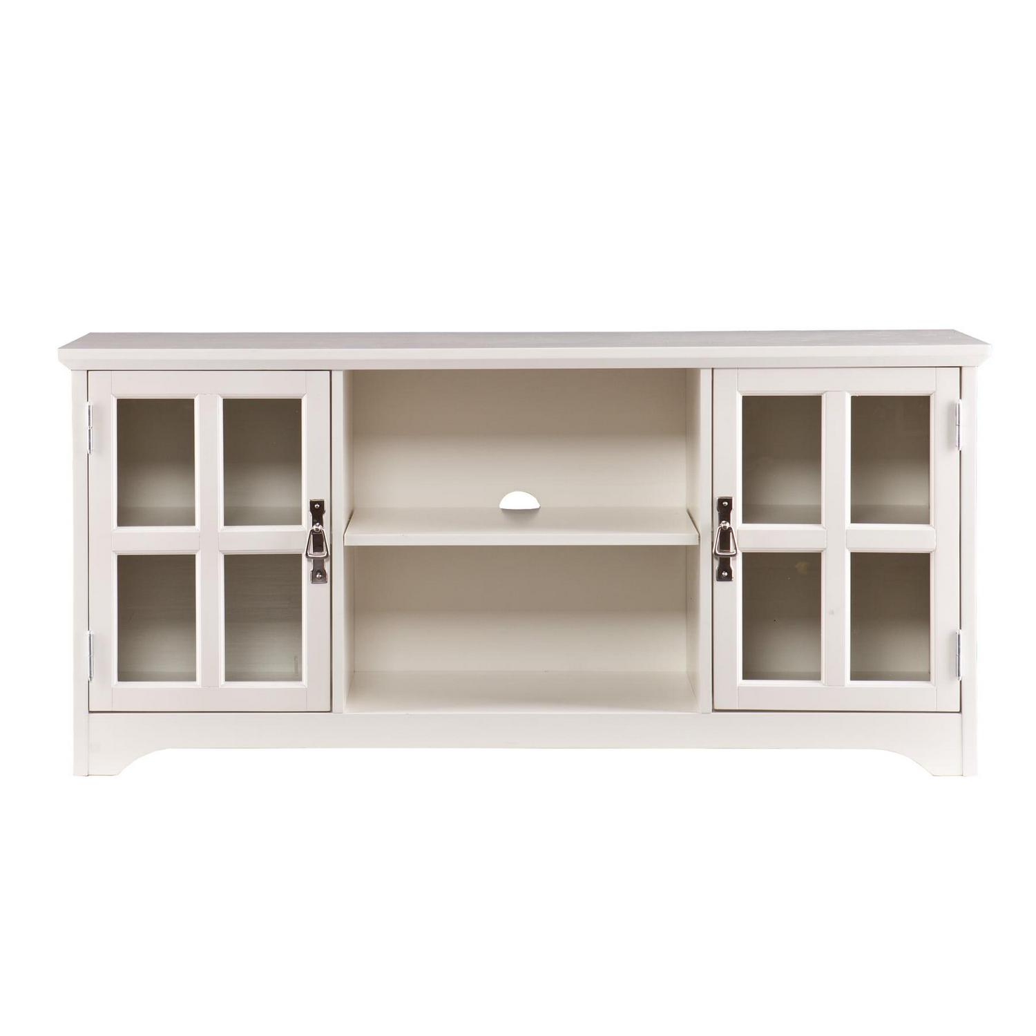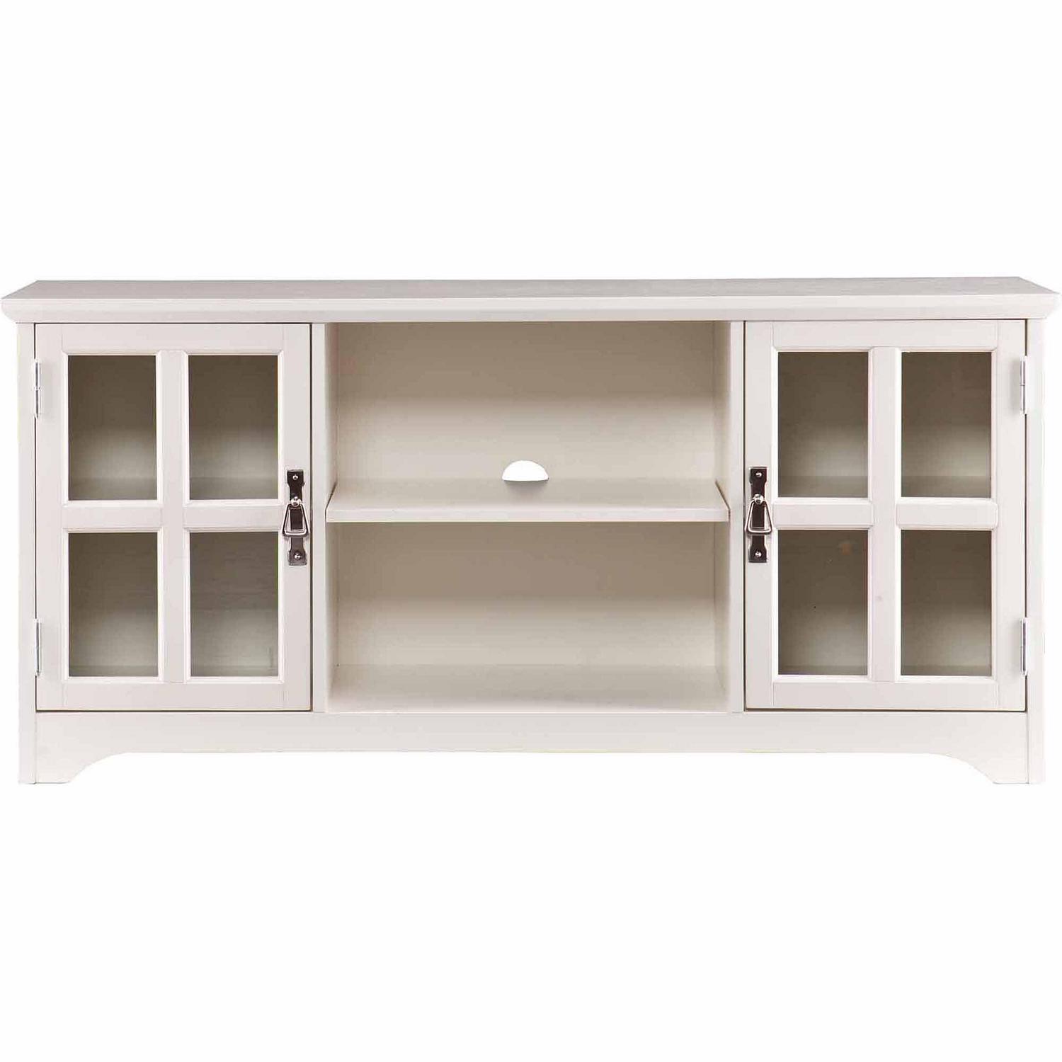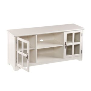 – White media stand includes 1 open center storage and 2 windowpane cabinets