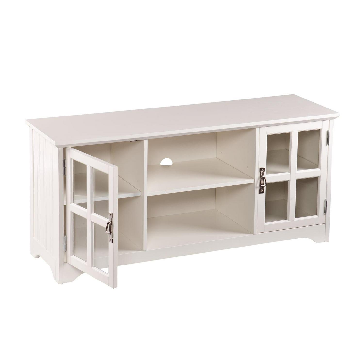 - White media stand includes 1 open center storage and 2 windowpane cabinets