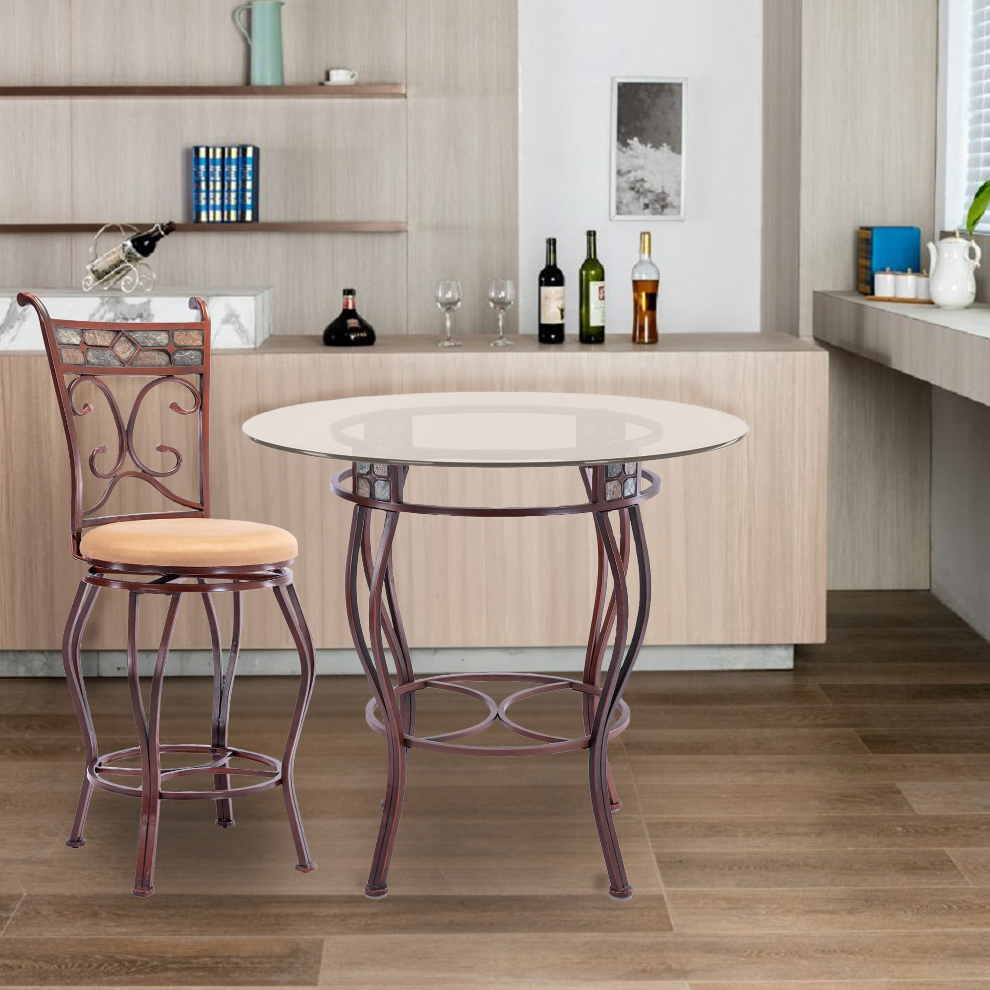 Beau 36″ Pub Table, Black/Gold: 36″ height 36″ tabletop diameter Beveled glass table top Sturdy metal frame Earth tone slate mosaic around table apron 2-toned black/gold color finish RTA construction Easy to assemble Matches perfectly with Boraam’s Beau swivel stools Contemporary circular glass top pub table All metal with Black and Gold hand-painted finish Choose counter-height or bar-height Attractive slate inlays on skirt French curve legs with foot ring Assembles easily 36 inch diameter table top Choose 36 or 42 inch height for bar or counter Not intended for commercial use